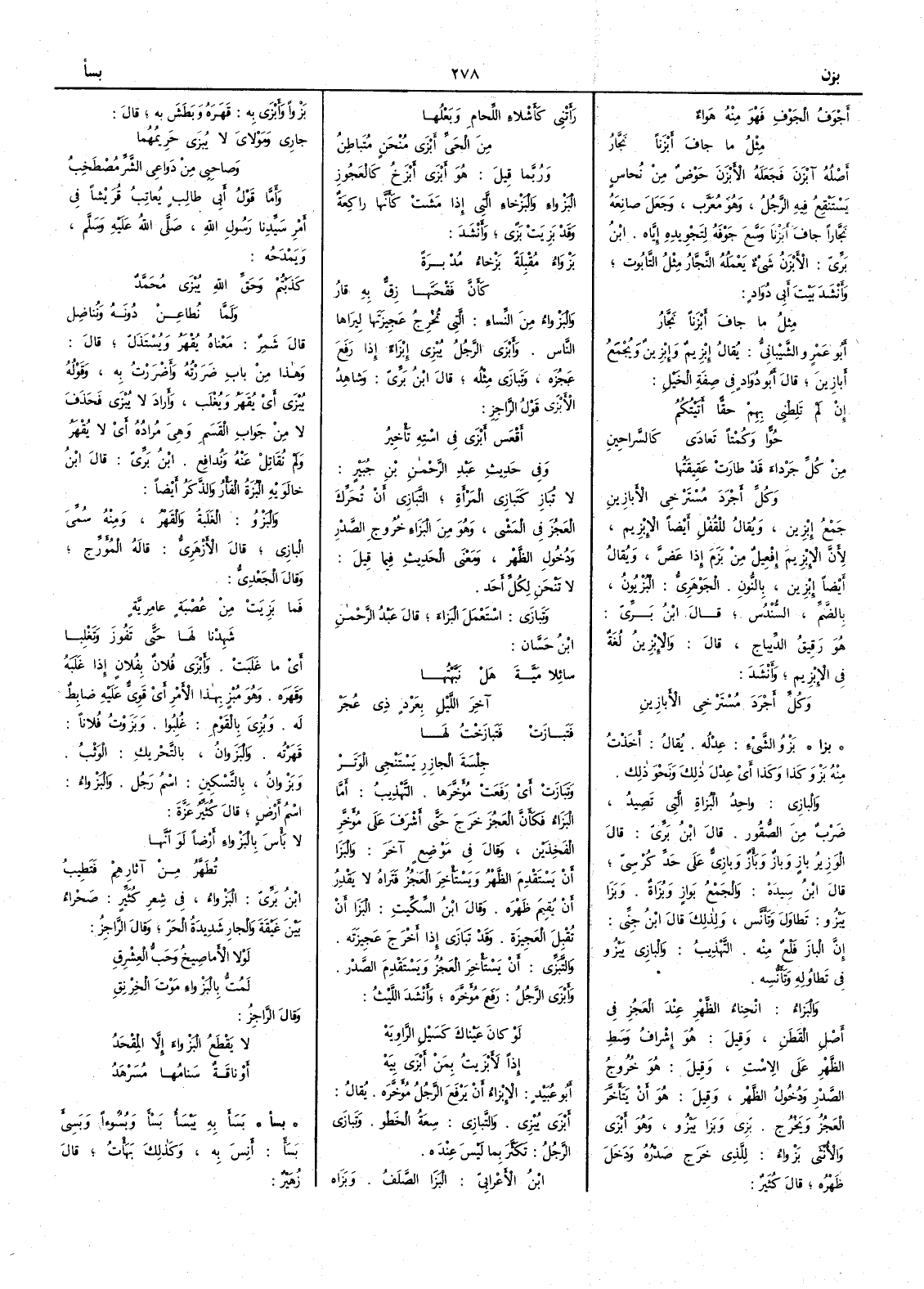 ( بزا ) بَزْوُ الشيء عِدْلُه يقال أَخذت منه بَزْوَ كذا وكذا أَي عِدْلَ ذلك ونحو ذلك والبازي واحد البُزاةِ التي تَصِيدُ ضَربٌ من الصُّقور قال ابن بري قال الوزير بازٍ وبَأْزٌ وبازِيّ على حدّ كرسيّ قال ابن سيده والجمع بَوازٍ وبُزَاةٌ وبَزَا يَبْزُو تَطاوَلَ وتَأَنَّسَ ولذلك قال ابن جني إن الباز فَلْعٌ منه التهذيب والبازِي يَبْزُو في تَطاوُله وتأَنُّسِه والبَزاءُ إنحناء الظَّهْرِ عند العَجُزِ في أَصل القَطَنِ وقيل هو إشرافُ وَسَطِ الظهر على الاسْتِ وقيل هو خروج الصدر ودخول الظهر وقيل هو أَن يتأَخر العَجُز ويخرُج بَزِيَ وبَزا يَبْزُو وهو أَبْزَى والأُنثى بَزْواء للذي خرج صدره ودخل ظهره قال كثيِّر رَأَتْني كأَشْلاء اللِّحامِ وبَعْلُها من الحَيِّ أَبْزى مُنْحَنٍ مُتَباطِنُ وربما قيل هو أَبْزَى أَبْزَخ كالعجوز البَزواءِ والبَزْخاء التي إذا مشت كأَنها راكعة وقد بَزِيَتْ بَزىً وأَنشد بَزْوَاءُ مُقْبِلةً بَزْخاءُ مُدْبِرَةً كأَنَّ فَقْحَتَها زِقٌّ به قارُ والبَزْواءُ من النساء التي تُخْرِجُ عجيزتَها ليراها الناس وأَبْزَى الرجلُ يُبْزِي إبْزَاءً إذا رفع عَجُزَه وتَبازَى مثله قال ابن بري وشاهد الأَبْزَى قول الراجز أَقْعَس أَبْزَى في اسْتِه تأْخيرُ وفي حديث عبد الرحمن بن جُبَير لا تُبازِ كتَبازِي المرأَةِ التَّبَازي أَن تحرك العَجُز في المشي وهو من البَزَاء خروج الصدر ودخول الظهر ومعنى الحديث فيما قيل لا تَنْحَنِ لكل أَحد وتَبازَى استعمل البَزاءَ قال عبد الرحمن بن حسان سائلا مَيَّةَ هل نَبَّهْتُها آخِرَ الليلِ بعَرْدٍ ذي عُجَرْ فتَبازَتْ فتَبازَخْتُ لها جِلْسةَ الجازِرِ يَسْتَنْجِي الوَتَرْ وتَبَازَتْ أَي رَفَعَتْ مُؤَخِّرها التهذيب أَما البَزَاءُ فكأَنَّ العَجُز خرج حتى أَشرف على مؤَخر الفخذين وقال في موضع آخر والبَزَا أَن يَسْتَقْدِم الظهرُ ويستأْخر العَجُزُ فتراه لا يقدر أَن يقيم ظهره وقال ابن السكيت البَزَا أَن تُقْبِلَ العَجيزة وقد تَبَازَى إذا أَخرج عجيزته والتَّبَزِّي أَن يستأْخر العجز ويستقدم الصدر وأَبزى الرجلُ رفع مُؤخَّرَه وأَنشد الليث لو كان عَيناك كَسَيْلِ الراويه إذاً لأَبْزَيت بمَنْ أَبْزى بِيَهْ أَبو عبيد الإبْزاءُ أَن يَرْفَعَ الرجلُ مؤخره يقال أَبْزَى يُبْزِي والتَّبازِي سعَةُ الخَطْو وتَبازى الرجل تكثَّر بما ليس عنده ابن الأَعرابي البَزَا الصَّلَفُ وبَزَاه بَزْواً وأَبْزَى به قَهَرَه وبَطَش به قال جارِي ومَوْلايَ لا يُبْزَى حَرِيمُهُما وصاحبِي من دَواعِي الشَّرِّ مُصْطَخِبُ وأَما قول أَبي طالب يعاتب قريشاً في أَمر سيدنا رسول الله صلى الله عليه وسلم ويمدحه كذَبْتُم وحَقِّ اللهِ يُبْزَى محمدٌ ولما نُطاعِنْ دُونه ونُناضِل قال شمر معناه يُقْهَر ويُسْتَذَلّ قال وهذا من باب ضَرَرْتُه وأَضْرَرْتُ به وقوله يُبْزَى أَي يُقْهر ويغلب وأَراد لا يُبْزَى فحذف لا من جواب القسم وهي مراده أَي لا يقهر ولم نُقاتل عنه ونُدافع ابن بري قال ابن خالويه البُزَةُ الفأْر والذَّكَرُ أَيضاً والبَزْوُ الغَلَبةُ والقَهْرُ ومنه سمي البازي قال الأَزهري قاله المؤرخ وقال الجَعْديّ فما بزَيَتْ من عُصْبَةٍ عامِرِيَّةٍ شَهِدْنا لها حتَّى تَفُوزَ وتَغْلِبا أَي ما غَلَبَتْ وأَبْزَى فلان بفلان إذا غَلبه وقهره وهو مُبْزٍ بهذا الأَمر أَي قويٌّ عليه ضابط له وبُزِيَّ بالقوم غُلِبُوا وبَزَوْتُ فلاناً قهرته والبَزَوانُ بالتحريك الوَثْبُ وبَزْوانُ بالتسكين اسم رجل والبَزْواء اسم أَرض قال كثيِّر عزة لا بَأْس بالبَزْواءِ أَرْضاً لو أنَّها تُطَهَّرُ من آثارِهم فَتَطِيبُ ابن بري البَزْواء في شعر كثير صحراء بين غَيْقَةَ والجار شديدة الحرّ وقال الراجز لولا الأَماصِيخُ وحَبُّ العِشْرِقِ لَمُتّ بالبَزْواء مَوَْتَ الخِرْنِقِ وقال الراجز لا يَقْطَعُ البَزْواءَ إلا المِقْحَدُ أَو ناقةٌ سَنامُها مُسَرْهَدُ
