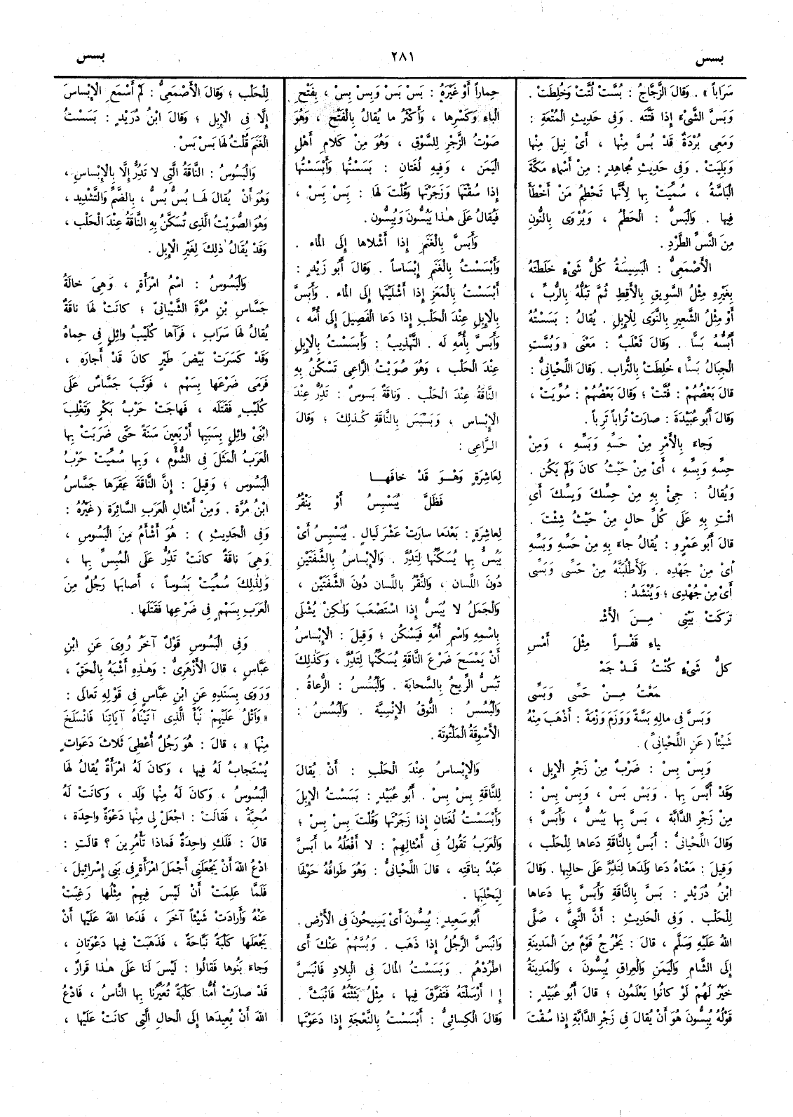 سراباً وقال الزجاج بُسَّتْ لُتَّتْ وخلطت وبَسَّ الشيءَ إِذا فَتَّتَه وفي حديث المتعة ومعي بُرْدَةٌ قد بُسَّ منها أَي نيلَ منها وبَلِيَتْ وفي حديث مجاهد من أَسماء مكة البَاسَّةُ سميت بها لأَنها تَحْطِمُ من أَخطأَ فيها والبَسُّ الحَطْمُ ويروى بالنون من النَّسِّ الطرد الأَصمعي البَسيسَة كل شيء خلطته بغيره مثل السويق بالأَقط ثم تَبُلُّه بالرُّبِّ أَو مثل الشعير بالنوى للإِبل يقال بَسَسْتُهُ أَبُسُّه بَسّاً وقال ثعلب معنى وبُسَّت الجبال بسّاً خلطت بالتراب وقال اللحياني قال بعضهم فُتَّتْ وقال بعضهم سُوِّيتْ وقال أَبو عبيدة صارت تراباً تَرِباً وجاء بالأَمر من حَسِّه وبَسِّه أَي من حيث كان ولم يكن ويقال جئْ به من حِسِّك وبِسِّك أَي ائتِ به على كل حال من حيث شئت قال أَبو عمرو يقال جاء به من حَسِّه وبَسِّه أَي من جهده ولأَطلُبَنَّه من حَسِّي وبَسِّي أَي من جُهْدي وينشد ترَكَتْ بَيْتي من الأَشْ ياءِ قَفْراً مثلَ أَمْسِ كلُّ شيءٍ كنتُ قد جَمَّ عْتُ من حَسِّي وبَسِّي وبَسَّ في ماله بَسَّةً ووَزَمَ وَزْمَةً أَذهب منه شيئاً عن اللحياني وبِسْ بِسْ ضرب من زجر الإِبل وقد أَبَّسَ بها وبَس بَسْ وبِسْ بِسْ من زجر الدابة بَسَّ بها يَبُسُّ وأَبَسَّ وقال اللحياني أَبَسَّ بالناقة دعاها للحلب وقيل معناه دعا ولدها لِتَدِرَّ على حالبها وقال ابن دريد بَسَّ بالناقة وأَبَسَّ بها دعاها للحلب وفي الحديث أَن النبي صلى اللَّه عليه وسلم قال يخرج قوم من المدينة إِلى الشام واليمن والعراق يُبِسُّون والمدينة خير لهم لو كانوا يعلمون قال أَبو عبيد قوله يُبِسُّون هو أَن يقال في زجر الدابة إِذا سُقْتَ حماراً أَو غيره بَسْ بَسْ وبِسْ بِسْ بفتح الباء وكسرها وأَكثر ما يقال بالفتح وهو صوت الزجر للسَّوْق وهو من كلام أَهل اليمن وفيه لغتان بَسَسْتُها وأَبْسَسْتُها إِذا سُقْتَها وزجَرْتها وقلت لها بِسْ بِسْ فيقال على هذا يَبُسُّون ويُبِسِّون وأَبَسَّ بالغنم إِذا أَسْلاها إِلى الماء وأَبْسَسْتُ بالغنم إِبْسَاساً وقال أَبو زيد أَبْسَسْتُ بالمَعَز إِذا أَشلَيْتَها إِلى الماء وأَبَسَّ بالإِبل عند الحلب إِذا دعا الفصيل إِلى أُمه وأَبَسَّ بأُمه له التهذيب وأَبْسَسْتُ بالإِبل عند الحلب وهو صُويْتُ الراعي تسكن به الناقة عند الحلب وناقة بَسُوسٌ تَدِرُّ عند الإِبْساس وبَسْبَسَ بالناقة كذلك وقال الراعي لعَاشِرَةٍ وهو قد خافَها فَظَلَّ يُبَسْبِسُ أَو يَنْقُر لعاشرة بعدما سارت عشر ليال يُبَسْبِسُ أَي يَبُسُّ بها يسكنها لتَدِرَّ والإِبْساسُ بالشفتين دون اللسان والنقر باللسان دون الشفتين والجمل لا يُبَسُّ إِذا استصعب ولكن يُشْلَى باسمه واسم أُمه فيسكن وقيل الإِبْساسُ أَن يمسح ضرع الناقة يُسَكِّنُها لتَدِرَّ وكذلك تَبُسُّ الريح بالسحابة والبُسُسُ الرُّعاة والبُسُسُ النُّوق الإِنْسِيَّة والبُسُسُ الأَسْوِقَةُ الملتوتة والإِبْساسُ عند الحلب أَن يقال للناقة بِسْ بِسْ أَبو عبيد بَسَسْتُ الإِبل وأَبْسَسْت لغتان إِذا زجرتها وقلت بِسْ بِسْ والعرب تقول في أَمثالهم لا أَفعله ما أَبَسَّ عبدٌ بناقته قال اللحياني وهو طوافه حولها ليحلبها أَبو سعيد يُبِسُّون أَي يسيحون في الأَرض وانْبَسَّ الرجلُ إِذا ذهب وبُسَّهُمْ عنك أَي اطردهم وبَسَسْتُ المالَ في البلاد فانْبَسَّ إِذا أَرسلته فتفرق فيها مثل بَثَثْتُه فانْبَثَّ وقال الكسائي أَبْسَسْتُ بالنعجة إِذا دعوتها للحلب وقال الأَصمعي لم أَسمع الإِبْساسَ إِلا في الإِبل وقال ابن دريد بَسَسْتُ الغنم قلت لها بَسْ بَسْ والبَسُوسُ الناقة التي لا تَدِرُّ إِلا بالإِبْساسِ وهو أشن يقال لها بُسُّ بُسُّ بالضم والتشديد وهو الصُّوَيْتُ الذي تُسَكَّنُ به الناقةُ عند الحلب وقد يقال ذلك لغير الإِبل والبَسُوسُ اسم امرأَة وهي خالة جَسَّاس بن مُرَّة الشَّيْباني كانت لها ناقة يقال لها سَرَابِ فرآها كُلَيْبُ وائلٍ في حِماه وقد كَسَرَتْ بَيْض طير كان قد أَجاره فَرَم