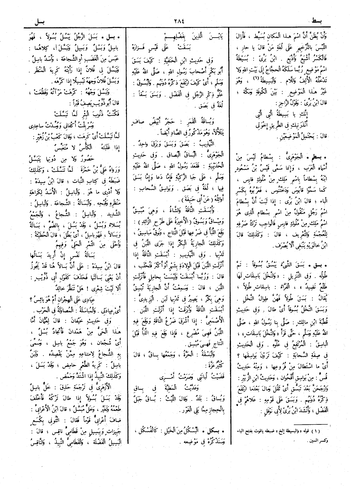 وأَن يظن أَن اسم هذا المكان بُسَيّط فأَزال اللبس بالترخيم على لغة من قال يا حارِ فالكسر أَشْيَعُ وأَذْيَع ابن بري بُسَيْطةُ اسم موضع ربما سلكه الحُجّاج إِلى بيت اللّه ولا تدخله الأَلف واللام والبَسِيطةُ