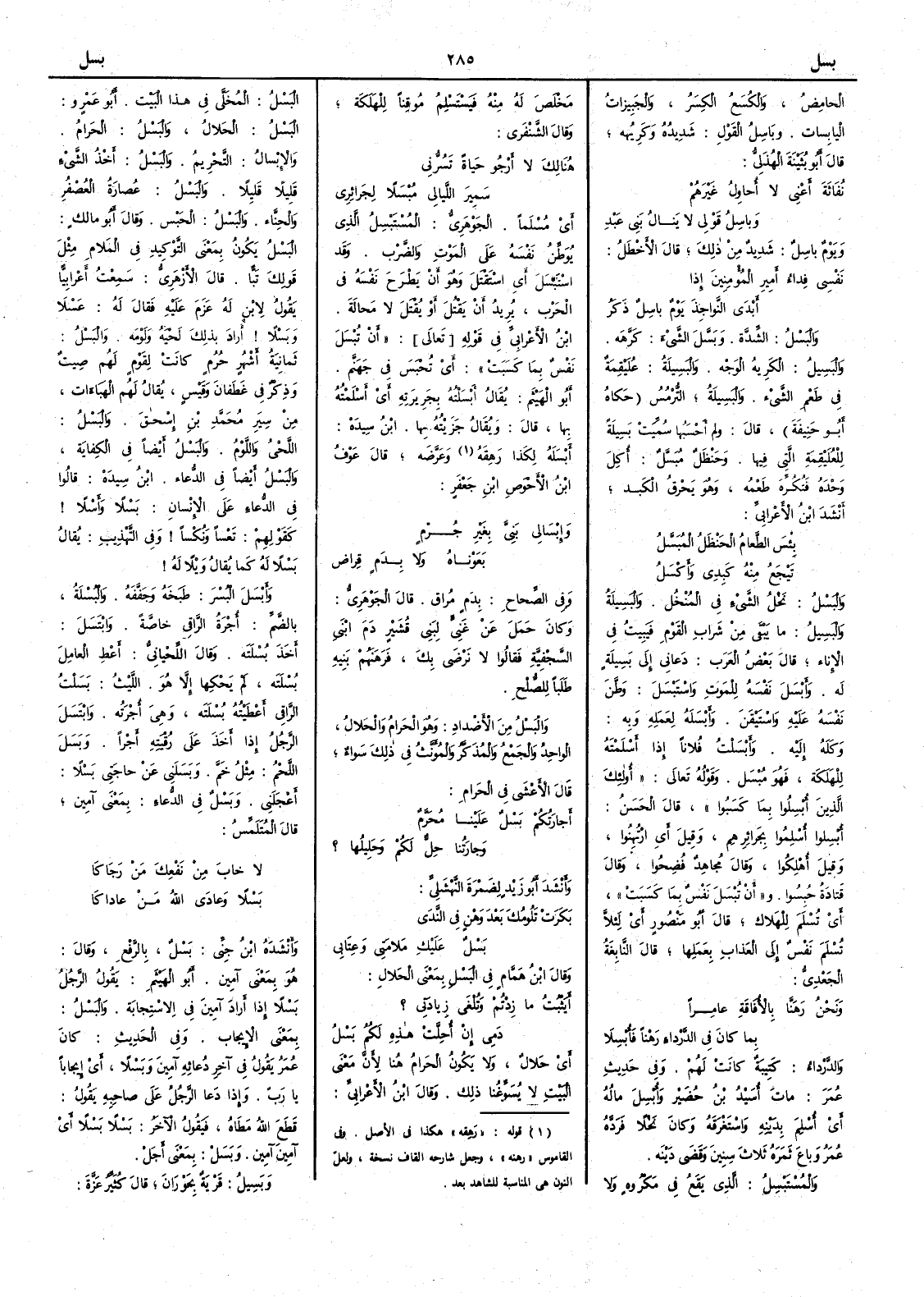 الحامض والكُسَعُ الكِسَرُ والجَبِيزات اليابسات وباسِلُ القول شَدِيدُه وكَرِيهه قال أَبو بُثَيْنَة الهُذَلي نُفَاثَةَ أَعْني لا أُحاول غيرهم وباسِلُ قولي لا ينالُ بني عَبْد ويوم باسل شديد من ذلك قال الأَخطل نَفْسِي فداءُ أَمير المؤْمنين إِذا أَبْدَى النواجِذَ يَوْمٌ باسِلٌ ذَكَرُ والبَسْل الشِّدّة وبَسَّلَ الشيءَ كَرَّهه والبَسِيل الكَريه الوجه والبَسِيلة عُلَيْقِمَة في طَعْم الشيء والبَسِيلة التُّرْمُس حكاه أَبو حنيفة قال وأَحسبها سميت بَسِيلة للعُلَيْقِمة التي فيها وحَنْظَلٌ مُبَسَّل أُكِل وحده فتُكُرِّه طَعْمُه وهو يُحْرِق الكَبِد أَنشد ابن الأَعرابي بِئْس الطَّعامُ الحَنْظل المُبَسَّلُ تَيْجَع منه كَبِدِي وأَكْسَلُ والبَسْلُ نَخْل الشيء في المُنْخُل والبَسِيلة والبَسِيل ما يبقى من شراب القوم فيبيت في الإِناء قال بعض العرب دعاني إِلى بَسِيلة له وأَبْسَل نَفْسَه للموتِ واسْتَبْسَل وَطَّن نفسه عليه واسْتَيْقَن وأَبْسَله لعمله وبه وَكَلَه إِليه وأَبْسَلْت فلاناً إِذا أَسلمتَه للهَلَكة فهو مُبْسَل وقوله تعالى أُولئك الذين أُبْسِلوا بما كسبوا قال الحسن أُبْسِلوا أُسلِموا بجَرائرهم وقيل أَي ارْتُهِنوا وقيل أُهلِكوا وقال مجاهد فُضِحوا وقال قتادة حُبِسوا وأَن تُبْسَل نفس بما كسَبَت أَي تُسْلَم للهلاك قال أَبو منصور أَي لئلا تُسْلم نفس إِلى العذاب بعَملها قال النابغة الجعدي ونَحْن رَهَنَّا بالأُفَاقَةِ عامراً بما كان في الدَّرْداءِ رهناً فأُبْسِلا والدَّرْداء كَتيبة كانت لهم وفي حديث عمر مات أُسَيْد بن حُضَيْر وأُبْسِل ماله أَي أُسْلِم بدَيْنِه واسْتَغْرَقه وكان نَخْلاً فردّه عُمَر وباع ثمره ثلاث سنين وقَضى دينه والمُسْتَبْسِل الذي يقع في مكروه ولا مَخْلَص له منه فيَسْتَسْلم مُوقِناً للهَلَكة وقال الشَّنْفَرَى هُنَالكَ لا أَرْجُو حَياةً تَسُرُّني سَمِيرَ الليَّالي مُبْسَلاً لجَرائري أَي مُسْلَماً الجوهري المُسْتَبْسِل الذي يُوَطِّن نَفسه على الموت والضرب وقد اسْتَبْسَل أَي اسْتَقْتَل وهو أَن يطرح نفسه في الحرب يريد أَن يَقْتل أَو يُقْتَل لا محالة ابن الأَعرابي في قوله أَن تُبسل نفس بما كسَبت أَي تُحْبَس في جهنم أَبو الهيثم يقال أَبْسَلْته بجَرِيرته أَي أَسْلمته بها قال ويقال جَزَيْته بها ابن سيده أَبْسَله لكذا رَهِقه وعَرَّضه قال عَوْف بن الأَحوص بن جعفر وإِبْسَالي بَنِيَّ بغير جُرْمٍ بَعَوْناه ولا بِدَمٍ قِراض وفي الصحاح بدم مُراق قال الجوهري وكان حمل عن غَنِيٍّ لبني قُشَير دَم ابْني السجفية فقالوا لا نرضى بك فرهنهم بَنِيه طلباً للصلح والبَسْل من الأَضداد وهو الحَرام والحَلال الواحد والجمع والمذكر والمؤنث في ذلك سواء قال الأَعْشَى في الحرام أَجارَتُكم بَسْلٌ علينا مُحَرَّمٌ وجارَتُنا حِلٌّ لَكُم وحَلِيلُها ؟ وأَنشد أَبو زيد لضَمْرة النهشليّ بَكَرَتْ تَلُومُك بَعْدَ وَهْنٍ في النَّدَى بَسْلٌ عَلَيْكِ مَلامَتي وعِتَابي وقال ابن هَمَّام في البَسْل بمعنى الحَلال أَيَثْبُت ما زِدْتُمْ وتُلْغَى زِيادَتي ؟ دَمِي إِنْ أُحِلَّتْ هذه لَكُمُ بَسْلُ أَي حَلال ولا يكون الحرام هنا لأَن معنى البيت لا يُسَوِّغُنا ذلك وقال ابن الأَعرابي البَسْل المُخَلَّى في هذا البيت أَبو عمرو البَسْل الحلال والبَسْل الحرام والإِبْسال التحريم والبَسْل أَخْذ الشيء قليلاً قليلاً والبَسْل عُصارة العُصْفُر والحِنَّاء والبَسْل الحَبْس وقال أَبو مالك البسل يكون بمعنى التوكيد في المَلام مثل قولِك تَبًّا قال الأَزهري سمعت أَعرابيّاً يقول لابن له عَزَم عليه فقال له عَسْلاً وبَسْلاً أَراد بذلك لَحْيَه ولَومَه والبَسْل ثمانية أَشهر حُرُمٍ كانت لقوم لهم صِيتٌ وذِكْر في غَطَفان وقيس يقال لهم الهَبَاءَات من سِيَرِ محمد بن إِسحق والبَسْل اللَّحيُ واللَّوْمُ والبَسْل أَيضاً في الكِفاية والبَسْل أَيضاً في الدعاء ابن سيده قالوا في الدعاء على ا