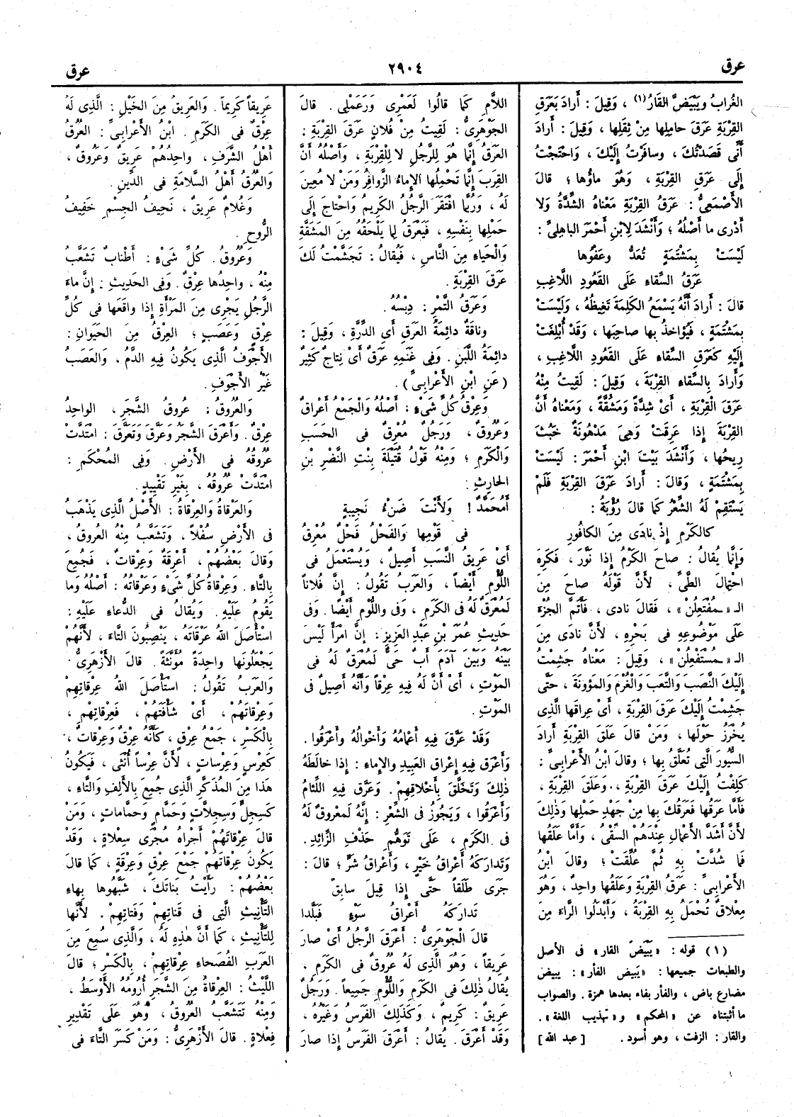 الغُرابُ ويَبيضَ الفأْر وقيل أَراد بعَرقِ القربة عَرَقَ حامِلها من ثِقَلها وقيل أَراد إِني قصدتك وسافرت إِليك واحتجت إِلى عَرَق القربة وهو ماؤها قال الأَصمعي عَرق القربة معناه الشدة ولا أَدري ما أَصله وأَنشد لابن أَحمر الباهلي لَيْستْ بمَشْتَمةٍ تُعَدُّ وعَفْوُها عَرق السِّقاء على القَعود اللاَّغِبَ قال أَراد أَنه يسمع الكلمة تَغِيظه وليست بمشتمة فيُؤاخِذ بها صاحَبها وقد أُبْلَغتْ إِليه كعَرَق السقاء على القَعُود اللاغب وأَراد بالسقاء القربة وقيل لَقِيت منه عَرَقَ القربة أَي شدَّة ومشقة ومعناه أَن القربة إِذا عَرِقت وهي مدهونة خبُث ريحها وأَنشد بيت ابن أَحمر ليست بمشتمة وقال أَراد عَرَقَ القربة فلم يستقم له الشعر كما قال رؤبة كالكَرْم إِذْ نادَى منَ الكافورِ وإِنما يقال صاحَ الكرمُ إِذا نوَّر فكَرِه احتمال الطيّ لأَن قوله صاح من ال مفتعلن فقال نادى فأَتمَّ الجزء على موضوعه في بحره لأَن نادى من ال مستفعلن وقيل معناه جَشِمْت إِليك النصَبَ والتعب والغُرْمَ والمؤونة حتى جَشِمْت إِليك عَرَقَ القربة أَي عِراقها الذي يُخْرَزُ حولها ومن قال عَلَقَ القربة أَراد السيور التي تعلَّق بها وقال ابن الأََعرابي كَلِفْت إِليك عَرَقَ القربة وعَلَق القربة فأَما عَرَقُها فعَرَقُك بها عن جَهْد حَمْلِها وذلك لأَن أَشدّ الأَعمال عندهم السَّقْيُ وأَما علقها فما شُدَّت به ثم عُلِّقت وقال ابن الأَعرابي عَرَقُ القربة وعَلَقُها واحد وهو مِعْلاق تحمل به القربة وأَبدلوا الراء من اللام كما قالوا لعَمْري ورَعَمْلي قال الجوهري لَقيت من فلان عَرَق القربة العَرَقُ إِنما هو للرجل لا للقربة وأَصله أَن القِرَبَ إِنما تْحمِلها الإِماءُ الزوافر ومَنْ لا مُعِين له وربما افتقر الرجل الكريم واحتاج إِلى حملها بنفسه فيَعْرَقُ لما يلحقه من المشقة والحياء من الناس فيقال تجشَّمْت لك عَرَقَ القربة وعَرَقُ التمر دِبْسه وناقة دائمة العَرَقِ أَي الدِّرَّة وقيل دائمة اللبن وفي غنمه عَرَقٌ أَي نِتاج كثير عن ابن الأَعرابي وعِرْق كل شيء أَصله والجمع أَعْراق وعُروق ورجل مُعْرِقٌ في الحسب والكرم ومنه قول قُتَيْلة بنت النضر بن الحرث