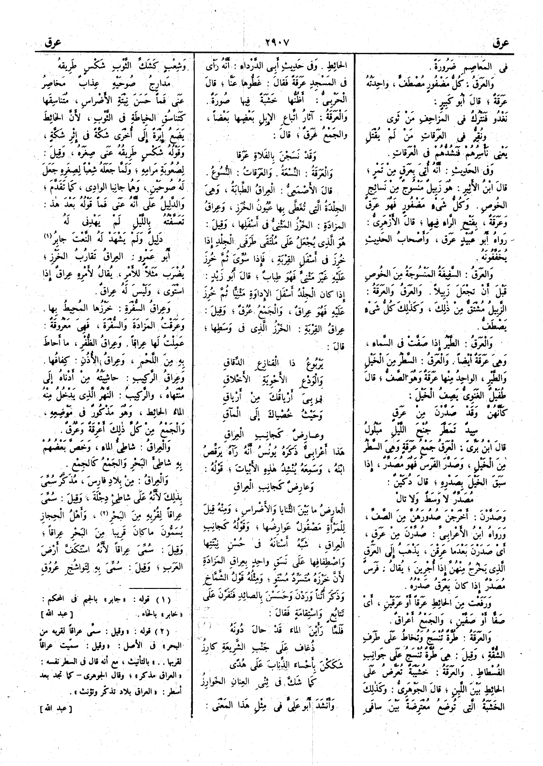 في المَعاصِمِ ضرورةً والعَرَقُ كل مضفورٍ مُصْطفّ واحدته عَرَقَةٌ قال أَبو كبير نَغْدُو فنَتْرك في المَزاحِف من ثَوى ونُقِرُّ في العَرَقاتِ من لم يُقْتَلِ يعني نأْسِرهم فنشدهم في العَرَقاتِ وفي حديث المظاهر أَنه أُتِيَ بعَرَقٍ من تمر قال ابن الأَثير هو زَبِيلٌ منسوج من نسائج الخُوص وكل شيء مضفورٍ فهو عَرَقٌ وعَرَقَة بفتح الراء فيهما قال الأَزهري رواه أَبو عبيد عَرَق وأَصحاب الحديث يخففونه والعَرَقُ السَّفِيفةُ المنسوجة من الخوص قبل أَن تجعل زَبِيلاً والعَرَقُ والعَرَقةُ الزَّبيل مشتق من ذلك وكذلك كل شيء يَصْطَفّ والعَرَقُ الطير إِذا صَفَّتْ في السماء وهي عَرَقة أَيضاً والعَرَقُ السطر من الخيلِ والطيرِ الواحد منها عَرَقة وهو الصف قال طفيل الغنوي يصف الخيل كأَنَّهُنَّ وقد صَدَّرْنَ من عَرَقٍ سِيدٌ تَمَطَّر جُنْحَ الليل مَبْلولُ قال ابن بري العَرَقُ جمع عَرَقَةٍ وهي السطر من الخيل وصَدَّرَ الفرسُ فهو مُصَدِّر إِذا سبق الخيل بصَدْره قال دكين مُصَدِّر لا وَسَط ولا تالْ وصَدِّرْنَ أَخرجن صُدُورهن من الصف ورواه ابن الأَعرابي صُدِّرْنَ من عَرَقٍ أَي صَدَرْن بعدما عَرِقْنَ يذهب إِلى العَرَق الذي يخرج منهن إِذا أُجرين يقال فرس مُصَدَّر إِذا كان يعرق صَدْرُه ورفعتُ من الحائط عَرَقاً أَو عَرَقَيْنِ أَي صفّاً أَو صفَّين والجمع أَعْراقٌ والعَرَقةُ طُرَّةٌ تنسج وتخاط في طرف الشُّقَّة وقيل هي طرة تنسج على جوانب الفُسْطاط والعَرَقةُ خشيبة تُعَرَّضُ على الحائط بين اللَّبِنِ قال الجوهري وكذلك الخشبة التي توضع مُعْتَرِضة بين سافَي الحائط وفي حديث أَبي الرداء أَنه رأَى في المسجد عَرَقَةً فقال غَطُّوها عنّا قال الحربي أَظنها خشبة فيها صورة والعَرَقةُ آثار اتباع الإِبل بعضها بعضاً والجمع عَرَقٌ قال وقد نَسَجْنَ بالفَلاة عَرَقا والعَرَقةُ النِّسْعةُ والعَرَقاتُ النُّسوع قال الأَصمعي العِراقُ الطِّبابَةُ وهي الجلدة التي تغطى بها عُيون الخُرَزِ وعِراقُ المزادة الخَرْز المَثْنِيّ في أَسفلها وقيل هو الذي يجعل على ملتقى طرفي الجلد إِذا خُرِزَ في أَسفل القربة فإِذا سوي ثم خُرِزَ عليه غير مَثْنِيّ فهو طِباب قال أَبو زيد إِذا كان الجلد أَسفل الإداوَةِ مَثْنيّاً ثم خرز عليه فهو عِراقٌ والجمع عُرُق وقبل عِراقُ القربة الخَرْز الذي في وسطها قال يَرْبوعُ ذا القَنازِع الدِّقاقِ والوَدْع والأَحْوِية الأَخْلاقِ بِي بِيَ أَرْياقكَ من أَرياقِ وحيث خُصيْاكَ إِلى المَآقِ وعارِض كجانب العِراقِ هذا أَعرابي ذكره يونس أَنه رآه يرقص ابنه وسمعه ينشد هذه الأَبيات قوله وعارض كجانب العِراقِ العارض ما بين الثنايا والأَضراس ومنه قيل للمرأَة مصقولٌ عوارضُها وقوله كجانب العِراقِ شبَّه أَسنانه في حسن نِبْتتها واصطفافها على نَسَقٍ واحد بِعِراقِ المزادة لأَن خَرْزَهُ مُتَسَرِّد مُسْتَوٍ ومثله قول الشماخ وذكر أُتُناً ورَدْنَ وحَسَسْنَ بالصائد فنفَرْن على تتابع واستقامة فقال فلما رأَينَ الماءَ قد حالَ دونَه ذُعاقٌ على جَنْبِ الشَّرِيعةِ كارِزُ شَكَكْنَ بأَحْساءَ الذِّنابَ على هُدًى كما شَكَّ في ثِنْي العِنانِ الخَوارزُ وأَنشد أَبو علي في مثل هذا المعنى وشِعْب كَشَكِّ الثوبِ شكْسٍ طَريقُهُ مَدارجُ صُوحَيْهِ عِذاب مَخاصِرُ عنى فَماً حسن نِبْتَة الأَضراس متناسقَها كتناسق الخياطة في الثوب لأَن الخائط يضع إِبرة إِلى أُخرى شَكّعة في إِثْرِ شَكَّةٍ وقوله شَكْسٍ طريقُه عنى صغره وقيل لصعوبة مرامه ولما جعله شِعْباً لصغره جعل له صُوحَيْن وهما جانبا الوادي كما تقدم والدليل على أَنه عنى فَماً قوله بعد هذا تَعَسَّفْتُه باللَّيْل لم يَهْدِني له دليلٌ ولم يَشْهَدْ له النَّعْتَ جابرُ أَبو عمرو العِراقُ تقارب الخَرْز يضرب مثلاً للأَمر يقال لأَمره عِراق إِذا استوى وليس له عِراقٌ وعِراقُ السُّفْرة خَرْزُها المحيط بها وعَرَقْت المزادة والسفرة فهي مَعْروقة عملت لها عِراقاً وعِراقُ ا