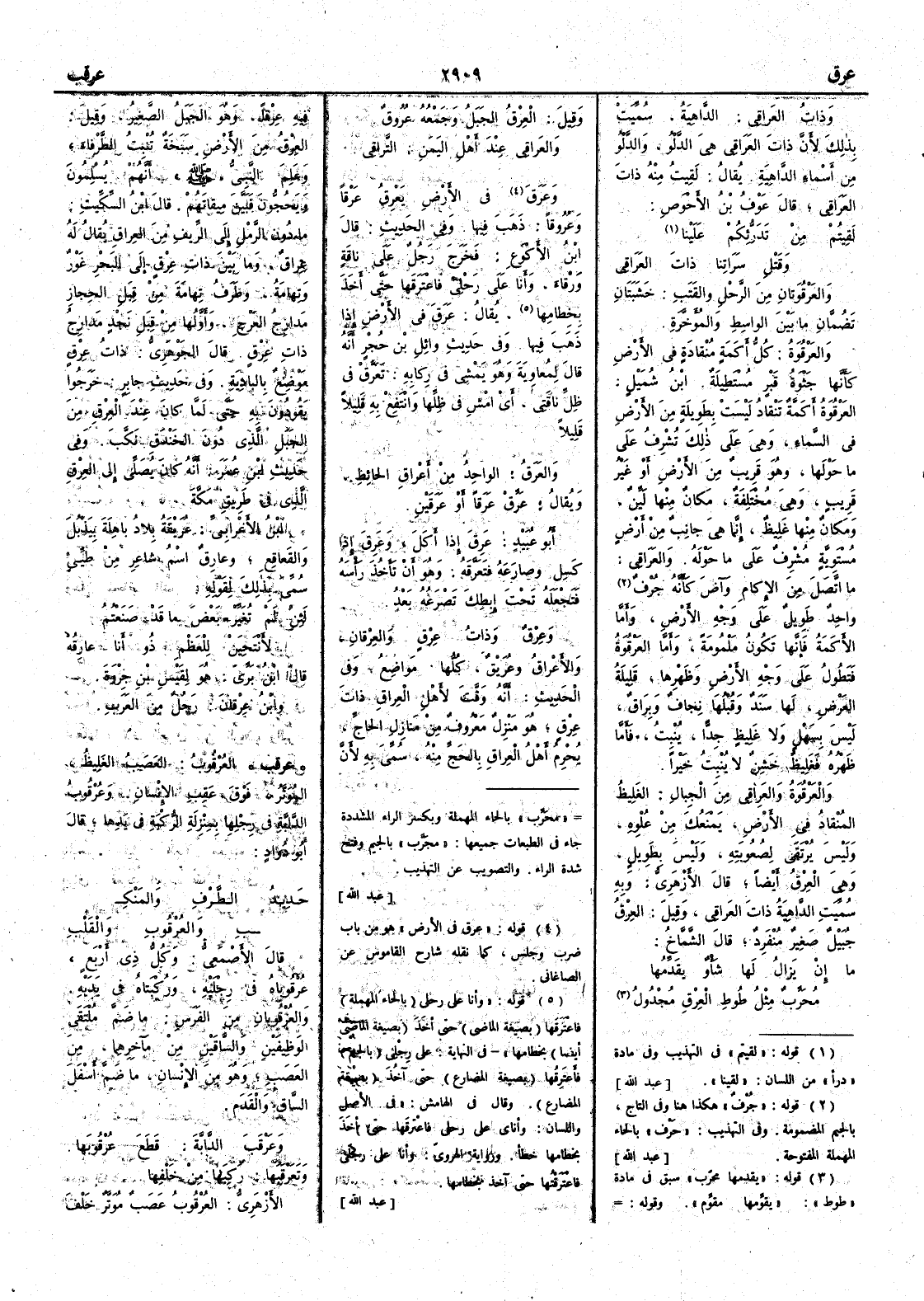 وذاتُ العَراقي الداهية سميت بذلك لأَن ذاتَ العَرَاقي هي الدلو والدلو من أَسماء الداهية يقال لقيت منه ذات العَرَاقي قال عوف بن الأَحوص لَقِيتُمْ من تَدَرُّئِكُمْ علينا وقَتْلِ سَرَاتِنا ذاتَ العَراقي والعَرْقُوَتانِ من الرَّحْل والقَتَب خشبتان تضمان ما بين الواسط والمُؤَخَّرةِ والعَرْقُوَةُ كل أَكَمة منقادة في الأَرض كأَنها جَثْوةُ قبر مستطيلة ابن شميل العَرْقُوَة أَكمة تنقاد ليست بطويلة من الأَرض في السماء وهي على ذلك تشرف على ما حولها وهو قريب من الأَرض أَو غير قريب وهي مختلفة مكانٌ منها ليّن ومكانٌ منها غليظ وإِنما هي جانب من أَرض مستوية مشرف على ما حوله والعَرَاقي ما اتصل من الإِكامِ وآضَ كأَنه جُرْف واحد طويل على وجه الأَرض وأَما الأَكمة فإِنها تكون مَلْمُومة وأَما العَرْقُوَةُ فتطول على وجه الأَرض وظهرها قليلة العرض لها سَنَد وقبلها نِجاف وبِرَاق ليس بسَهْل ولا غليظ جداًّ يُنْبِت فأَما ظهره فغليظ خَشِنٌ لا يُنْبتُ خَيراً والعَرْقُوَةُ والعَراقي من الجبال الغليظُ المنقاد في الأَرض يمنعك من عُلْوِهِ وليس يُرتَقى لصعوبته وليس بطويل وهي العِرْقُ أَيضاً قال الأَزهري وبه سمِّيت الداهية ذات العَراقي وقيل العِرْق جُبَيْل صغير منفرد قال الشماخ ما إِنْ يَزال لها شَأْوٌ يقَدِّمُها مُجَرَّبٌ مثل طُوطِ العِرْقِ مَجْدول وقيل العِرْقُ الجبل وجمعه عُرُوق والعَراقي عند أَهل اليمن التَّراقي وعَرَقَ في الأَرض يَعْرِقُ عَرْقاً وعرُوقاً ذهب فيها وفي الحديث قال ابن الأَكْوَعِ فخرج رجل على ناقة وَرْقاءَ وأَنا على رَحْلي فاعْتَرَقَها حتى أَخَذَ بِخطامها يقال عَرَقَ في الأَرض إِذا ذهب فيها وفي حديث وائل بن حجر أَنه قال لمعاوية وهو يمشي في ركابه تَعَرَّقْ في ظل ناقتي أَي امش في ظلها وانتفع به قليلاً قليلاً والعَرَقُ الواحد من أَعْرَاق الحائط ويقال عَرِّقْ عَرَقاً أَو عَرَقين أَبو عبيد عَرِقَ إِذا أَكل وعَرِقَ إِذا كسل وصارَعَهُ فتَعَرَّقَهُ وهو أَن تأْخذ رأْسه فتجعله تحت إِبطك تصرعه بعد وعِرْقٌ وذات عِرْق والعِرْقانِ والأَعْراق وعُرَيْقٌ كلها مواضع وفي الحديث أَنه وَقَّت لأهل العِراق ذات عِرْقٍ هو منزل معروف من منازل الحاجِّ يُحْرِمُ أَهل العِراق بالحج منه سمِّي به لأَن فيه عِرْقاً وهو الجبل الصغير وقيل العِرْقُ من الأَرض سَبَخَة تنبت الطَّرْفاءَ وعلِم النبي صلى الله عليه وسلم أَنهم يُسْلمون ويَحُجُّون فبيَّن ميقاتهم قال ابن السكيت ما دون الرمل إِلى الريف من العِراقِ يقال له عِراقٌ وما بين ذاتِ عِرْقٍ إِلى البحر غَوْرٌ وتِهامةُ وطَرَفُ تِهامةَ من قِبَل الحجاز مدارج العَرْج وأَولها من قِبَلِ نَجْدٍ مدارج ذات عِرْقٍ قال الجوهري ذات عِرْقٍ موضع بالبادية وفي حديث جابر خرجوا يَقُودون به حتى لما كان عند العِرْقِ من الجبلِ الذي دون الخَنْدق نَكَّبَ وفي حديث ابن عمر أَنه كان يصلي إِلى العِرْقِ الذي في طريق مكة ابن الأَعرابي عُرَيْقة بلاد باهِلَةَ بِيَذْبُل والقَعاقِع وعارِقٌ اسم شاعر من طيِّءٍ سمي بذلك لقوله لَئِنْ لم تُغَيِّرْ بعض ما قد صَنَعْتُمُ لأَنْتَحِيَنْ للعظمِ ذُو أَنا عارِقُهْ قال ابن بري هو لقَيْس بن جِرْوَةَ وابن عِرْقانَ رجل من العرب