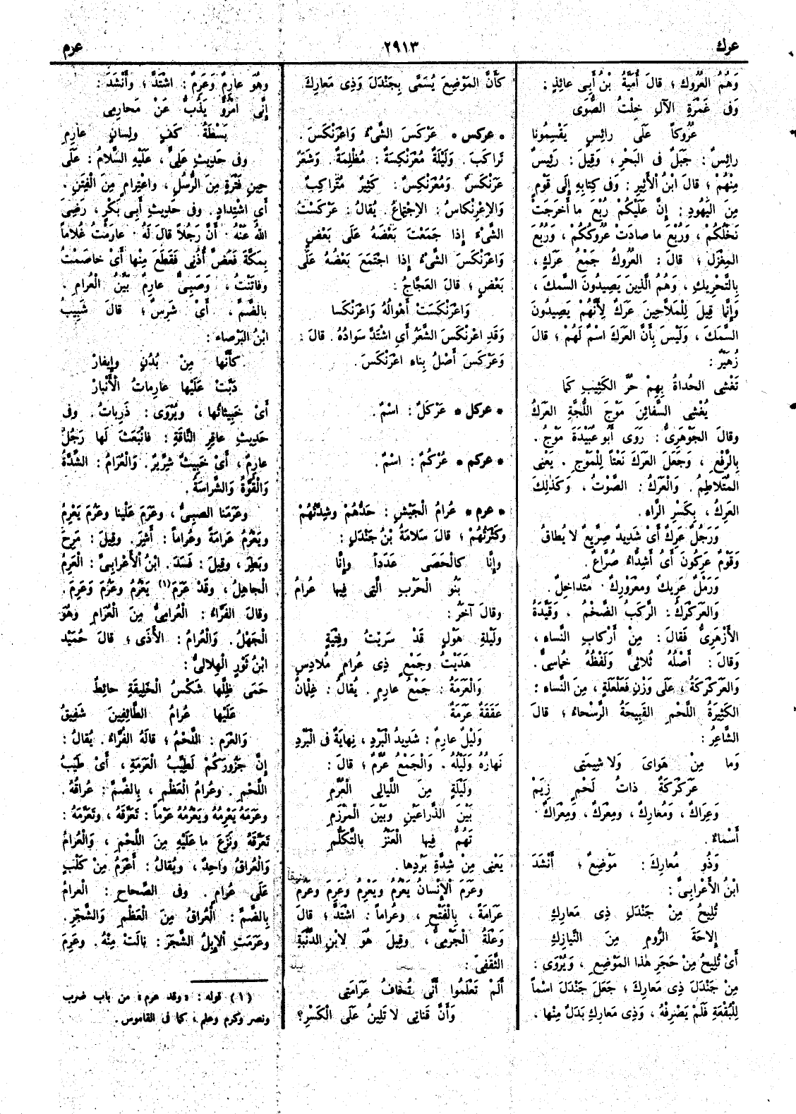 ( عركل ) عَرْكَلٌ اسم ( عركم ) عَرْكُم اسم ( عرم ) عُرامُ الجيشِ حَدُّهم وشِدَّتُهم وكَثرَتُهم قال سلامة بن جندل وإنا كالحَصى عَدداً وإنا بَنُو الحَرْبِ التي فيها عُرامُ وقال آخر وليلةِ هَوْلٍ قد سَرَيْتُ وفِتْيَةٍ هَدَيْتُ وجَمْعٍ ذي عُرامٍ مُلادِسِ والعَرَمة جمعُ عارمٍ يقال غِلمانٌ عَقَقةٌ عَرَمةٌ وليلٌ عارمٌ شديدُ البردِ نهايةٌ في البرْدِ نَهارُه وليلُه والجمع عُرَّمٌ قال وليلةٍ من اللَّيالي العُرَّمِ بينَ الذِّراعينِ وبين المِرْزَمِ تَهُمُّ فيها العَنْزُ بالتَّكَلُّمِ يعني من شدة بردها وعَرَمَ الإنسانُ يَعْرُمُ ويَعْرِمُ وعَرِمَ وعَرُمَ عَرامةً بالفتح وعُراماً اشتدَّ قال وعْلةُ الجَرْميُّ وقيل هو لابن الدِّنَّبة الثَّقَفي أَلم تعْلَمُوا أَني تُخافُ عَرَامَتي وأَنَّ قَناتي لا تَلِينُ على الكَسْرِ ؟ وهو عارمٌ وعَرِمٌ اشتَدَّ وأَنشد إني امْرُؤٌ يَذُبُّ عن مَحارمي بَسْطةُ كَفٍّ ولِسانٍ عارِمِ وفي حديث عليّ عليه السلام على حين فتْرَةٍ من الرُّسُل واعْتِرامٍ من الفِتَنِ أَي اشتدادٍ وفي حديث أَبي بكر رضي الله عنه أَن رجلاً قال له عارَمْتُ غُلاماً بمكَّةَ فعَضَّ أُذُني فقطعَ منها أَي خاصَمْتُ وفاتَنْتُ وصبيٌّ عارمٌ بيِّنُ العُرامِ بالضم أَي شَرِسٌ قال شَبِيب بنُ البَرْصاء كأَنَّها مِنْ بُدُنٍ وإيفارْ دَبَّتْ عليها عارماتُ الأَنْبارْ أَي خَبيثاتُها ويروى ذَرِبات وفي حديث عاقر الناقة فانبَعثَ لها رجلٌ عارِمٌ أَي خبيثٌ شِرِّيرٌ والعُرَامُ الشِّدَّةُ والقُوَّةُ والشَّراسةُ وعَرَمنا الصبيُّ وعَرَمَ علينا وعَرُمَ يَعْرِمُ ويَعْرُمُ عَرامةً وعُراماً أَشِرَ وقيل مَرِحَ وبَطِرَ وقيل فسَدَ ابن الأَعرابي العَرِمُ الجاهلُ وقد عَرَمَ يَعْرُمُ وعَرُمَ وعَرِمَ وقال الفراء العُرامِيُّ من العُرامِ وهو الجَهْلُ والعُرامُ الأَذى قال حُمَيْدُ ابنُ ثور الهِلاليُّ حَمَى ظِلَّها شَكْسُ الخَلِيقَةِ حائطٌ عَلَيْها عُرامُ الطائِفينَ شَفِيقُ والعَرَمُ اللَّحْم قاله الفراء إنَّ جزُورَكم لَطَيِّبُ العَرَمةِ أَي طَيّبُ اللَّحْم وعُرامُ العظم بالضم عُراقُهُ وعَرَمَهُ يَعْرِمُه ويَعْرُمه عَرْماً تَعَرَّقه وتَعَرَّمَه تَعَرَّقَه ونَزَع ما عليه من اللحم والعُرامُ والعُراقُ واحد ويقال أَعْرَمُ من كَلْبٍ على عُرامٍ وفي الصحاح العُرامُ بالضم العُراقُ من العَظْمِ والشجر وعَرَمَتِ الإبلُ الشَّجَرَ نالَتْ منه وعَرِمَ
