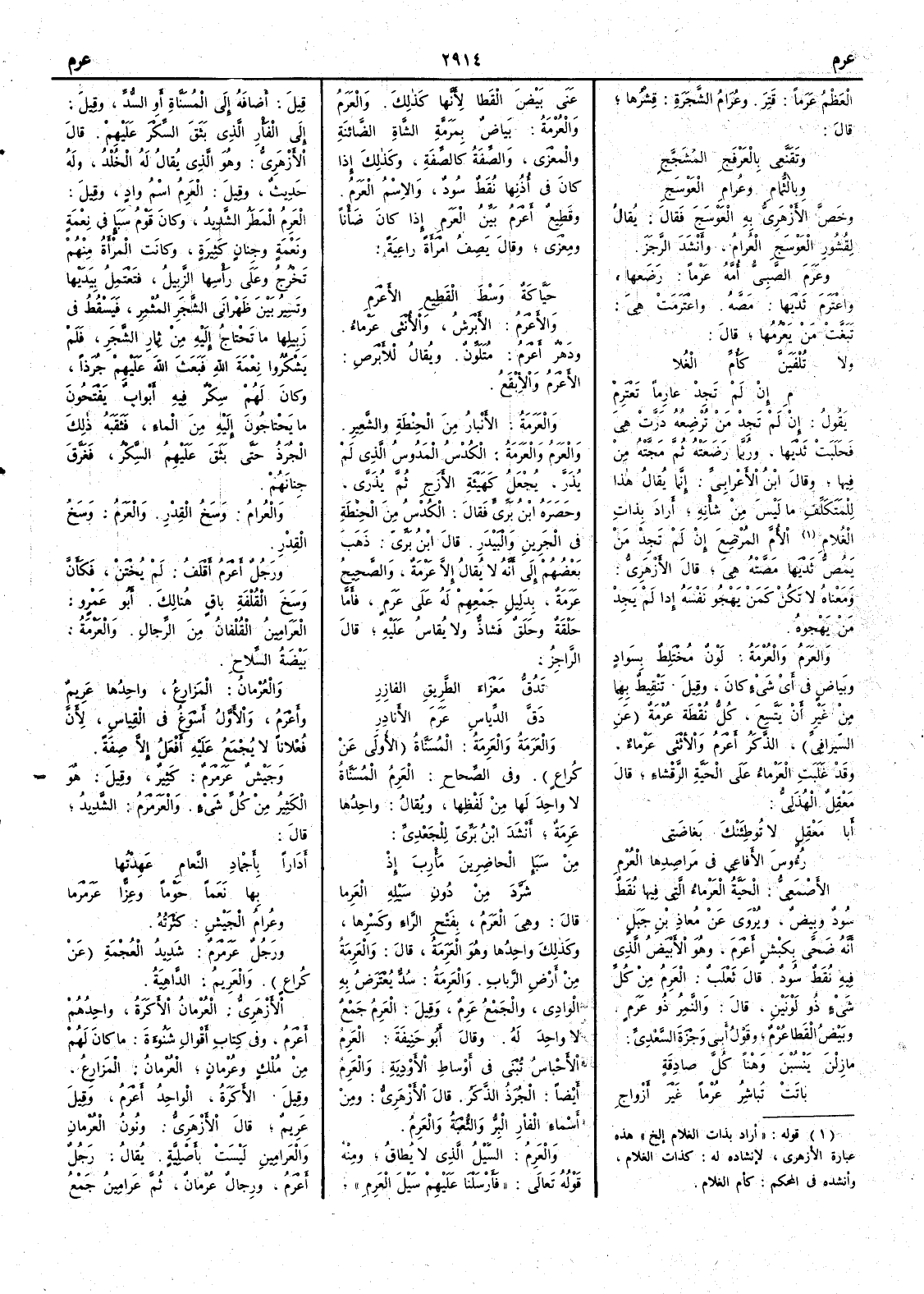 ( * قوله « أراد بذات الغلام إلخ » هذه عبارة الأَزهري لإنشاده له كذات الغلام وأنشده في المحكم كأم الغلام ) الأُمَّ المُرْضِعَ إن لم تَجِدْ من يَمُصُّ ثَدْيَها مَصَّتْه هي قال الأَزهري ومعناه لا تكن كمن يَهْجُو نَفْسَه إذا لم يَجِدْ من يَهْجُوه والعَرَمُ والعُرْمَةُ لونٌ مختلطٌ بسوادٍ وبياضٍ في أَيِّ شيء كان وقيل تَنْقِيطٌ بهما من غير أَن يَتَّسِعَ كُلُّ نُقطةٍ عُرْمةٌ عن السيرافي الذكرُ أَعْرَمُ والأُنثى عَرْماءُ وقد غَلَبَتِ العَرْماءُ على الحية الرَّقْشاءِ قال مَعْقِلٌ الهُذَليُّ أَبا مَعْقِلٍ لا تُوطِئَنْكَ بَغاضَتي رُؤُوسَ الأَفاعي في مَراصِدِها العُرْمِ الأَصمعي الحَيَّةُ العَرْماءُ التي فيها نُقَطٌ سودٌ وبيضٌ ويروى عن معاذ بن جبل أَنه ضَحَّى بكبشٍ أَعْرَمَ وهو الأَبيض الذي فيه نُقَطٌ سُود قال ثعلب العَرِمُ من كل شيء ذُو لَوْنَيْنِ قال والنَّمِرُ ذو عَرَمٍ وبَيْضُ القَطا عُرْمٌ وقول أَبي وَجْزَةَ السَّعْدِيِّ ما زِلْنَ يَنْسُبْنَ وَهْناً كُلَّ صادِقةٍ باتَتْ تُباشِرُ عُرْماً غَيْرَ أَزْواجِ عنى بَيْضَ القَطا لأَنها كذلك والعَرَمُ والعُرْمةُ بَياضٌ بِمَرَمَّةِ الشاةِ الضَّائِنةِ والمِعْزَى والصفةُ كالصفة وكذلك إذا كان في أُذُنها نُقَطٌ سُود والاسمُ العَرَمُ وقطيعٌ أَعْرَمُ بَيِّنُ العَرَمِ إذا كان ضَأْناً ومِعْزًى وقال يصف امرأَة راعية حَيَّاكة وَسْطَ القَطِيعِ الأَعْرَمِ والأَعْرَمُ الأَبْرَشُ والأُنثى عَرْماءُ ودَهْرٌ أَعْرَمُ مُتَلَوِّنٌ ويقال للأَبْرَصِ الأَعْرَمُ والأَبْقَعُ والعَرَمَةُ الأَنْبارُ من الحِنْطة والشعير والعَرَمُ والعَرَمَةُ الكُدْسُ المَدُوسُ الذي لم يُذَرَّ يجعل كهيئة الأَزَجِ ثم يُذَرَّى وحَصَرَه ابنُ برِّي فقال الكُدْسُ من الحنطة في الجَرِينِ والبَيْدَرِ قال ابن بري ذهب بعضُهم إلى أَنه لا يقال عَرْمَةٌ والصحيح عَرَمة بدليل جمعهم له على عَرَمٍ فأَما حَلْقَةٌ وحَلَقٌ فشاذ ولا يقاس عليه قال الراجز تَدُقُّ مَعْزَاءَ الطَّريقِ الفازِرِ دَقَّ الدِّياسِ عَرَمَ الأَنادِرِ والعَرَمَةُ والعَرِمَةُ المُسَنَّاةُ الأُولى عن كراع وفي الصحاح العَرِمُ المُسَنَّاة لا واحد لها من لفظها ويقال واحدها عَرِمَةٌ أَنشد ابن بري للجَعْدِيِّ مِنْ سَبإِ الحاضِرين مَأْرِبَ إذْ شَرَّدَ مِنْ دُون سَيْلهِ العَرِما قال وهي العَرم بفتح الراء وكسرها وكذلك واحدها وهو العَرَِمَةُ قال والعَرِمَةُ من أَرض الرَّبابِ والعَرِمَةُ سُدٌّ يُعْتَرَضُ به الوادي والجمع عَرِمٌ وقيل العَرِمُ جمعٌ لا واحد له وقال أَبو حنيفة العَرِمُ الأَحْباسُ تُبْنى في أَوْساط الأَوْدِيَةِ والعَرِمُ أَيضاً الجُرَذُ الذَّكَرُ قال الأَزهري ومن أَسماء الفأْر البِرُّ والثُّعْبَةُ والعَرِمُ والعَرِمُ السَّيْلُ الذي لا يُطاق ومنه قوله تعالى فأَرسلنا عليهم سَيْلَ العَرِمِ قيل أَضافه إلى المُسَنَّاة أَو السُّدِّ وقيل إلى الفأرِ الذي بَثَق السِّكْرَ عليهم قال الأَزهري وهو الذي يقال له الخُلْد وله حَدِيثٌ وقيل العَرِمُ اسم وادٍ وقيل العَرِمُ المطر الشديد وكان قومُ سَبأََ في نِعْمةٍ ونَعْمَةٍ وجِنانٍ كثيرة وكانت المرأَة منهم تَخْرُجُ وعلى رأسها الزَّبيلُ فتَعْتَمِلُ بيديها وتسير بين ظَهْرانَي الشَّجَر المُثْمِر فيَسْقُط في زَبيلِها ما تحتاج إِليه من ثمار الشجر فمل يَشْكُروا نِعْمَة الله فبَعَثَ اللهُ عليهم جُرَذاً وكان لهم سِكْرٌ فيه أَبوابٌ يَفْتَحون ما يَحْتاجُونَ إِليه من الماء فثَقَبه ذلك الجُرَذُ حتى بَثََقَ عليهم السِّكر فغَرَّقَ جِنانَهم والعُرامُ وسَخُ القِدْرِ والعَرَمُ وَسَخُ القِدْرِ ورجل أَعْرامُ أَقْلَفُ لم يُخْتَنْ فكأَنَّ وَسَخَ القُلْفَةِ باقٍ هنالك أَبو عمرو العَرَامِينُ القُلْفانُ من الرجال والعَرْمَةُ بَيْضَة السِّلاح والعُرْمانُ المَزارِعُ واحدها عَرِيمٌ وأَعْرَمُ والأَولُ أَسْوَغُ في القياس لأَن فُعْلاناً لا ي