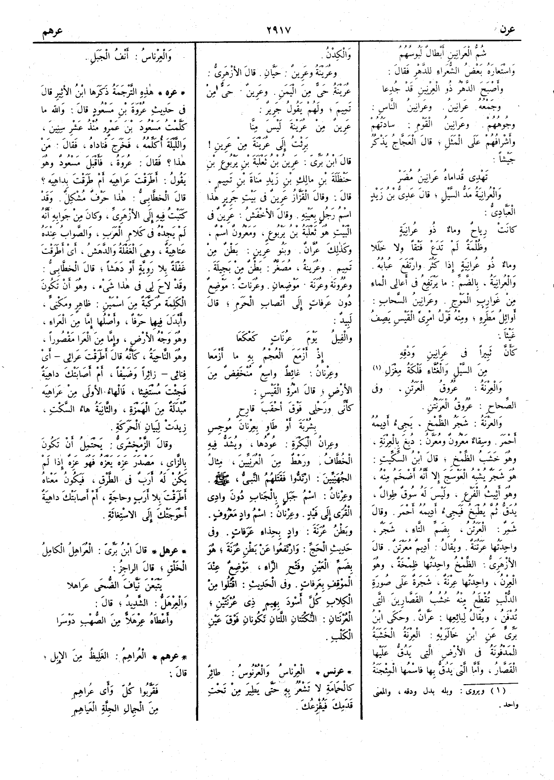 ( عرنس ) العِرْناسُ والعُرْنُوسُ طائر كالحمامة لا تَشْعُرُ به حتى يطيرَ من تحت قدمك فيفزعك والعِرْناسُ أَنْفُ الجبَل ( عره ) هذه الترجمة ذكرها ابن الأَثير قال في حديث عُرْوَةَ بن مسعود قال والله ما كَلَّمتُ مسعود ابن عمروٍ مُنْذُ عَشْر سنين والليلةَ أُكَلِّمُهُ فخرج فناداه فقال مَنْ هذا ؟ فقال عُرْوَةُ فأَقبلَ مسعود وهو يقول أَطَرَقْتَ عَراهِيَةً أَم طَرَقْتَ بِداهيةٍ ؟ قال الخطابي هذا حرف مشكل وقد كتبت فيه إلى الأَزهري وكان من جوابه أَنه لم يَجِدْهُ في كلام العرب والصواب عنده عَتاهِيَة وهي الغفلة والدَّهَشُ أَي أَطَرَقْتَ غَفْلَةً بلا رَوِيَّةٍ أَو دَهَشاً قال الخطابي وقد لاحَ لي في هذا شيءٌ وهو أَن تكون الكلمةُ مركبةٌ من اسمين ظاهرٍ ومَكْنِيٍّ وأَبدل فيهما حرفاً وأَصلها إِما مِنَ العَراءِ وهو وجه الأَرض وإِما من العَرا مقصوراً وهو الناحية كأَنه قال أَطَرَقْتَ عَرائي أَي فِنائي زائراً وضيفاً أَم أعصابتك داهيةٌ فجئتَ مستغيثاً فالهاء الأُولى من عَراهِيَةٍ مبدلةٌ من الهمزة والثانية هاء السكت زيدت لبيان الحركة وقال الزمخشري يحتمل أَن تكون بالزاي مصدرَ عَزِهَ يعْزَهُ فهو عَزِهٌ إِذا لم يكن له أَرَبٌ في الطَّرْقِ فيكون معناه أَطَرَقْتَ بلا أعرَبٍ وحاجةٍ أَم أَصابتْكَ داهيةٌ أَحْوَجَتْكَ إِلى الاستغاثةِ