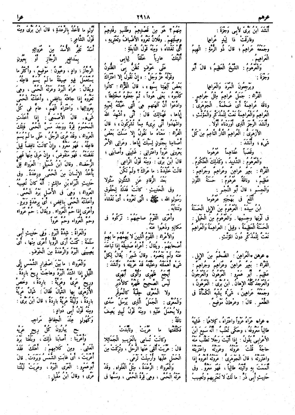 ( عرا ) عَرَاهُ عَرْواً واعْتَراه كلاهما غَشِيَه طالباً معروفه وحكى ثعلب أَنه سمع ابن الأَعرابي يقول إِذا أَتيْت رجُلاً تَطْلُب منه حاجة قلتَ عَرَوْتُه وعَرَرْتُه واعْتَرَيْتُه واعْتَرَرْتُه قال الجوهري عَرَوْتُه أَعْرُوه إِذا أَلْمَمْتَ به وأَتيتَه طالباً فهو مَعْرُوٌّ وفي حديث أَبي ذرّ ما لَك لا تَعْتَريهمْ وتُصِيبُ منهم ؟ هو من قَصْدِهم وطَلَبِ رِفْدِهم وصِلَتِهِم وفلان تَعْرُوه الأَضْيافُ وتَعْتَرِيهِ أَي تَغْشاهُ ومنه قول النابغة أَتيتُكَ عارِياً خَلَقاً ثِيابي على خَوْفٍ تُظَنُّ بيَ الظُّنونُ وقوله عز وجل إِنْ نقولُ إِلاَّ اعْتَراكَ بعض ألِهَتِنا بسُوءٍ قال الفراء كانوا كَذَّبوه يعني هُوداً ثم جعَلوه مُخْتَلِطاً وادَّعَوْا أَنَّ آلهَتَهم هي التي خَبَّلَتْه لعَيبِه إِيَّاها فهُنالِكَ قال إِني أُشْهِدُ اللهَ واشْهَدُوا أَني بريء مما تُشْرِكون قال الفراء معناه ما نقول إِلا مَسَّكَ بعضُ أَصْنامِنا بجُنون لسَبِّكَ إِيّاها وعَراني الأَمْرُ يَعْرُوني عَرْواً واعْتَراني غَشِيَني وأَصابَني قال ابن بري ومنه قول الراعي قالَتْ خُلَيْدةُ ما عَراكَ ؟ ولمْ تكنْ بَعْدَ الرُّقادِ عن الشُّؤُونِ سَؤُولا وفي الحديث كانت فَدَكُ لِحُقوقِ رسول الله صلى الله عليه وسلم التي تَعْرُوه أَي تغشاه وتَنْتابُه وأَعْرَى القومُ صاحِبَهُم تركوه في مكانه وذَهَبُوا عنه والأَعْراءُ القوم الذين لا يُهِمُّهم ما يُهِمُّ أَصحابَهم ويقال أعْراه صَدِيقُه إِذا تباعد عنه ولم يَنْصُرْه وقال شمر يقال لكلِّ شيء أَهْمَلْتَه وخَلَّيْتَه قد عَرَّيْته وأَنشد أَيْجَعُ ظَهْري وأُلَوِّي أَبْهَرِي ليس الصحيحُ ظَهْرُه كالأَدْبَرِ ولا المُعَرَّى حِقْبةً كالمُوقَرِ والمُعَرَّى الجَمَل الذي يرسَلُ سُدًى ولا يُحْمَل عليه ومنه قول لبيد يصف ناقة فكَلَّفْتُها ما عُرِّيَتْ وتأَبَّدَتْ وكانت تُسامي بالعَزيبِ الجَمَائِلا قال عُرِّيت أُلْقي عنها الرحْل وتُرِكت من الحَمْل عليها وأُرْسِلَتْ تَرْعى والعُرَواءُ الرِّعْدَة مثل الغُلَواء وقد عَرَتْه الحُمَّى وهي قِرَّة الحُمَّى ومَسُّها في أَوَّلِ ما تأْخُذُ بالرِّعْدة قال ابن بري ومنه قول الشاعر أَسَدٌ تَفِرُّ الأُسْدُ من عُرَوائِه بمَدَافِعِ الرَّجَّازِأَو بِعُيُون الرَّجَّازُ واد وعُيُونٌ موضعٌ وأَكْثَرُ ما يُسْتَعْمل فيه صيغة ما لم يُسَمَّ فاعِلُه ويقال عَراه البَرْدُ وعَرَتْه الحُمَّى وهي تَعْرُوه إِذا جاءَته بنافضٍ وأَخَذَتْه الحُمَّى بعُرَوائِها واعْتراهُ الهمُّ عامٌّ في كل شيء قال الأَصمعي إِذا أَخَذَتِ المحمومَ قِرَّةٌ ووَجَدَ مسَّ الحُمَّى فتلك العُرَواء وقد عُرِيَ الرجلُ على ما لم يُسَمَّ فاعله فهو مَعْرُوٌّ وإِن كانت نافضاً قيل نَفَضَتْه فهو مَنْفُوضٌ وإِن عَرِقَ منها فهي الرُّحَضاء وقال ابن شميل العُرَواء قِلٌّ يأْخذ الإِنسانَ من الحُمَّى ورِعدَة وفي حديث البراء بن مالك أَنه كان تُصيبُه العُرَواءُ وهي في الأَصْل بَرْدُ الحُمَّى وأَخَذَتْه الحُمَّى بنافضٍ أَي برِعْدة وبَرْد وأَعْرى إِذا حُمَّ العُرَواء ويقال حُمَّ عُرَواء وحُمَّ العُرَواء وحُمَّ عُرْواً