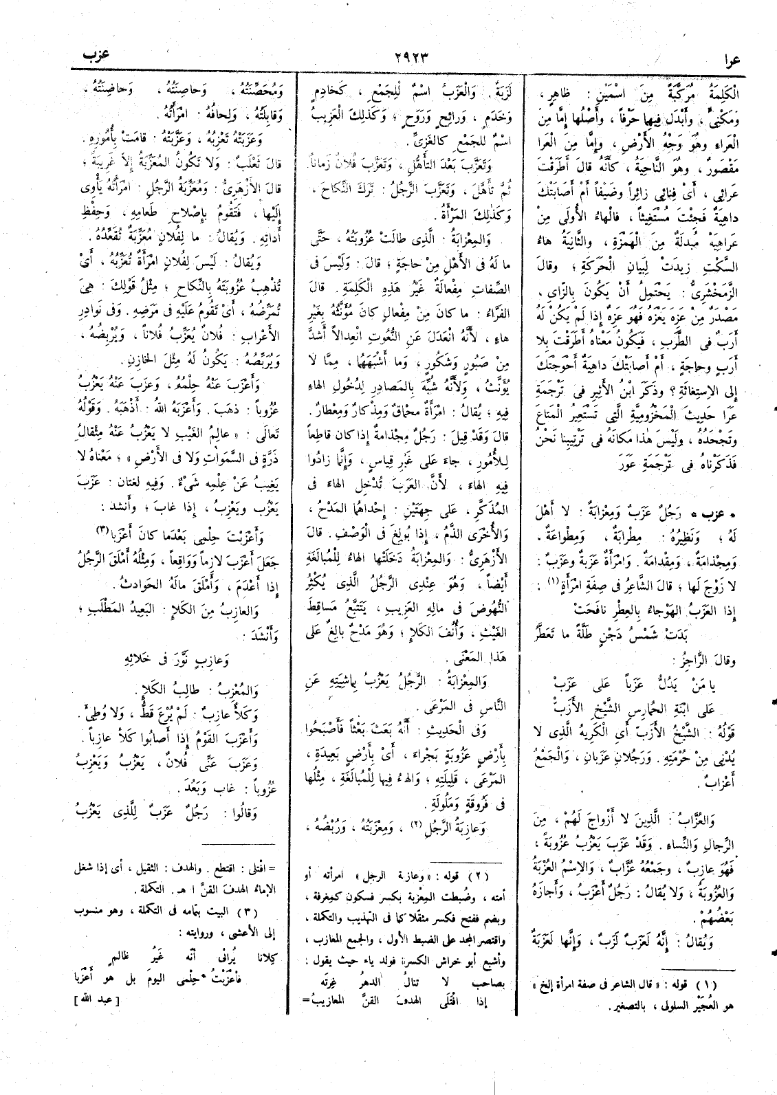 ( عزب ) رجل عَزَبٌ ومِعْزابة لا أَهل له ونظيرهُ مِطْرابة ومِطْواعة ومِجْذامة ومِقْدامة وامرأَة عَزبَةٌ وعَزَبٌ لا زَوْجَ لها قال الشاعر في صفة امرأَة