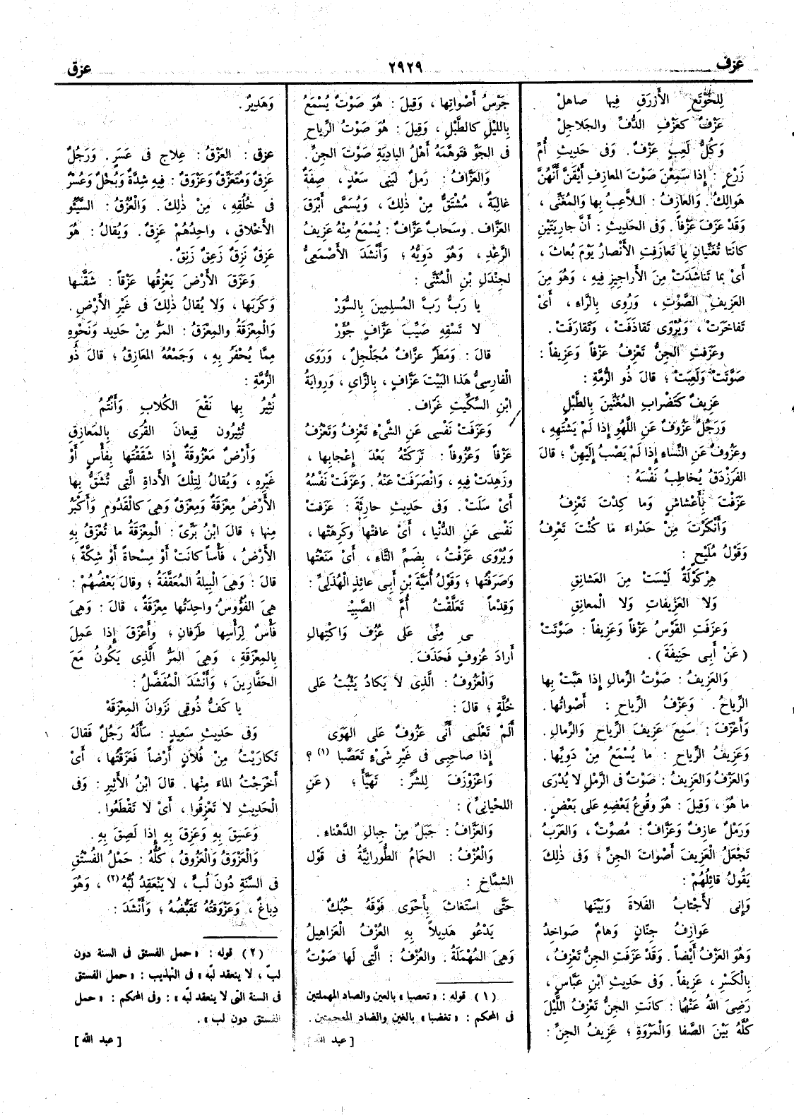 للخَوْتَعِ الأَزرَقِ فيها صاهْل عَزْفٌ كعَزْفِ الدُّفِّ والجلاجِلْ وكل لَعِب عَزْفٌ وفي حديث أُم زَرْع إذا سَمِعْنَ صوتَ المعازِف أَيْقَنَّ أَنهنَّ هَوالِكُ والعازِفُ اللاعِبُ بها والمُغَني وقد عَزَفَ عَزْفاً وفي الحديث أَنَّ جارِيَتَين كانتا تُغَنِّيان بما تعازفت الأَنصار يوم بُعاثَ أَي بما تناشدت من الأَراجيز فيه وهو من العَزيف الصوْت وروي بالراء أَي تَفاخرَتْ ويروى تَقاذفَت وتَقارَفَت وعَزَفتِ الجنُّ تَعزِفُ عَزْفاً وعَزيفاً صوَتت ولَعِبَت قال ذو الرمة عَزِيف كتَضْرابِ المُغَنِّين بالطَّبْل ورجل عَزُوفٌ عن اللَّهْو إذا لم يَشْتَهه وعَزُوف عن النساء إذا لم يَصْبُ إليهنَّ قال الفرزدق يُخاطب نفسه عَزَفْتَ بأَعْشاشٍ وما كِدْتَ تَعْزِفُ وأَنْكَرْتَ مِن حَدْراء ما كنتَ تعرِفُ وقول مليح هِرْكَوْلة ليسَتْ من العَشانِقِ ولا العَزِيفاتِ ولا المَعانِقِ وعزَفَتِ القوْسِ عَزْفاً وعزيفاً صوَّتت عن أَبي حنيفة والعَزِيفُ صوت الرِّمال إذا هَبَّت بها الرِّياح وعَزْفُ الرِّياح أَصواتها وأَعزَفَ سمع عَزيفَ الرِّياح والرِّمال وعَزِيفُ الرياحِ ما يسمع من دوِيِّها والعَزْفُ والعَزِيفُ صوت في الرمل لا يُدْرَى ما هو وقيل هو وُقوعُ بعضِه على بعض ورمل عازِف وعَزّاف مُصوِّت والعرب تجعل العَزيف أَصوات الجِنّ وفي ذلك يقول قائلهم وإني لأَجْتابُ الفَلاةَ وبَينها عَوازِفُ جِنّانٍ وهامٌ صَواخِدُ وهو العزفُ أَيضاً وقد عَزَفت الجنّ تَعْزِفُ بالكسر عزيفاً وفي حديث ابن عباس رضي اللّه عنهما كانت الجنُّ تَعزِف الليلَ كلّه بين الصَّفا والمروة عَزيفُ الجنّ جَرْسُ أَصواتها وقيل هو صوت يسمع بالليل كالطبل وقيل هو صوت الرِّياح في الجوِّ فتَوهَّمَه أَهل البادية صوتَ الجنّ والعزَّاف رمل لبني سعد صفة غالبة مشتق من ذلك ويسمى أَبْرَقَ العَزَّاف وسَحاب عَزَّاف يُسمع منه عَزِيفُ الرَّعْد وهو دَوِيُّه وأَنشد الأَصمعي لجَندل بن المُثَنَّى يا رَبُّ رَبَّ المُسلِمِين بالسُّوَرْ لا تَسْقِه صَيِّبَ عزَّافٍ جُؤَرْ قال ومطَر عزَّاف مُجَلْجِل وروى الفارسي هذا البيت عَزَّاف بالزاي ورواية ابن السكيت غَرّاف وعَزَفَت نفسي عن الشيء تَعْزِفُ وتَعْزُف عَزْفاً وعُزُوفاً تركَتْه بعد إعْجابها وزَهِدَتْ فيه وانْصرفت عنه وعزَفت نفْسُه أَي سَلَتْ وفي حديث حارثةَ عزَفتْ نفسِي عن الدُّنيا أَي عافتْها وكَرِهَتها ويروى عَزَفْتُ بضم التاء أَي منعتُها وصَرَفْتها وقولُ أَمية بن أَبي عائذ الهذلي وقِدْماً تَعَلَّقْتُ أُمَّ الصَّبِيْ يِ مِنِّي على عُزُفٍ واكْتِهال أَراد عُزوف فحذف والعَزُوف الذي لا يكاد يَثْبُت على خُلَّة قال أَلم تَعْلَمِي أَني عَزُوفٌ على الهَوى إذا صاحبي في غير شيء تَعَصَّبا ؟ واعْزَوْزَفَ للشرِّ تهيّأَ عن اللحياني والعزَّافُ جبَل من جِبال الدَّهْناء والعُزف الحمام الطُّورانِيَّة في قول الشماخ حتى استَغاثَ بأَحْوَى فَوْقَه حُبُكٌ يَدْعُو هَديلاً به العُزْفُ العَزاهِيلُ وهي المُهْمَلةُ والعُزْف التي لها صوت وهَدير ( عزق ) العَزْقُ علاج في عَسَرٍ ورجل عَزِقٌ ومُتَعَزِّقٌ وعَزْوَقٌ فيه شدة وبخل وعسر في خلقه من ذلك والعُزُقُ السِّيِّئُو الأَخلاقِ واحدهم عَزِقٌ ويقال هو عَزِقٌ نَزِقٌ زَعِقٌ زَنِقٌ وعَزَقَ الأَرضَ يَعْزِقُها عَزْقاً شقّها وكَرَبَها ولا يقال ذلك في غير الأَرض والمِعْزَقةُ والمِعْزَقُ المَرُّ من حديدٍ ونحوه مما يحفر به وجمعه المَعازِقُ قال ذو الرمة نُثِيرُ بها نَفْعَ الكُلابِ وأَنْتُمُ تُثِيرون قِيعانَ القُرى بالمَعازِقِ وأَرض مَعْزوقة إِذا شققتها بفأْسٍ أَو غيره ويقال لتلك الأَداة التي تشق بها الأَرض مِعْزَقةٌ ومِعْزَقٌ وهي كالقَدُوم وأَكبر منها قال ابن بري المِعْزقة ما تُعْزَقُ به الأَرضُ فأْساً كانت أَو مِسْحاةً أَو شِكَّة قال وهي البيلة المُعَقَّفة وقال بعضهم هي الفؤوس واحدتها مِعْزَقة قال وهي فأْس لرأْسها طرفان وأَعْزَقَ إِذا عمل بالمِع