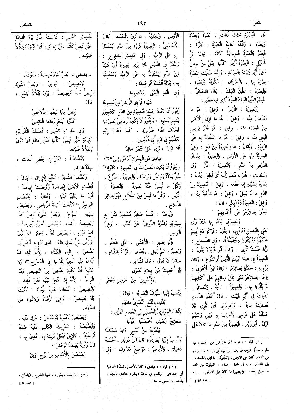 وفي البَصْرَةِ ثلاثُ لغات بَصْرَة وبِصْرَة وبُصْرَة واللغة العالية البَصْرَةُ الفرّاء البِصْرُ والبَصْرَةُ الحجارة البراقة وقال ابن شميل البَصْرَة أَرْض كأَنها جبل من جِصٍّ وهي التي بنيت بالمِرْبَدِ وإِنما سميت البَصْرَةُ بَصْرَةً بها والبَصْرَتان الكوفةُ والبصرة والبَصْرَةُ الطِّين العَلِكُ وقال اللحياني البَصْرُ الطين العَلِكُ الجَيِّدُ الذي فيه حَصًى والبَصِيرَةُ التُّرْسُ وقيل هو ما استطال منه وقيل هو ما لزق بالأَرض من الجسد وقيل هو قَدْرُ فِرْسِنِ البعير منه وقيل هو ما استدل به على الرَّمِيَّةِ ويقال هذه بَصِيرَةٌ من دَمٍ وهي الجَدِيَّةُ منها على الأَرض والبَصِيرَةُ مقدار الدِّرْهَم من الدَّمِ والبَصِيرَةُ الثَّأْرُ وفي الحديث فأُمِرَ به فَبُصِرَ رَأْسُه أَي قُطِعَ يقال بَصَرَهُ بسيفه إِذا قطعه وقيل البصيرة من الدم ما لم يسل وقيل هو الدُّفْعَةُ منه وقيل البَصِيرَةُ دَمُ البِكْرِ قال رَاحُوا بَصائِرُهُمْ على أَكْتَافِهِمْ وبَصِيرَتِي يَعْدُو بِها عَتَدٌ وَأَى يعني بالبصائر دم أَبيهم يقول تركوا دم أَبيهم خلفهم ولم يَثْأَرُوا به وطَلَبْتُه أَنا وفي الصحاح وأَنا طَلَبْتُ ثَأْرِي وكان أَبو عبيدة يقول البَصِيرَةُ في هذا البيت الترْسُ أَو الدرع وكان يرويه حملوا بصائرهم وقال ابن الأَعرابي راحوا بصائرُهم يعني ثِقْل دمائهم على أَكتافهم لم يَثْأَرُوا بها والبَصِيرَة الدِّيَةُ والبصائر الديات في أَوَّل البيت قال أَخذوا الديات فصارت عاراً وبصيرتي أَي ثَأْرِي قد حملته على فرسي لأُطالب به فبيني وبينهم فرق أَبو زيد البَصيرة من الدم ما كان على الأَرض والجَدِيَّةُ ما لَزِقَ بالجسد وقال الأَصمعي البَصيرة شيء من الدم يستدل به على الرَّمِيَّةِ وفي حديث الخوارج ويَنْظُر في النَّصْلِ فلا يرى بَصِيرَةً أَي شيئاً من الدم يستدل به على الرمية ويستبينها به وقوله أَنشده أَبو حنيفة وفي اليَدِ اليُمْنَى لِمُسْتَعِيرها شَهْبَاءُ تُرْوِي الرِّيشَ مِنْ بَصِيرِها يجوز أَن يكون جمع البصيرة من الدم كشَعِيرة وشَعِير ونحوها ويجوز أَن يكون أَراد من بصيرتها فحذف الهاء ضرورة كما ذهب إِليه بعضهم في قول أَبي ذؤيب أَلا لَيْتَ شِعْرِي هل تَنَظَّرَ خالِدٌ عِيادِي عَلى الهِجْرانِ أَمْ هُوَ يائِسُ ؟