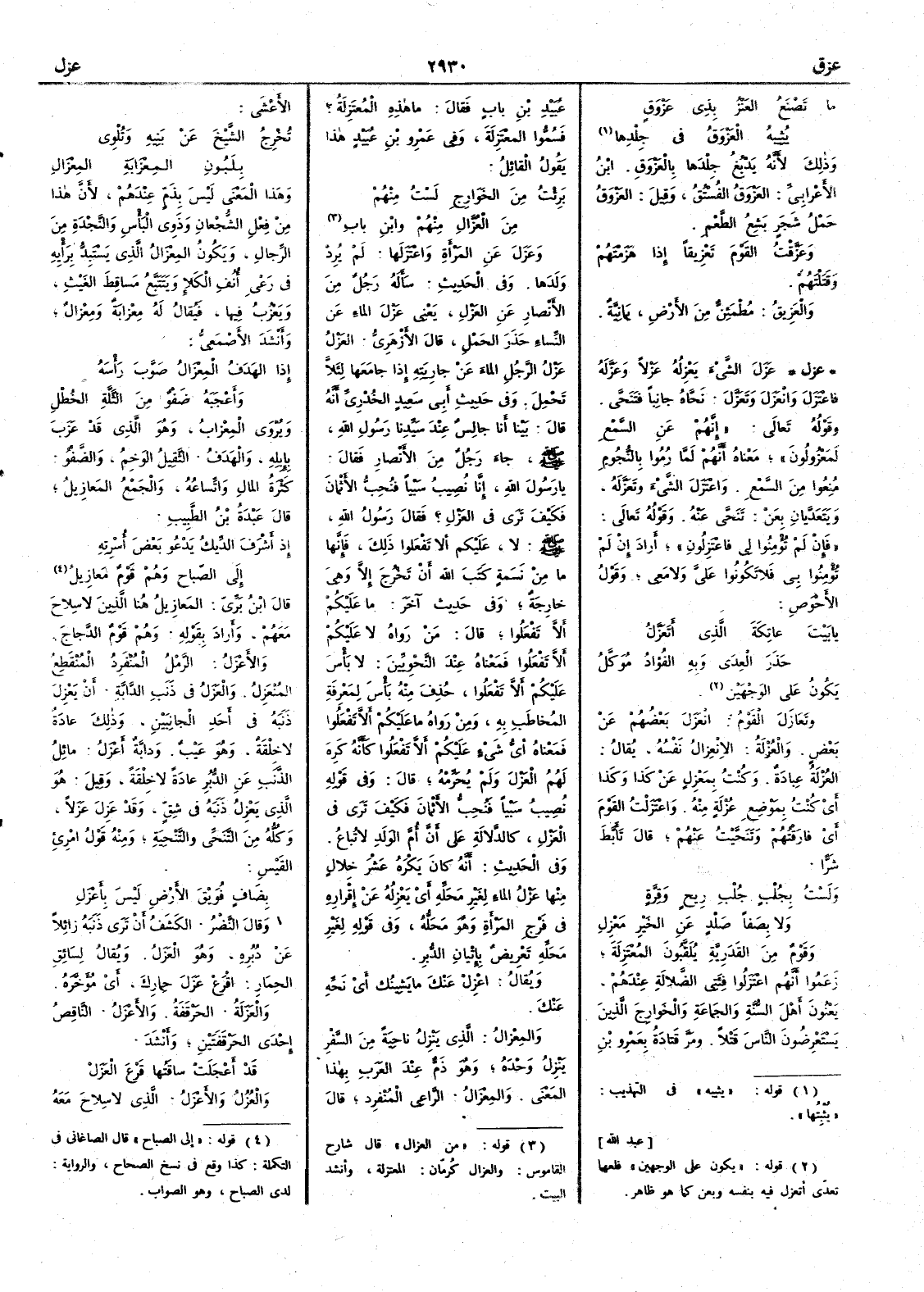 وتَعَاَزَلَ القومُ انْعَزَلَ بَعْضُهم عن بَعَض والعُزْلةُ الانْعِزال نفسُه يقال العُزْلةُ عِبادة وكُنْتُ بمَعْزِلٍ عن كذا وكذا أَي كُنْتُ بموْضع عُزْلةٍ منه واعْتَزَلْتُ القومَ أَي فارَقْتهم وتَنَحَّيت عنهم قال تأَبَّط شَرًّا ولَسْتُ بِجُلْبٍ جُلْب ريحٍ وقِرَّةٍ ولا بصَفاً صَلْدٍ عن الخير مَعْزِل وقَوْمٌ من القَدَرِيَّةِ يُلَقَّبون المُعْتَزِلة زعموا أَنهم اعْتَزَلوا فِئَتي الضلالة عندهم يَعْنُون أَهلَ السُّنَّة والجماعةِ والخَوَارجَ الذين يَسْتَعْرِضون الناسَ قَتْلاً ومَرَّ قَتادةُ بعمرو بن عُبَيْد بن بابٍ فقال ما هذه المُعْتَزِلة ؟ فسُمُّوا المُعْتَزِلةَ وفي عمرو بن عبيد هذا يقول القائل بَرئْتُ من الخَوَارج لَسْتُ منهم مِنَ العُزَّالِ منهم وابنِ باب