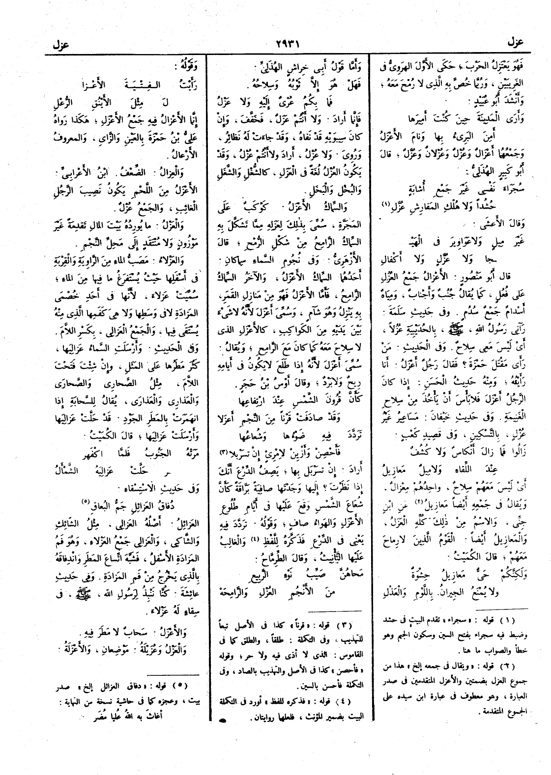 والغالب عليها التأْنيث وقال الطِّرِمّاح مَحاهُنَّ صَيِّبُ نَوْء الرَّبِيع مِنَ الأَنْجُم العُزْلِ والرَّامِحَه وقوله رَأَيْتُ الفِتْيَةَ الأَعْزا لع مِثْلَ الأَينُق الرُّعْل إِنما الأَعزالُ فيه جمع الأَعزَل هكذا رواه علي بن حمزة بالعين والزاي والمعروف الأَرْعال والعِزال الضَّعْفُ ابن الأَعرابي الأَعْزَل من اللحم يكون نصيبَ الرجل الغائب والجمع عُزْلٌ والعَزْل ما يورِدُه بيتَ المال تَقْدِمةً غيرَ موزون ولا مُنْتَقَد إِلى محِلِّ النَّجْم والعَزْلاء مَصَبُّ الماء من الراوية والقِرْبةِ في أَسفلها حيث يُسْتَفْرَغ ما فيها من الماء سُميت عَزلاء لأَنها في أَحد خُصْمَي المَزادة لا في وَسَطها ولا هي كفَمِها الذي منه يُسْتَقى فيها والجمع العَزالي بكسر اللام وفي الحديث وأَرْسَلَت السَّماءُ عَزالِيَها كثُر مطَرُها على المثل وإِن شئت فتحت اللام مثل الصَّحاري والصَّحارى والعَذاري والعَذارى يقال للسحابة إِذا انهَمَرَتْ بالمَطر الجَوْد قد حَلَّت عَوالِيَها وأَرسَلتْ عَزالِيَها قال الكميت مَرَتْه الجَنوبُ فلمّا اكْفَه رَّ حَلَّتْ عَزالِيَه السَّمْأَلُ وفي حديث الاستسقاء دُفاقُ العَزائِل جَمُّ البُعاق