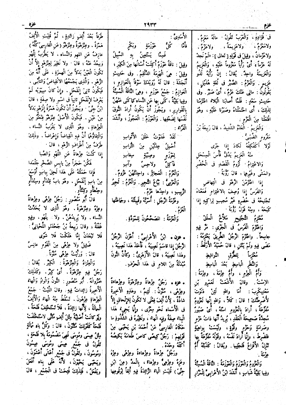 في فُؤادِه والعربُ تقولُ ما لَه مَعْزِمٌ ولا مَعْزَمٌ ولا عَزِيمةٌ ولا عَزْمٌ ولا عُزْمانٌ وقيل في قوله لم نَجِدْ له عَزْماً أي رَأْياً مَعْزوماً عليه والعَزِيمُ والعزيمةُ واحدٌ يقال إنَّ رأْيَه لَذُو عَزِيمٍ والعَزْمُ الصَّبْرُ في لغة هذيل يقولون ما لي عنك عَزْمٌ أي صَبْرٌ وفي حديث سَعْدٍ فلما أصابَنا البَلاءُ اعْتَزَمْنا لذلك أي احْتَمَلْناه وصبَرْنا عليه وهو افْتَعَلْنا من العَزْم والعَزِيمُ العَدْوُ الشديد قال ربيعة بن مَقْرُومٍ الضَّبّيُّ لولا أُكَفْكِفُه لكادَ إذا جَرى منه العَزِيمُ يَدُّقُّ فَأْسَ المِسْحَلِ والاعْتِزامُ لزُومُ القَصدِ في الحُضْر والمَشْي وغيرهما قال رؤبة إذا اعْتَزَمْنَ الرَّهْوَ في انْتِهاضِ والفَرسُ إذا وُصِفَ بالاعْتِزامِ فمعناه تَجْلِيحُه في حُضْرِه غير مُجِيبٍ لراكبِه إذا كَبَحَه ومنه قول رؤبة مُعْتَزِم التَّجْلِيحِ مَلاَّخ المَلَق واعْتَزَمَ الفَرَسُ في الجَرْيِ مَرَّ فيه جامِحاً واعْتَزَمَ الرجلُ الطريقَ يَعْتَزِمُه مَضَى فيه ولم يَنْثَنِ قال حُمَيْدٌ الأَرْقَطُ مُعْتَزِماً للطُّرُقِ النَّواشِطِ والنَّظَرِ الباسِطِ بَعْدَ الباسِطِ وأُمُّ العِزْم وأُمُّ عِزْمَةَ وعِزْمةُ الاسْتُ وقال الأَشْعَث لعَمْرو بن مَعْديكربَ أمَا واللهِ لئِن دَنَوْتَ لأُضْرِطَنَّكَ قال كلاَّ والله إنها لَعَزُومٌ مُفَزَّعَةٌ أراد بالعَزُومِ اسْته أي صَبُورٌ مُجِدّةٌ صحيحةُ العَقْدِ يريد أَنها ذاتُ عَزْمٍ وصرامةٍ وحَزْمٍ وقُوَّةٍ ولَيْسَتْ بِواهِيةٍ فتَضْرطَ وإنما أراد نَفْسَه وقوله مُفَزَّعَةٌ بها تَنْزِل الأَفزاعُ فتجْلِيها ويقال كَذَبَتْه أُمُّ عِزْمَة والعَزُومُ والعَوْزَمُ والعَوْزَمَةُ الناقةُ المُسِنَّةُ وفيها بَقِيَّةُ شَبابٍ أَنشد ابن الأعرابي للمَرَّارِ الأَسَدِيِّ فأَمَّا كلُّ عَوْزَمةٍ وبَكرٍ فمِمَّا يََسْتَعِينُ به السَّبِيلُ وقيل ناقة عَوْزَمٌ أَكِلَتْ أَسْنانُها من الكِبَر وقيل هي الهَرِمَةُ الدِّلْقِمُ وفي حديث أَنجَشةَ قال له رُوَيْدَكَ سَوْقاً بالعَوازِمِ العَوازِمُ جمعُ عَوْزَمٍ وهي الناقةُ المُسِنَّة وفيها بَقِيَّةٌ كَنَى بها عن النِّساء كما كَنَى عنهنّ بالقوارير ويجوز أن يكون أَرادَ النُّوق نفسَها لضَعفها والعَوْزَم العجوز وأَنشد الفراء لقدْ غَدَوْتُ خَلَقَ الأثوابِ أحمِلُ عِدْلَينِ من التُّرابِ لعَوْزَمٍ وصِبْيةٍ سِغابِ فآكِلٌ ولاحِسٌ وآبِي والعُزُمُ العجائز واحدتهنّ عَزُومٌ والعَزْمِيُّ بَيّاع الثَّجير والعُزُمُ ثَجِير الزَّبيب واحدها عَزْمٌ وعُزْمةُ الرجل أُسرَتُه وقبيلته وجماعتها العُزَمُ والعَزَمة المصحِّحون للموَدَّة ( عزن ) ابن الأَعرابي أَعْزَنَ الرجلُ الرجلَ إذا قاسم نصيبه فأَخذ هذا نصيبه وهذا نصيبه قال الأَزهري وكأَن النون مبدلة من اللام في هذا الحرف( عزه ) رجل عِزْهاةٌ وعِنْزَهْوَةٌ وعِزْهاءةٌ وعِزْهىً مُنَوَّن لئيم وهذه الأَخيرة شاذة لأَن أَلف فِعْلى لا تكون للإِلحاق إِلا في الأَسماء نحو مِعْزىً وإِنما يجيء هذا البناء صفةً وفيه الهاء ونظيره في الشذوذ ما حكاه الفارسي عن أَحمد بن يحيى من قولهم رجل كِيصىً كاصَ طعامَهُ يَِكِيصُهُ أَكَلَهُ وحْده ورجل عِزْهاةٌ وعِزْهاءَةٌ وعِزْهىً وعِزْهٌ وعَزِهٌ وعِزْهِيٌّ وعِزْهاءٌ بالمدّ عن ابن جني قلبت الياء الزائدة فيه أَلفاً لوقوعها طَرَفاً بعد أَلف زائدة ثم قلبت الأَلف همزة وعِنْزَهْوةٌ وعِنْزَهْوٌ عن الفارسي كلُّه عازِفٌ عن اللهو والنساء لا يَطْرَبُ للهو ويبعد عنه قال ولا نظير لعِنْزَهْوٍ إِلا أَن تكون العين بدلاً من الهمزة على أَنه من الزَّهْوِ والذي يجمعهما الانقباضُ والتأَبِّي فيكون ثانِيَ إِنْقَحْلٍ وإِن كان سيبويه لم يَعْرِفْ لإِنْقَحْلٍ ثانياً في اسم ولا صفة قال ابن جني ويجوز أَن تكون همزة إِنْزَهْوٍ بدلاً من عين فيكون الأَصل عِنْزَهْوِ فِنْعَلْوٌ من العِزْهاةِ وهو الذي لا يَقْرَبُ النساء والتقاؤهما 
