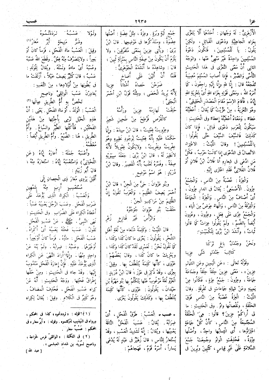 الأَزهري له وَجْهان أَحدهما أَنّ لا يَتَعَزَّى بعَزاء الجاهِليَّة ودَعْوَى القَبائل ولكن يقول يا لَلْمُسْلِمِينَ فتكون دَعْوَة المُسْلِمِينَ واحدةً غيرَ مَنْهِيٍّ عنها والوجه الثاني أَن مَعْنى التَّعَزِّي في هذا الحديث التَّأَسِّي والصَّبرُ فإذا أَصاب المُسْلِمَ مصيبةٌ تَفْجَعُه قال إنَّا لله وإنَّا إليه راجعون كما أَمَره الله ومَعنى قوله بعَزَاءِ الله أَي بتَعْزِيَةِ الله إيّاه فأَقام الاسمَ مُقامَ المَصْدرِ الحقيقي وهو التَّعْزية مِنْ عَزَّيْتُ كما يقال أَعْطَيْته عَطاءً ومعناه أَعْطَيته إعطاءً وفي الحديث سَيَكون للْعَرَبِ دَعْوَى قَبائِلَ فإذا كان كذلك فالسَّيفَ السَّيفَ حتى يَقُولوا يا لَلْمُسلمين وقال الليث الاعْتِزاءُ الاتّصالُ في الدَّعوَى إذا كانت حربٌ فكلُّ مَنِ ادَّعى في شعارِهِ أَنا فلانٌ ابنُ فُلانٍ أَو فلانٌ الفُلانيُّ فقدِ اعْتَزَى إليه والعِزَةُ عُصْبَة من الناس والجمع عِزُونَ الأصمعي يقال في الدارِ عِزُونَ أَي أَصنافٌ من النَّاسِ والعِزَة الجماعةُ والفِرْقَةُ من الناسِ والهاءُ عِوَضٌ من الياء والجَمع عِزًى على فِعَل وعِزُون وعُزون أَيضاً بالضم ولم يقولوا عِزات كما قالوا ثُبات وأَنشد ابن بري للكميت ونحنُ وجَنْدَلٌ باغٍ تَرَكْنا كَتائبَ جَنْدَلٍ شَتىً عِزِينا وقوله تعالى عن اليَميِن وعن الشِّمالِ عِزِينَ معنى عِزين حِلَقاً حِلَقاً وجَماعةً جماعةً وعِزُونَ جَمْعِ عِزَةٍ فكانوا عن يَمِينِه وعن شِماله جماعاتٍ في تَفْرِقَة وقال الليث العِزَةُ عُصْبَة من الناس فَوْقَ الحَلْقَة ونُقَصانُها واو وفي الحديث ما لي أَراكم عِزِينَ ؟ قالوا هي الحَلْقَة المُجْتَمِعَة من الناس كأَنَّ كلَّ جماعةٍ اعْتِزَاؤها أَي انْتِسابُها واحِدٌ وأَصلها عِزْوَة فحذفت الواو وجُمِعَت جمعَ السلامَةِ على غَيْر قياسٍ كثُبِين وبُرِينَ في جمع ثُبَةٍ وبُرَةٍ وعِزَةٌ مثلُ عِضَةٍ أَصْلُها عِضْوَة وسنذكرها في موضعها قال ابن بري ويَأْتي عِزين بمعنى مُتَفَرِّقِين ولا يلزم أَن يكون من صفَة الناس بمَنْزِلَة ثُبِين قال وشاهده ما أَنشده الجوهري فلما أَنْ أَتَيْنَ على أُضاخٍ ضَرَحْنَ حَصاهُ أَشْتاتاً عِزِينا لأنه يريد الحَصى ومثله قول ابن أَحمر البجلي حُلِقَتْ لَهازِمُه عِزينَ ورأْسُه كالقُرْصِ فُرْطِحَ من طَحِينِ شَعِيرِ وعِزْوِيتٌ فِعْلِيتٌ قال ابن سيده وإنما حكمنا عليه بأَنَّه فِعْلِيتٌ لوجود نَظيره وهو عِفْرِيت ونِفْريتٌ ولا يكون فِعْويلاً لأَنه لا نَظِيرَ له قال ابن بري جَعَلَه سيبويه صفَة وفسَّره ثعلب بأَنه القصير وقال ابن دُرَيد هو اسم مَوْضِع وبَنو عَزْوانَ حَيٌّ من الجِنِّ قال ابن أَحمر يصف الظَّلِيمَ والعربُ تقول إن الظِّلِيمَ من مَراكِبِ الجنِّ حَلَقَتْ بَنُو عَزْوَانَ جُؤْجُؤْهُ والرأْسَ غيرَ قَنازِعٍ زُعْرِ قال الليث وكلمة شَنْعاءُ من لغة أَهل الشحر يقولون يَعْزَى ما كان كذا وكذا كما نقولُ نحن لعَمْري لقد كان كذا وكذا ويَعْزِيكَ ما كان كذا وقال بعضهم عَزْوَى كأَنهم كلمة يُتَلَطَّف بها وقيل بِعِزِّي وقد ذُكِرَ في عزز قال ابن دريد العَزْوُ لغة مرغوبٌ عنها يَتكلم بها بَنُو مَهْرَة بن حَيْدَانَ يقولون عَزْوَى كأَنها كلمة يُتَلَطّفُ بها وكذلك يقولون يَعْزى ( عسب ) العَسْبُ طَرْقُ الفَحْلِ أَي ضِرابُه يقال عَسَبَ الفَحلُ الناقةَ يَعْسِبُها ويقال إِنه لشديد العَسْب وقد يُسْتَعار للناس قال زهير في عبدٍ له يُدْعَى يَساراً أَسَرَه قومٌ فهَجَاهم