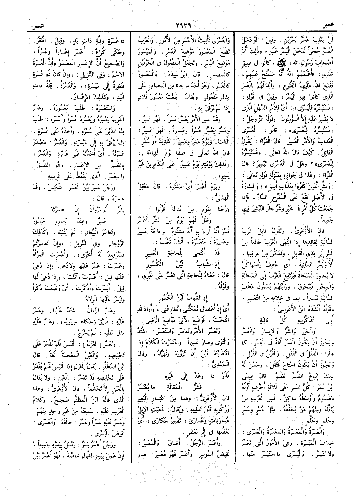 لن يغلب عُسْرٌ يُسْرَينِ وقيل لو دخلَ العُسْرُ جُحْراً لَدَخَل اليُسْرُ عليه وذلك أَن أَصحاب رسول الله صلى الله عليه وسلم كانوا في ضِيقٍ شديد فأَعْلَمَهم الله أَنه سيَفْتَحُ عليهم ففتح الله عليهم الفُتوحَ وأَبْدَلَهم بالعُسْر الذي كانوا فيه اليُسْرَ وقيل في قوله فسَنُيَسِّرُه لليُسْرَى أَي للأَمر السهل الذي لا يَقْدِرُ عليه إِلا المؤمنون وقوله عز وجل فسَنُيَسِّرُه للعُسْرَى قالوا العُسْرَى العذابُ والأَمرُ العَسِيرُ قال الفراء يقول القائل كيف قال الله تعالى فسنيسره للعسرى ؟ وهل في العُسْرَى تَيْسيرٌ ؟ قال الفراء وهذا في جوازه بمنزلة قوله تعالى وبشِّر الذين كفروا بعذاب أَليم والبِشارةُ في الأَصل تقع على المُفَرِّحِ السارّ فإِذا جمعتَ كلَّ أَمرٍ في خير وشر جاز التبشيرُ فيهما جميعاً قال الأَزهري وتقول قابِلْ غَرْبَ السانية لقائدها إِذا انتهى الغَرْب طالعاً من البئر إِلى أَيدي القابل وتَمَكَّنَ من عَراقِيها أَلا ويَسِّر السانيةَ أَي اعطف رأْسَها كي لا يُجاوِر المَنْحاة فيرتفع الغرْبُ إِلى المَحالة والمِحْورِ فينخرق ورأَيتهم يُسَمُّون عَطْفَ السانيةِ تَيْسِيراً لما في خلافه من التَّعْسير وقوله أَنشده ابن الأَعرابي أَبي تُذَكِّرُنِيهِ كلُّ نائبةٍ والخيرُ والشرُّ والإِيسارُ والعُسُرُ ويجوز أَن يكون العُسُر لغة في العُسْر كما قالوا القُفُل في القُفْل والقُبُل في القُبْل ويجوز أَن يكون احتاج فثقل وحسّن له ذلك إِتاعُ الضمِّ الضمَّ قال عيسى بن عمر كل اسم على ثلاثة أَحرف أَوله مضموم وأَوسطُه ساكن فمن العرب من يُثَقِّلُه ومنهم من يخففه مثل عُسْر وعُسُر وحُلْم وحُلُم والعُسْرةُ والمَعْسَرةُ والمَعْسُرةُ والعُسْرَى خلاف المَيْسَرة وهي الأُمور التي تَعْسُر ولا تَتَيَسَّرُ واليُسْرَى ما اسْتَيْسَرَ منها والعُسْرى تأْنيث الأَعْسَر من الأُمور والعرَبُ تضع المَعْسورَ موضع العُسْرِ والمَيْسورَ موضعَ اليُسْر ويجعل المفعول في الحرفين كالمصدر قال ابن سيده والمَعْسورُ كالعُسْر وهو أَحد ما جاء من المصادر على مثال مفعول ويقال بلغْتُ مَعْسورَ فلانٍَ إِذا لم تَرْفُقْ به وقد عَسِرَ الأَمرُ يَعْسَر عَسَراً فهو عَسِرٌ وعَسُرَ يَعْسُر عُسْراً وعَسارَةً فهو عَسِير الْتاثَ ويوم عَسِرٌ وعَسِيرٌ شديدٌ ذو عُسْرٍ قال الله تعالى في صفة يوم القيامة فذلك يومئذ يومٌ عَسِيرٌ على الكافرين غيرُ يَسِير ويوم أَعْسَر أَي مشؤوم قال معقل الهذلي ورُحْنا بقومٍ من بُدالة قُرّنوا وظلّ لهم يومٌ من الشَّرِّ أَعْسَرُ فسَّر أَنه أَراد به أَنه مشؤوم وحاجة عَسِير وعَسِيرة مُتَعَسِّرة أَنشد ثعلب قد أَنْتَحِي للحاجة العَسِيرِ إِذ الشَّبابُ لَيّنُ الكُسورِ قال معناه للحاجة التي تعسر على غيري وقوله إِذ الشاب لين الكسور أَي إِذ أَعضائي تُمَكِّنُني وتُطاوِعُني وأَراد قد انتحيت فوضع الآتي موضع الماضي وتعسَّر الأَمر وتعاسَرَ واسْتَعْسَرَ اشتدّ والْتَوَى وصار عَسِيراً واعْتَسَرْت الكلامَ إِذا اقْتَضَبْته قبل أَن تُزَوِّرَه وتُهَيِّئَه وقال الجعدي فَذَرْ ذا وعَدًّ إِلى غيرِه فشَرُّ المَقالةِ ما يُعْتَسَرْ قال الأَزهري وهذا من اعْتِسارِ البعير ورُكوبه قبل تذليله ويقال ذهبت الإِبلُ عُسارَياتٍ وعُسارَى تقدير سُكارَى أَي بعضُها في إِثر بعض وأَعْسَرَ الرجلُ أَضاق والمُعْسِر نقيض المُوسِر وأَعْسَر فهو مُعْسِر صار ذا عُسْرَةٍ وقلَّةِ ذاتِ يد وقيل افتقر وحكى كُراع أَعْسَرَ إِعْساراً وعُسْراً والصحيح أَن الإِعْسارَ المصدرُ وأَن العُسْرة الاسم وفي التنزيل وإِن كان ذو عُسْرةٍ فنَظِرةٌ إِلى مَيْسَرة والعُسْرةُ قِلّة ذات اليد وكذلك الإِعْسارُ واسْتَعْسَرَه طلب مَعْسورَه وعَسَرَ الغريمَ يَعْسِرُه ويَعْسُره عُسْراً وأَعْسَرَه طلب منه الدَّيْنَ على عُسْرة وأَخذه على عُسْرة ولم يرفُق به إِلى مَيْسَرَتِه والعُسْرُ مصدر عَسَرْتُه أَي أَخذته على عُسْرة والعُسْر بالضم من الإِعْسا