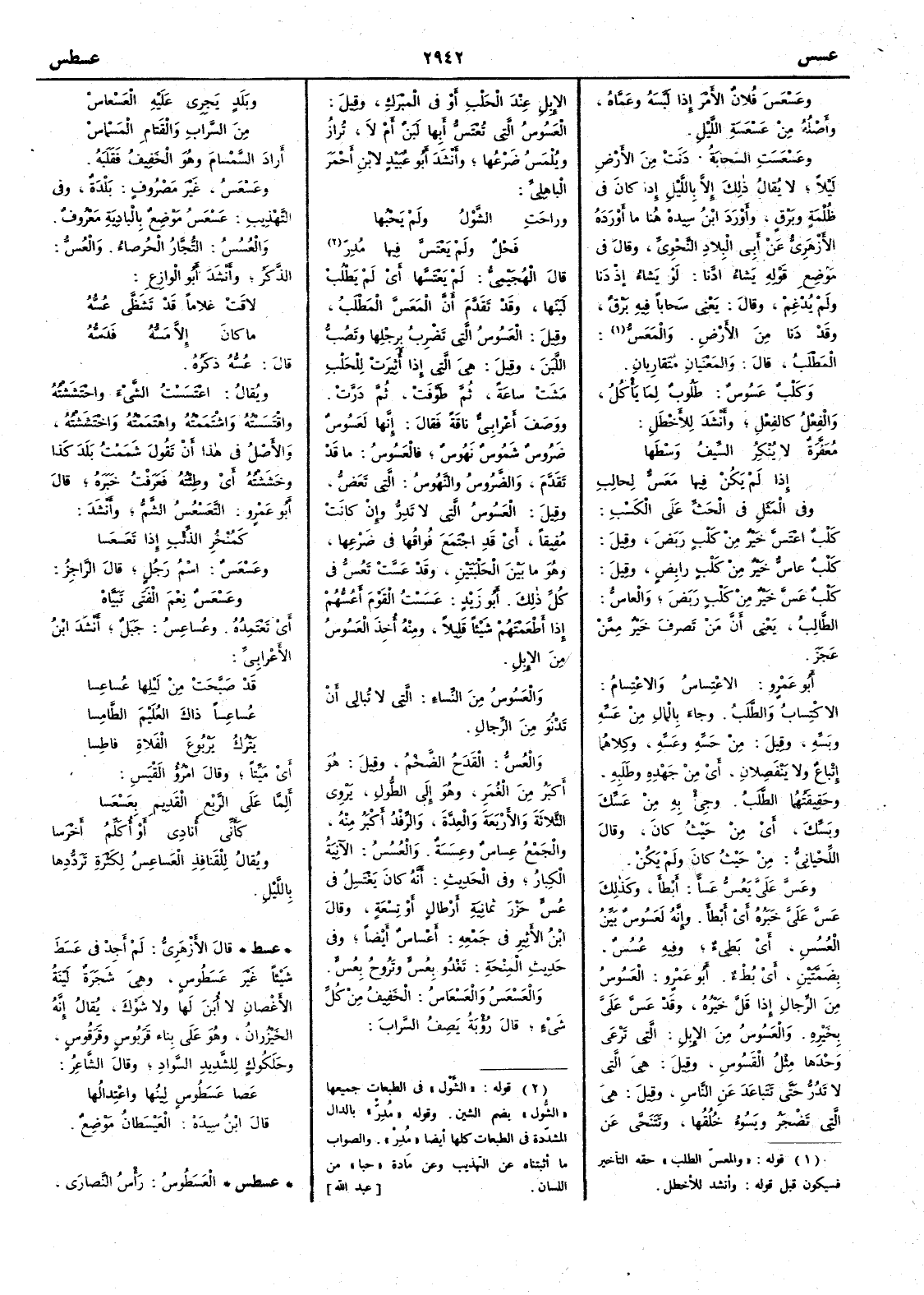 وعَسْعَس فلان الأَمر إِذا لبَّسَه وعَمَّاه وأَصله من عَسْعَسَة الليل وعَسْعَسَتِ السحابة دنت من الأَرض ليلاً لا يقال ذلك إِلا بالليل إِذا كان في ظلمة وبرق وأَورد ابن سيده هنا ما أَورده الأَزهري عن أَبي البلاد النحوي وقال في موضع قوله يشاء ادَّنا لو يشاء إِذ دنا ولم يدغم وقال يعني سحاباً فيه برق وقد دنا من الأَرض والمَعَسُّ المَطْلَب قال والمعنيان متقاربان وكلب عَسُوسٌ طلوب لما يأْكل والفعل كالفعل وأَنشد للأَخطل مُعَفَّرة لا يُنْكِه السَّيفُ وَسْطَها إِذا لم يكن فيها مَعَسُّ لِحالِبِ وفي المثل في الحث على الكسب كَلْبٌ اعْتَسَّ خير من كلبٍ رَبَضَ وقيل كلب عاسّ خير من كلب رابِض وقيل كلب عَسَّ خير من كلب رَبَضَ والعاسُّ الطالب يعني أشن من تصرَّف خير ممن عجز أَبو عمرو الاغتِساس والاعْتِسامُ الاكتساب والطلَب وجاء بالمال من عَسَّه وبَسَّه وقيل من حَسَّه وعَسَّه وكلاهما إِتباع ولا ينفصلان أَي من جَهْده وطلَبه وحقيقتُهما الطلب وجِئْ به من عَسِّك وبَسِّك أَي من حيث ان وقال اللحياني من حيث كان ولم يكن وعَسَّ عَليَّ يَعُسُّ عَسّاً أَبطأَ وكذلك عَسَّ عليَّ خبره أَي أَبطأَ وإِنه لَعسُوس بيِّن العُسُس أَي بطيء وفيه عُسُسٌ بضمتين أَي بطء أَبو عمرو العَسُوسُ من الرجال إِذا قل خيره وقد عَسَّ عليَّ بخيره والعَسُوسُ من الإِبل التي ترعى وحدها مثل القَسُوسِ وقيل هي التي لا تَدِرُّ حتى تَتباعَدَ عن الناس وقيل هي التي تَضجَر ويسوءُ خلُقها وتتنحى عن الإِبل عند الحَلْب أَو في المبرك وقيل العَسُوسُ التي تُعْتَسُّ أَبِها لَبَن أَم لا تُرازُ ويلمس ضَرعها وأَنشد أَبو عبيد لابن أَحمر الباهلي وراحتِ الشُّولُ ولم يَحْبُها فَحْلٌ ولم يَعْتَسَّ فيها مُدِرْ قال الهجيمي لم يَعْتَسَّها أَي لم يطلب لبَنها وقد تقدم أَن المَعَسَّ المَطْلَبُ وقيل العَسُوسُ التي تضرب برجلها وتصُب اللبن وقيل هي التي إِذا أُثيرتْ للحَلْب مشت ساعة ثم طَوَّفَتْ ثم دَرَّت ووصف أَعرابي ناقة فقال إِنها لعَسُوسٌ ضَروسٌ شَمُوسٌ نَهُوسٌ فالعسوس ما قد تقدم والضَّروس والنَّهوس التي تَعَضُّ وقيل العَسوس التي لا تَدِرَ وإِن كانت مُفيقاً أَي قد اجتمع فُواقها في ضرعها وهو ما بين الحلبتين وقد عَسَّت تَعُسُّ في كل ذلك أَبو زيد عَسَسْت القوم أَعُسُّهم إِذا أَطعمتَهم شيئاً قليلاً ومنه أُخذ العَسُوس من الإِبل والعَسُوسُ من النساء التي لا تُبالي أَن تَدنُوَ من الرجال والعُسُّ القدح الضخم وقيل هو أَكبر من الغُمَرِ وهو إِلى الطول يروي الثلاثة والأَربعة والعِدَّة والرِّفْد أَكبر منه والجمع عِساس وعِسَسَة والعُسُسُ الأنية الكبار وفي الحديث أَنه كان يغتسل في عُسٍّ حَزْرَ ثمانية أَرطال أَو تسعة وقال ابن الأَثير في جمعه أَعْساسٌ أَيضاً وفي حديث المِنْحة تَغْدو بِعُسٍّ وتَرُوحُ بِعُسٍّ والعَسْعَسُ والعَسْعَاسُ الخفيف من كل شيء قال رؤبة يصف السراب وبلَدٍ يَجري عليه العَسعاسْ من السَّراب والقَتامِ المَسْماسْ أَراد السَّمْسام وهو الخفيف فقلبَه وعَسْعَسُ غير مصروف بلدة وفي التهذيب عَسْعَسُ موضع بالبادية معروف والعُسُس التُّجَّار الحُرصاء والعُسُّ الذكَر وأَنشد أَبو الوازع لاقَتْ غلاماً قد تَشَظَّى عُسُّه ما كان إِلا مَسُّه فدَسُّهُ قال عُسُّه ذكَره ويقال اعْتَسَسْتُ الشيء واحْتَشَشْتُهُ واقْتَسَسْتُه واشْتَمَمْتُه واهْتَمَمْتُه واخْتَشَشْتُه والأَصل في هذا أَن تقول شَمَمْت بلد كذا وخَشَشْتُه أَي وطئته فعرفت خَبره قال أَبو عمرو التَّعَسْعُسُ الشَّم وأَنشد كَمُنْخُرِ الذئب إِذا تَعَسْعَسا وعَسْعَسٌ اسم رجل قال الراجز وعَسْعَسٌ نِعم الفتى تَبَيَّاهْ أَي تعتمدُه وعُساعِسُ جبل أَنشد ابن الأَعرابي قد صبَّحَتْ من لَيْلِها عُساعِسا عُساعِساً ذاك العُلَيْمَ الطَّامِسا يَتْرُك يَرْبُوعَ الفَلاةِ فاطِسا أَي ميتاً وقال امرؤ القيس أَلمَّا علة الرَّبْعِ القديمِ بِعَسْعَسا كأَني أُنادِي أَو أُكَلِّم أَخرَسا ويق