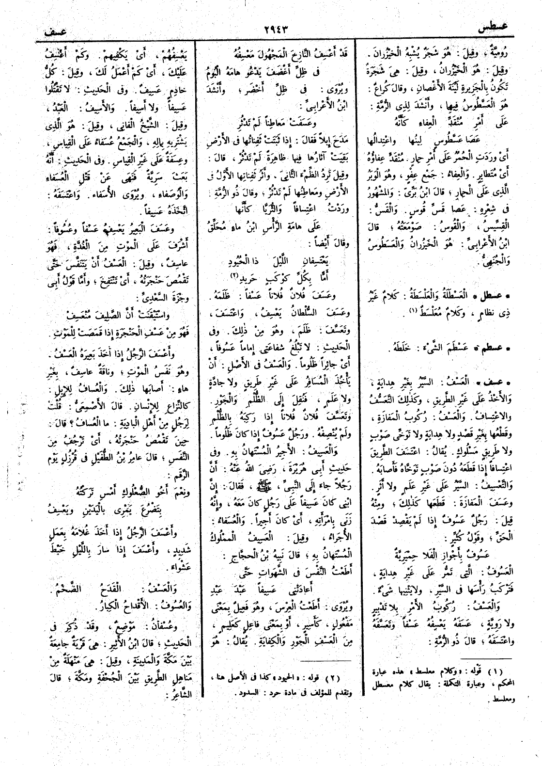 ( عسف ) العَسْفُ السَّير بغير هداية والأخْذُ على غير الطريق وكذلك التَّعَسُّفُ والاعْتِسافُ والعَسْف رُكوب المَفازَةِ وقطْعُها بغير قَصْد ولا هِداية ولا تَوَخِّي صَوْب ولا طَريق مَسْلوك يقال اعْتسف الطريقَ اعتِسافاً إذا قَطَعَه دون صوْب تَوَخّاه فأَصابه والتعسِيفُ السَّيْرُ على غير عَلَم ولا أَثرٍ وعَسَفَ المَفازةَ قَطَعَها كذلك ومنه قيل رجل عَسوفٌ إذا لم يَقْصِد الحقِّ وقول كثيِّر عَسُوق بأَجْواز الفَلا حِمْيَريّة العَسُوف التي تمرّ على غير هداية فتركب رأْسها في السير ولا يَثْنيها شيء والعَسْفُ ركوب الأَمر بلا تدبير ولا رَويّة عسَفَه يَعْسِفُه عَسْفاً وتَعَسَّفَه واعْتَسَفه قال ذو الرمة قد أَعْسِفُ النَّازِحَ المَجْهُولَ مَعْسِفُه في ظِلِّ أَغْضَفَ يَدْعُو هامَه البُومُ ويروى في ظل أَخْضَر وأَنشد ابن الأَعرابي وعَسَفَتْ مَعاطِناً لم تَدْثُر مدح إبلاً فقال إذا ثبتت ثَفناتُها في الأَرض بَقِيَت آثارُها فيها ظاهرة لم تدْثُر قال وقيل ترد الظِّمء الثاني وأَثَرُ ثفناتها الأَوَّل في الأَرض ومَعاطِنُها لم تدْثُر وقال ذو الرمة ورَدْتُ اعْتِسافاً والثُّرَيّا كأَنها على هامةِ الرأْس ابن ماءٍ مُحَلِّقُ وقال أَيضاً يَعْتَسِفانِ الليلَ ذا الحُيودِ أَمّاً بكلِّ كوْكَبٍ حَريدِ