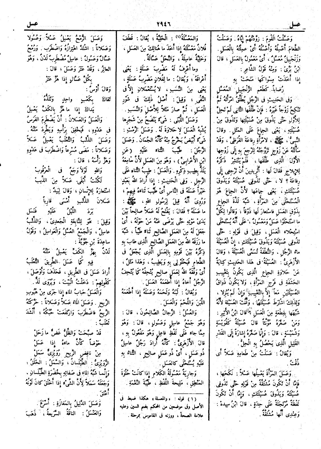 ( * قوله « والمعسلة » هكذا ضبط في الأصل وفي موضعين من المحكم بضم السين وعليه علامة الصحة ووزنه في القاموس بمرحلة ) الخَلِيَّة يقال قَطَفَ فلان مَعْسُلَتَه إِذا أَخذ ما هنالك من العَسَل وخَلِيَّة عاسِلةٌ والنَّحْل عَسَّالة وما أَعرف له مَضْرِبَ عَسَلة يعني أَعْراقَه ويقال ما لِفُلان مضرِبُ عَسَلَة يعني من النسب لا يستعملان إِلاَّ في النفي وقيل أَصل ذلك في شَوْر العَسَل ثم صار مثلاً للأَصل والنسب وعَسَلُ اللُّبْنى شيءٌ يَنْضَحُ من شَجَرِها يُشْبِه العَسَل لا حَلاوة له وعَسَلُ الرِّمْث شيء أَبيض يخرج منه كأَنَّه الجُمَان وعَسَلَ الرجُلَ طَيَّب الثناءَ عليه عن ابن الأَعرابي وهو من العَسَل لأَن سامِعَه يَلَذُّ بِطيبِ ذِكْرِه والعَسَلُ طِيبُ الثناء على الرجل وفي الحديث إِذا أَراد الله بعبد خيراً عَسَلَه في الناس أَي طَيَّب ثَناءه فيهم وروي أَنه قيل لرسول الله صلى الله عليه وسلم ما عَسَلَه ؟ فقال يَفْتَح له عَمَلاً صالحاً بين يَدَيْ موته حتى يَرْضى عنه مَنْ حَوْلَه أَي جَعَل له من العمل الصالح ثناء طَيِّباً شَبَّه ما رَزَقَه اللهُ من العمل الصالح الذي طاب به ذِكْرُه بين قومه بالعَسَل الذي يُجْعَل في الطعام فَيَحْلَوْلي به ويَطِيب وهذا مَثَلٌ أَي وفَّقَه الله لعمل صالح يُتْحِفه كما يُتْحِف الرجل أَخاه إِذا أَطعمه العَسَل ويقال لَبَنَهُ ولَحَمه وعَسَلَهُ إِذا أَطعمه اللبن واللحم والعَسَل والعُسُلُ الرجال الصالحون قال وهو جمع عاسِلٍ وعَسُول قال وهو مما جاء على لفظ فاعل وهو مفعول به قال الأَزهري كأَنه أَراد رجل عاسِلٌ ذو عَسَل أَي ذو عَمَلٍ صالِحٍ الثَّناء به عليه يُسْتَحْلى كالعَسَل وجارية مَعْسُولة الكلام إِذا كانت حُلْوة المَنْطِق مَلِيحة اللفظ طَيِّبة النَّغْمة وعَسَلَ الرُّمْحُ يَعْسِلُ عَسْلاً وعُسُولاً وعَسَلاناً اشْتَدَّ اهتزازُه واضْطَرَب ورُمْحٌ عَسَّالٌ وعَسُولٌ عاسِلٌ مُضْطَرِبٌ لَدْنٌ وهو العاتِرُ وقد عَتَرَ وعَسَلَ قال بكُلِّ عَسَّالٍ إِذا هُزَّ عَتَر وقال أَوس تَقاكَ بكَعْبٍ واحدٍ وتَلَذُّه يَداكَ إِذا ما هُزَّ بالكَفِّ يَعْسِلُ والعَسَلُ والعَسَلانُ أَن يَضْطَرِم الفرسُ في عَدْوِه فيَخْفِق برأْسه ويَطَّرِد مَتْنُه وعَسَل الذِّئْبُ والثعلبُ يَعْسِلُ عَسَلاً وعَسَلاناً مَضَى مُسْرِعاً واضْطَرب في عَدْوِه وهَزَّ رأْسَه قال واللهِ لولا وَجَعٌ في العُرْقُوب لكُنْتُ أَبْقَى عَسَلاً من الذِّيب استعاره للإِنسان وقال لبيد عَسَلانَ الذِّئْب أَمْسَى قارِباً بَرَدَ اللَّيْلُ عليه فنَسَل وقيل هو للنابغة الجعدي والذئب عاسِلٌ والجمع العُسَّل والعَواسِل وقول ساعدة بن جُؤَيَّة لَدْنٌ بِهَزِّ الكَفِّ يَعْسِلُ مَتْنُه فيه كما عَسَلَ الطَّريقَ الثَّعْلَبُ أَراد عَسَلَ في الطريق فحذف وأَوْصل كقولهم دَخَلْتُ البيت ويروى لَذٌّ والعَسَلُ حَبابُ الماء إِذا جَرَى من هُبوب الرِّيح وعَسَلَ الماءُ عَسَلاً وعَسَلاناً حَرَّكَتْه الريحُ فاضْطَرَب وارْتَفَعَتْ حُبُكُه أَنشد ثعلب قد صبَّحَتْ والظِّلُّ غَضٌّ ما زَحَل حَوْضاً كأَنَّ ماءه إِذا عَسَل من نافِضِ الرِّيحِ رُوَيْزِيٌّ سَمَل الرُّوَيْزِيُّ الطَّيْلَسانُ والسَّمَل الخَلَق وإِنما شَبَّه الماءَ في صَفائه بخُضْرة الطَّيْلَسان وجعله سَمَلاً لأَن الشيء إِذا أَخْلَق كان لونُه أَعْتَق وعَسَلَ الدَّليلُ بالمَفازة أَسرع والعَنْسَل الناقةُ السريعة ذهب