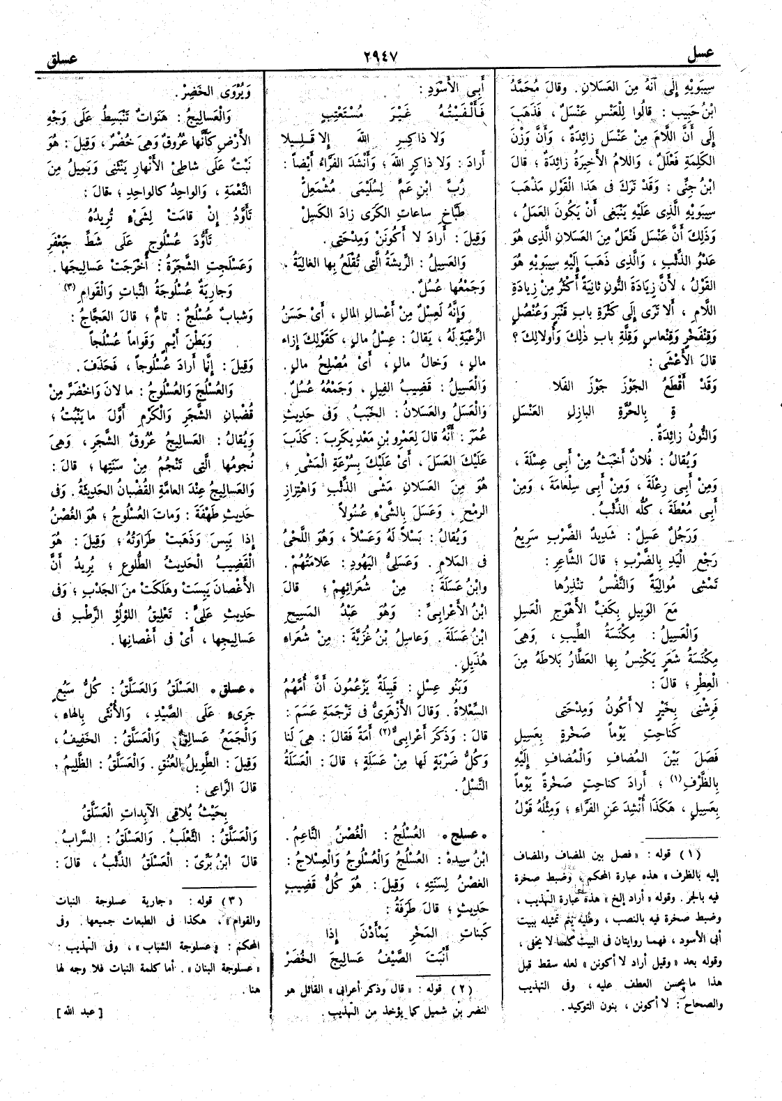 ( * قوله « فصل بين المضاف والمضاف إليه بالظرف » هذه عبارة المحكم وضبط صخرة فيه بالجر وقوله « أراد إلخ » هذه عبارة التهذيب وضبط صخرة فيه بالنصب وعليه يتم تمثيله ببيت أبي الأسود فهما روايتان في البيت كما لا يخفى وقوله بعد « وقيل أراد لا أكونن » لعله سقط قبل هذا ما يحسن العطف عليه وفي التهذيب والصحاح لا أكونن بنون التوكيد ) أَراد كناحِتٍ صَخْرةً يوماً بعَسِيلٍ هكذا أُنشد عن الفراء ومثله قول أَبي الأَسود فأَلْفَيْتُه غَيْرَ مُسْتَعْتِبٍ ولا ذاكِرِ اللهَ إِلا قليلا أَراد ولا ذاكِرٍ اللهَ وأَنشد الفراء أَيضاً رُبَّ ابْن عَمٍّ لسُلَيْمَى مُشْمَعِلْ طَبَّاخِ ساعاتِ الكَرَى زادَ الكَسِلْ وقيل أَراد لا أَكونَنْ ومِدْحَتي والعَسيل الرِّيشة التي تُقْلَع بها الغالِية وجمعها عُسُلٌ وإِنه لَعِسْلٌ من أَعْسالِ المالِ أَي حَسَنُ الرِّعية له يقال عِسْلُ مالٍ كقولك إِزاء مالٍ وخالُ مالٍ أَي مُصْلح مالٍ والعَسيل قَضيب الفيل وجمعه عُسُلٌ والعَسَلُ والعَسَلانُ الخبَب وفي حديث عمر أَنه قال لعمرو بن مَعْدِيكَرِب كَذَبَ عليْك العَسَلَ أَي عليْك بسُرْعة المَشْي هو من العَسَلان مَشْيِ الذئب واهتزاز الرمح وعَسَلَ بالشيء عُسُولاً ويقال بَسْلاً له وعَسْلاً وهو اللَّحْيُ في المَلام وعَسَلِيُّ اليهودِ علامَتُهم وابن عَسَلة من شعرائهم قال ابن الأَعرابي وهو عَبْدالمَسيح بن عَسَلة وعاسِلُ بن غُزَيَّة من شُعَراء هُذَيل وبَنُو عِسْلٍ قَبيلةٌ يزعمون أَن أُمَّهم السِّعْلاة وقال الأَزهري في ترجمة عسم قال وذكر أَعرابي