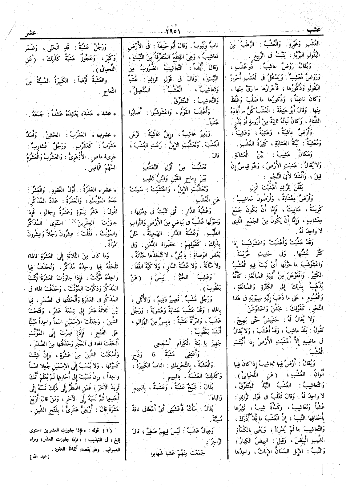 العُشْبِ وغيره والعُشْبُ الرَّطْبُ من البُقول البَرِّيَّة يَنْبُتُ في الربيع ويقال رَوض عاشِبٌ ذو عُشْبٍ وروضٌ معْشِبٌ ويدخل في العُشْب أَحرارُ البُقول وذكورُها فأَحرارُها ما رَقَّ منها وكان ناعماً وذكورُها ما صَلُبَ وغَلُظَ منها وقال أَبو حنيفة العُشْبُ كُلُّ ما أَبادَهُ الشتاءُ وكان نَباته ثانيةً من أَرُومةٍ أَو بَذْرٍ وأَرضٌ عاشِبَةٌ وعَشِبَةٌ وعَشِيبةٌ ومُعْشِبَةٌ بَيِّنةُ العَشابةِ كثيرة العُشْبِ ومكانٌ عَشِيبٌ بَيِّنُ العَشابة ولا يقال عَشَبَتِ الأَرضُ وهو قياسٌ إِن قيل وأَنشد لأَبي النجم يَقُلْنَ للرائدِ أَعْشَبْتَ انْزِلِ وأَرضٌ مِعْشابة وأَرَضُونَ مَعاشِيبُ كريمةٌ مَنابيتُ فإِما أَن يكون جمعَ مِعْشاب وإِما أَن يكون من الجمع الذي لا واحد له وقد عَشَّبَتْ وأَعْشَبَتْ واعْشَوْشَبَتْ إِذا كَثُر عُشْبها وفي حديث خُزَيمة واعْشَوْشَبَ ما حَوْلَها أَي نَبَتَ فيه العُشْبُ الكثير وافْعَوْعَلَ من أَبنية المُبالغة كأَنه يُذْهَبُ بذلك إِلى الكثرة والمبالغة والعُموم على ما ذهب إِليه سيبويه في هذا النحو كقولك خَشُنَ واخْشَوْشَنَ ولا يقال له حَشيش حتى يَهِيجَ تقول بَلَدٌ عاشِبٌ وقد أَعْشَبَ ولا يقال في ماضيه إِلا أَعْشَبَتِ الأَرضُ إِذا أَنبتت العُشْبَ ويُقال أَرض فيها تَعاشِيبُ إِذا كان فيها أَلوانُ العُشْبِ عن اللحياني والتَّعاشِيبُ العُشْبُ النَّبْذُ المُتَفَرِّقُ لا واحدَ له وقال ثعلب في قول الرائِد عُشْباً وتَعاشيبْ وكَمْأَةً شِيبْ تُثِيرُها بأَخْفافِها النِّيبْ إِن العُشْبَ ما قد أَدْرَكَ والتَّعاشِيبُ ما لم يُدْرك ويعني بالكَمْأَةِ الشِّيبِ البِيضَ وقيل البِيضُ الكِبارُ والنِّيبُ الإِبلُ المَسَانُّ الإِناثُ واحدها نابٌ ونَيُوبٌ وقال أَبو حنيفة في الأَرض تَعاشِيبُ وهي القِطَعُ المُتَفَرِّقَة من النَّبْتِ وقال أَيضاً التَّعاشِيبُ الضروبُ من النَّبْت وقال في قولِ الرائدِ عُشْباً وتَعاشِيبْ العُشْبُ المُتَّصِلُ والتَّعاشِيبُ المتفَرِّق وأَعْشَبَ القومُ واعْشَوْشَبُوا أَصابُوا عُشْباً وبعيرٌ عاشِبٌ وإِبِلٌ عاشِبَةٌ تَرْعَى العُشْبَ وتَعَشَّبَت الإِبل رَعَتِ العُشْبَ قال تَعَشَّبَتْ من أَوَّلِ التَّعَشُّبِ - بينَ رِماحِ القَيْنِ وابْنَيْ تَغْلِبِ وتَعَشَّبَتِ الإِبلُ واعْتَشَبَتْ سَمِنَتْ عن العُشْب وعُشْبَةُ الدار التي تَنْبُتُ في دِمْنَتها وحَوْلَها عُشْبٌ في بَياضٍ من الأَرض والتُّراب الطَّيِّبِ وعُشْبةُ الدارِ الهَجينَةُ مَثَلٌ بذلك كقولهم خَضْراءُ الدِّمَنِ وفي بعض الوَصاةِ يا بُنَيَّ لا تَتَّخِذْها حَنَّانةً ولا مَنَّانة ولا عُشْبةَ الدار [ ص 602 ] ولا كَيَّةَ القَفَا وعَشِبَ الخُبْزُ يَبِسَ عن يعقوب ورجل عَشَبٌ قصير دَمِيمٌ والأُنثى بالهاءِ وقد عَشُبَ عَشابةً وعُشوبةً ورجل عَشَبٌ وامرأَة عَشَبةٌ يابسٌ من الهُزال أَنشد يعقوب