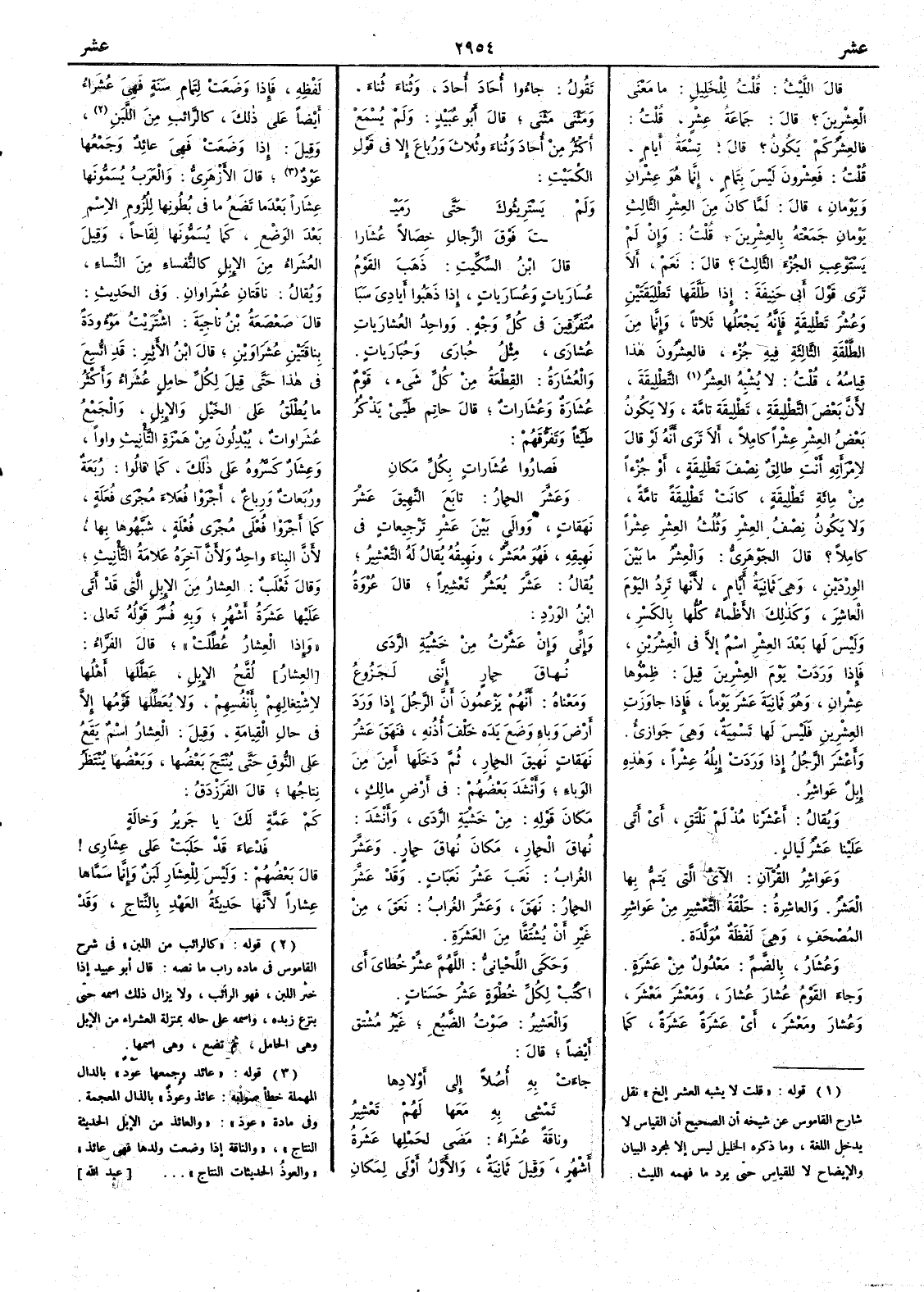 قال الليث قلت للخليل ما معنى العِشْرِين ؟ قال جماعة عِشْر قلت فالعِشْرُ كم يكون ؟ قال تِسعةُ أَيام قلت فعِشْرون ليس بتمام إِنما هو عِشْران ويومان قال لما كان من العِشْر الثالث يومان جمعته بالعِشْرين قلت وإِن لم يستوعب الجزء الثالث ؟ قال نعم أَلا ترى قول أَبي حنيفة إِذا طَلَّقها تطليقتين وعُشْرَ تطليقة فإِنه يجعلها ثلاثاً وإِنما من الطلقة الثالثة فيه جزء فالعِشْرون هذا قياسه قلت لا يُشْبِهُ العِشْرُ