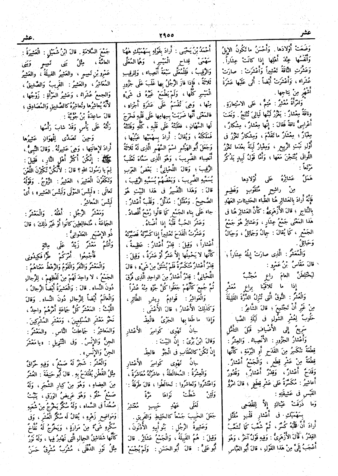 وضعت أَولادها وأَحْسَن ما تكون الإِبل وأَنْفَسُها عند أَهلها إِذا كانت عِشَاراً وعَشَّرَت الناقةُ تَعْشِيراً وأَعْشَرَت صارت عُشَراء وأَعْشَرت أَيضاً أَتى عليها عَشَرَةُ أَشهر من نتاجها وامرأَة مُعْشِرٌ مُتِمٌّ على الاستعارة وناقة مِعْشارٌ يَغْزُر لبنُها ليالي تُنْتَج ونَعتَ أَعرابي ناقةً فقال إِنها مِعْشارٌ مِشْكارٌ مِغْبَارٌ مِعْشَارٌ ما تقدم ومِشكارٌ تَغْزُر في أَول نبت الربيع ومِغْبارٌ لَبِنةٌ بعدما تَغْزُرُ اللواتي يُنْتَجْن معها وأَما قول لبيد يذكر مَرْتَعاً هَمَلٌ عَشائِرُه على أَوْلادِها مِن راشح مُتَقَوّب وفَطِيم فإِنه أَراد بالعَشائِر هنا الظباءَ الحدِيثات العهد بالنتاج قال الأَزهري كأَنَّ العَشائرَ هنا في هذا المعنى جمع عِشَار وعَشائرُ هو جمع الجمع كما يقال جِمال وجَمائِل وحِبَال وحَبائِل والمُعَشِّرُ الذي صارت إِبلُه عِشَاراً قال مَقّاس ابن عمرو ليَخْتَلِطَنَّ العامَ راعٍ مُجَنَّبٌ إِذا ما تلاقَيْنا براعٍ مُعَشِّر والعُشْرُ النُّوقُ التي تُنْزِل الدِّرَّة القليلة من غير أَن تجتمع قال الشاعر حَلُوبٌ لعُشْرِ الشُّولِ في لَيْلةِ الصَّبا سَريعٌ إِلى الأَضْيافِ قبل التأَمُّلِ وأَعْشارُ الجَزورِ الأَنْصِباء والعِشْرُ قطعة تنكَسِرُ من القَدَح أَو البُرْمة كأَنها قطعة من عَشْر قطع والجمع أَعْشارٌ وقَدَحٌ أَعْشارٌ وقِدْرٌ أَعْشَارٌ وقُدورٌ أَعاشِيرُ مكسَّرَة على عَشْرِ قطع قال امرؤ القيس في عشيقته وما ذَرَفَتْ عَيْناكِ إِلا لِتَقدَحِي بِسَهْمَيكِ في أَعْشارِ قَلْب مُقَتَّلِ أَراد أَن قلبه كُسِّرَ ثم شُعِّبَ كما تُشَعَّبُ القِدْرُ قال الأَزهري وفيه قول آخر وهو أَعجب إِليّ من هذا القول قال أَبو العباس أَحمد بن يحيى أَراد بقوله بسَهْمَيْكِ ههنا سَهْمَيْ قِداح المَيْسِر وهما المُعَلَّى والرَّقيب فللمُعَلَّى سبعة أَنْصِباء وللرقيب ثلاثة فإِذا فاز الرجل بهما غلَب على جَزورِ المَيْسرِ كلها ولم يَطْمَعْ غيرُه في شيء منها وهي تُقْسَم على عَشَرة أَجزاء فالمعنى أَنها ضَربت بسهامها على قلبه فخرج لها السهام فغَلبته على قَلْبه كلِّه وفَتَنته فَمَلَكَتْه ويقال أَراد بسهْمَيْها عَيْنَيْها وجعل أَبو الهيثم اسم السهم الذي له ثلاثة أَنْصِباء الضَّرِيبَ وهو الذي سماه ثعلب الرَّقِيب وقال اللحياني بعض العرب يُسمّيه الضَّرِيبَ وبعضهم يسمّيه الرقيب قال وهذا التفسير في هذا البيت هو الصحيح ومُقَتَّل مُذَلَّل وقَلْبٌ أَعْشارٌ جاء على بناء الجمع كما قالوا رُمْح أَقْصادٌ وعَشّرَ الحُبُّ قَلْبَه إِذا أَضْناه وعَشَّرْت القَدَحَ تَعْشِيراً إِذا كسَّرته فصيَّرته أَعْشاراً وقيل قِدْرٌ أَعشارٌ عظيمة كأَنها لا يحملها إِلا عَشْرٌ أَو عَشَرةٌ وقيل قِدْرٌ أَعْشارٌ متكسِّرة فلم يشتق من شيء قال اللحياني قِدر أَعشارٌ من الواحد الذي فُرِّقَ ثم جُمِع كأَنهم جعلوا كل جزء منه عُشْراً والعواشِرُ قوادمُ ريش الطائر وكذلك الأَعْشار قال الأَعشى وإِذا ما طغا بها الجَرْيُ فالعِقْ بانُ تَهْوِي كَواسِرَ الأَعْشارِ وقال ابن بري إِن البيت إِن تكن كالعُقَابِ في الجَوّ فالعِقْ بانُ تَهْوِي كَواسِرَ الأَعْشار والعِشْرَةُ المخالطة عاشَرْتُه مُعَاشَرَةً واعْتَشَرُوا وتَعاشَرُوا تخالطوا قال طَرَفة ولَئِنْ شَطَّتْ نَوَاهَا مَرَّةَ لَعَلَى عَهْد حَبيب مُعْتَشِرْ جعل الحَبيب جمعاً كالخَلِيط والفَرِيق وعَشِيرَة الرجل بنو أَبيه الأَدْنَونَ وقيل هم القبيلة والجمع عَشَائر قال أَبو علي قال أَبو الحسن ولم يُجْمَع جمع السلامة قال ابن شميل العَشِيرَةُ العامّة مثل بني تميم وبني عمرو بن تميم والعَشِيرُ القبيلة والعَشِيرُ المُعَاشِرُ والعَشِيرُ القريب والصديق والجمع عُشَراء وعَشِيرُ المرأَة زوجُها لأَنه يُعاشِرها وتُعاشِرُه كالصديق والمُصَادِق قال ساعدة بن جؤية رأَتْه على يَأْسٍ وقد شابَ رَأْسُها وحِينَ تَصَدَّى لِلْهوَانِ عَشِيرُها أَراد لإِهانَتِها و