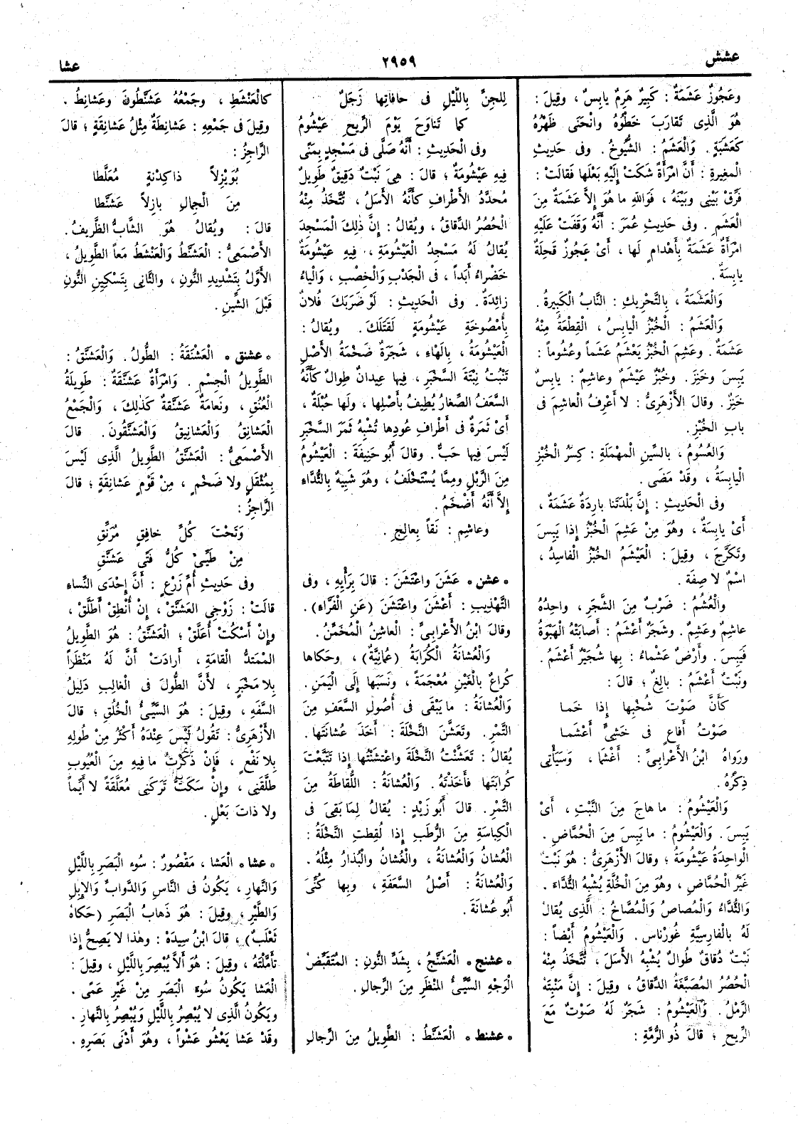 ( عشن ) عَشَنَ واعْتَشَنَ قال برأْيه وفي التهذيب أَعْشَنَ واعْتَشَنَ عن الفراء وقال ابن الأَعرابي العاشِنُ المُخمِّنُ والعُشانة الكَرَبَةُ عُمانية وحكاها كراع بالغين معجمة ونسبها إلى اليمن والعُشانةُ ما يبقى في أُصول السعف من التمر وتعَشَّنَ النخلةَ أَخذَ عُشانتَها يقال تعَشَّنْتُ النخلة واعْتَشَنْتُها إذا تتبَّعْتَ كُرابتَها فأَخذته والعُشانة اللُّقاطة من التمر قال أَبو زيد يقال لما بقي في الكِباسَة من الرُّطَبِ إذا لُقِطت النخلة العُشانُ والعُشانةُ والغُشانُ والبُذَارُ مثله والعُشانة أَصلُ السَّعَفة وبها كُنِّيَ أَبو عُشانة ( عشنج ) العَشَنَّج بشدّ النون المُتَقَبِّض الوجه السيِّءُ المنظر من الرجال ( عشنط ) العشَنَّطُ الطويل من الرجال كالعَنْشَطِ وجمعه عَشَنَّطُونَ وعَشانِطُ وقيل في جمعه عَشانِطةٌ مثل عَشانِقةٍ قال الراجز بُوَيْزِلاً ذا كِدْنةٍ مُعَلَّطا من الجِمالِ بازِلاً عَشَنَّطا قال ويقال هو الشابُّ الظَّريفُ الأَصمعي العَشَنَّطُ والعَنْشَطُ معاً الطويل الأَول بتشديد النون والثاني بتسكين النون قبل الشين ( عشنق ) العَشْنَقة الطول والعَشَنَّقُ الطويل الجسم وامرأَة عَشَنَّقَةٌ طويلة العنق ونعامةٌ عَشَنَّقةٌ كذلك والجمع العَشانِقُ والعَشانيقُ والعَشَنَّقُون قال الأَصمعى العَشَنَّقُ الطويل الذي ليس بمُثْقَلٍ ولا ضخم من قوم عَشانِقَة قال الراجز وتحتَ كُلّ خافِقٍ مُرَنِّقَ من طَيِّءٍ كلُّ فَتىً عَشَنَّقِ وفي حديث أُم زرع أَن إِحدى النساء قالت زَوجي العَشَنَّق إِن أَنْطِقْأُطَلَّقْ وإِن أَسْكُتْ أُعَلَّق العَشَنَّقُ هو الطويل الممتد القامة أَرادت أَن له مَنْظَراً بلا مَخْبَرٍ لأَن الطول في الغالب دليل السَّفَه وقيل هو السيِّء الخلق قال الأَزهري تقول ليس عنده أَكثر من طوله بلا نفع فإِن ذكرتُ ما فيه من العيوب طلَّقني وإِن سَكَتَّ تركني معلقة لا أَيّماً ولا ذات بَغْلٍ ( عشا ) العَشا مقصورٌ سوءُ البَصَرِ بالليلِ والنهارِ يكونُ في الناسِ والدَّوابِّ والإبلِ والطَّيرِ وقيل هو ذَهابُ البَصَرِ حكاه ثعلب قال ابن سيده وهذا لا يصحُّ إذا تأَمَّلته وقيل هو أَن لا يُبْصِر بالليل وقيل العَشا يكونُ سُوءَ البصَرِ من غيرِ عَمًى ويكونُ الذي لا يُبْصِرُ باللَّيْلِ ويُبْصِرُ بالنَّهارِ وقد عَشا يَعْشُو عَشْواً وهو أَدْنَى بَصَرِه