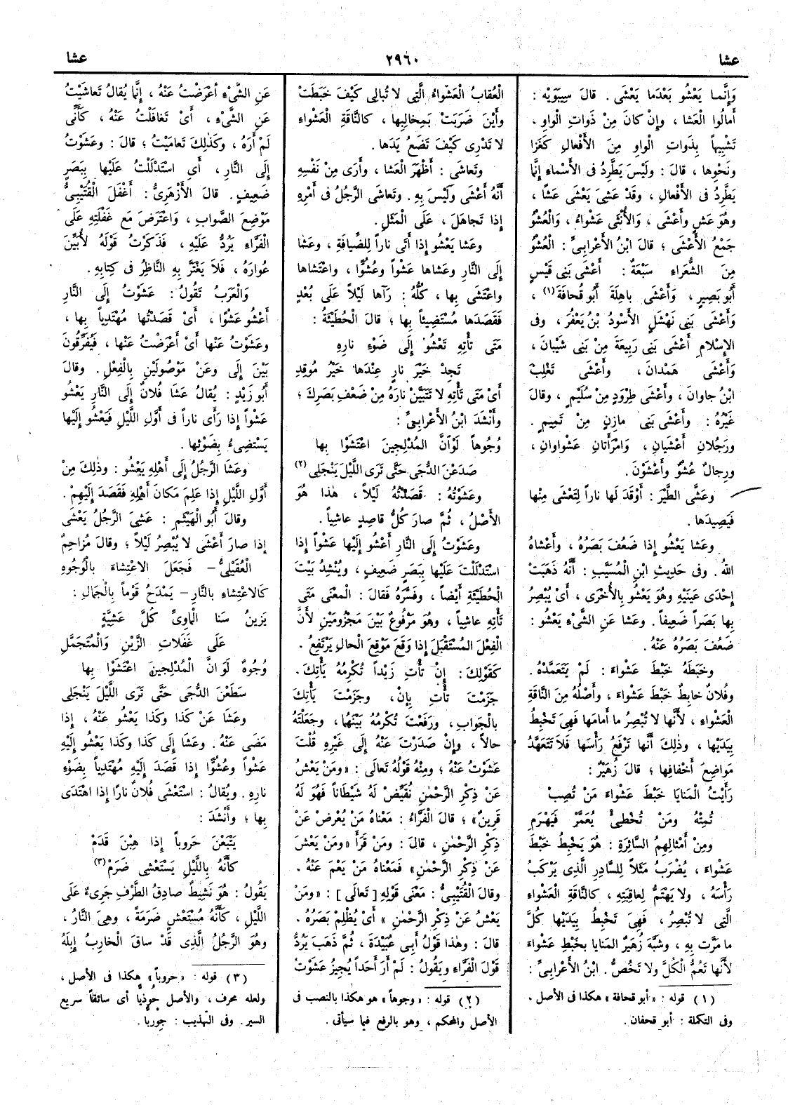وعَشَوْتُه قَصَدْتُه ليلاً هذا هو الأَصْلُ ثم صار كلُّ قاصِدٍ عاشِياً وعَشَوْت إِلى النارِ أَعْشُو إِليها عَشْواً إِذا اسْتَدْلَلْتَ عليها بِبَصَرٍ ضَعيفٍ ويُنْشد بيت الحُطيئة أَيضاً وفسَّره فقال المعنى متى تَأْتِه عاشِياً وهو مَرْفُوعٌ بين مَجْزُومَيْن لأَن الفعلَ المُسْتَقْبَل إِذا وَقَع مَوقِعَ الحال يَرْتَفِع كقولك إِن تأْتِ زيداً تُكْرِمُه يَأْتِكَ جَزَمْتَ تأْتِ بأَنْ وجَزَمْتَ يأْتِكَ بالجواب ورفَعْتَ تُكْرِمُه بينهما وجَعَلْتَه حالاً وإِن صَدَرْت عنه إِلى غيره قلت عَشَوْتُ عنه ومنه قوله تعالى ومَن يَعْشُ عن ذكْرِ الرَّحْمن نُقَيِّضْ له شيطاناً فهو له قَرينٌ قال الفراء معناه من يُعْرضْ عن ذكر الرحمن قال ومن قرأَ ومَن يَعْشُ عن ذكر الرحمن فمعناه مَن يَعْمَ عنه وقال القُتَيبي معنى قوله ومَنْ يَعْشُ عن ذكر الرحمن أَي يُظْلِمْ بَصَرُه قال وهذا قولُ أَبي عبيدة ثم ذهب يَرُدُّ قولَ الفراء ويقول لم أَرَ أَحداً يُجيزُ عَشَوْتُ عن الشيء أَعْرَضْتُ عنه إِنما يقال تَعاشَيْتُ عن الشيء أَي تَغافَلْت عنه كأَني لم أَرَهُ وكذلك تعامَيْت قال وعَشَوْتُ إِلى النار أَي اسْتَدْلَلْت عليها ببَصَرٍ ضعيف قال الأَزهري أَغْفَل القُتَيْبي موضعَ الصوابِ واعْتَرَض مع غَفْلَتِه على الفراء يَرُدُّ عليه فذكرت قوله لأَبَيِّن عُوارَه فلا يَغْتَرَّ به الناظرُ في كتابه والعرب تقول عَشَوْتُ إِلى النار أَعْشُو عَشْواً أَي قَصَدتُها مُهْتَدِياً بها وعَشَوْتُ عنها أَي أَعْرَضْت عنها فيُفرِّقون بين إِلى وعَنْ موصولَيْن بالفعل وقال أَبو زيد يقال عَشَا فلانٌ إِلى النار يَعْشُو عَشْواً إِذا رأَى ناراً في أَوَّل الليل فيَعْشُو إِليها يَسْتضِيءُ بضَوْئها وعَشَا الرجلُ إِلى أَهلِه يَعْشُو وذلك من أَوَّل الليل إِذا عَلِمَ مكانَ أَهلِه فقَصدَ إِليهم وقال أَبو الهيثم عَشِيَ الرجلُ يَعْشى إِذا صار أَعْشى لا يُبْصِرُ لَيْلاً وقال مُزاحِمٌ العُقَيْلي فجعَل الاعتِشاء بالوجوه كالاعتشاء بالنار يَمْدَحُ قوماً بالجمال يَزينُ سَنا الماوِيِّ كلَّ عَشيَّةٍ على غَفلات الزَّيْنِ والمُتَجَمَّلِ وُجُوهٌ لوَانَّ المُدْلِجينَ اعْتَشَوْا بها سَطَعْنَ الدُّجى حتى ترَى الليْلَ يَنْجَلي وعَشَا عن كذا وكذا يَعْشُو عنه إِذا مَضى عنه وعَشَا إِلى كذا وكذا يَعْشُو إِليه عَشْواً وعُشُوّاً إِذا قَصَد إِليه مُهْتَدِياً بضَوْء نارِه ويقال اسْتَعْشَى فلانٌ ناراً إِذا اهْتَدى بها وأَنشد يَتْبعن حروباً إِذا هِبْنَ قَدَمْ كأَنه باللَّيْلِ يَسْتَعْشِي ضَرَم