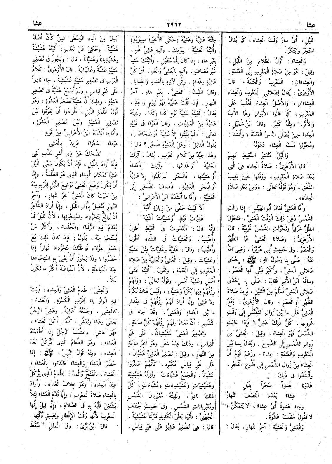 قال الأَزهري صَلاةُ العِشاءِ هي التي بعدَ صلاةِ المَغْرِب ووَقْتُها حينَ يَغِيبُ الشَّفَق وهو قوله تعالى ومن بعد صلاةِ العِشاءِ وأَما العَشِيُّ فقال أَبو الهيثم إِذا زالت الشَّمْسُ دُعِي ذلك الوقتُ العَشِيَّ فَتَحَوَّلَ الظلُّ شَرْقِيّاً وتحوَّلت الشمْسُ غَرْبيَّة قال الأَزهري وصلاتا العَشِيِّ هما الظُّهْر والعَصْر وفي حديث أَبي هريرة رضي الله عنه صلى بنا رسولُ الله صلى الله عليه وسلم إحْدى صلاتَي العشيِّ وأَكْبَرُ ظَني أَنها العَصْر وساقه ابن الأَثير فقال صَلى بنا إحْدى صلاتي العَشِيِّ فسَلَّم من اثْنَتَيْن يريدُ صلاةَ الظُّهْر أَو العَصْر وقال الأَزهري يَقَع العشيُّ على ما بَيْنَ زَوالِ الشمْسِ إلى وَقْت غُروبها كل ذلك عَشِيٌّ فإذا غابَتِ الشَّمْسُ فهو العِشاءُ وقيل العَشِيُّ منْ زَوالِ الشَّمْس إِلى الصَّباح ويقال لِما بين المَغْرِب والعَتَمة عِشاءٌ وزعم قوم أَنَّ العشاء من زَوال الشمس إِلى طُلوع الفَجْر وأَنشدوا في ذلك غَدَوْنا غَدْوَةً سَحَراً بليْلٍ عِشاءً بعدَما انْتَصف النَّهارُ وجاء عَشْوةَ أَي عِشاءً لا يتمكَّن لا تقول مضتْ عَشْوَةٌ والعَشِيُّ والعَشِيَّةُ آخرُ النهار يقال جئتُه عَشِيَّةً وعَشِيَّةً حكى الأَخيرةَ سيبويه وأَتَيْتُه العَشِيَّةَ ليوْمِكَ وآتيه عَشِيَّ غدٍ بغير هاءٍ إِذا كان للمُسْتَقبل وأَتَيتك عَشِيّاً غير مضافٍ وآتِيه بالعَشِيِّ والغد أَي كلَّ عَشيَّة وغَداةٍ وإِني لآتيه بالعشايا والغَدايا وقال الليث العَشِيُّ بغير هاءٍ آخِرُ النهارِ فإِذا قلت عَشية فهو لِيوْم واحدٍ يقال لقيته عَشِيَّةَ يوم كذا وكذا ولَقِيته عَشِيَّةَ من العَشِيّات وقال الفراء في قوله تعالى لم يَلْبَثُوا إِلاَّ عَشِيَّة أَو ضُحاها يقول القائلُ وهل للعَشِيَّة ضُحًى ؟ قال وهذا جَيِّد من كلام العرب يقال آتِيك العَشِيَّةَ أَو غداتَها وآتيك الغَداةَ أَو عَشِيَّتَها فالمعنى لم يَلْبثوا إِلاَّ عَشِيَّة أَو ضُحى العَشِيَّة فأَضاف الضُّحى إِلى العَشِيَّة وأَما ما أَنشده ابن الأَعرابي أَلا لَيتَ حَظِّي من زِيارَةِ أُمِّيَهْ غَدِيَّات قَيْظٍ أَو عَشِيَّات أَشْتِيَهْ فإِنه قال الغَدَوات في القَيْظ أَطْوَلُ وأَطْيَبُ والعَشِيَّاتُ في الشِّتاءِ أَطولُ وأَطيبُ وقال غَدِيَّةٌ وغَدِيَّات مثلُ عَشِيَّةٍ وعَشِيَّات وقيل العَشِيُّ والعَشِيَّة من صلاةِ المَغْرِب إلى العَتمة وتقول أَتَيْتُه عَشِيَّ أَمْسِ وعَشِيَّة أَمْسِ وقوله تعالى ولهمْ رزْقُهمْ فيها بُكرَةً وعَشِيَّاً وليسَ هُناك بُكْرَةٌ ولا عَشِيٌّ وإنما أَراد لهُم رزْقُهُم في مِقْدار بين الغَداةِ والعَشِيِّ وقد جاء في التَّفْسِير أَنَّ معْناه ولهُمْ رِزْقُهُم كلَّ ساعةٍ وتصٌغِيرُ العَشِيِّ عُشَيْشِيانٌ على غير القياس وذلك عند شَفىً وهو آخِرُ ساعةٍ من النَّهار وقيل تصغير العَشِيِّ عُشَيَّانٌ على غير قياس مُكَبَّره كأنهم صَغَّروا عَشيْاناً والجمع عُشَيَّانات ولَقِيتُه عُشَيْشِيَةً وعُشَيْشِيَاتٍ وعُشَيْشِياناتٍ وعُشَيَّانات كلُّ ذلك نادر ولقيته مُغَيْرِبانَ الشَّمْسِ ومُغَيْرِباناتِ الشَّمْسِ وفي حديث جُنْدَب الجُهَني فأَتَيْنا بَطْنَ الكَديد فنَزَلْنا عُشَيْشِيَةً قال هي تصغير عَشِيَّة على غير قياس أُبْدلَ من الياء الوُسْطى شِينٌ كأَنّ أَصلَه عُشَيِّيةً وحكي عن ثعلب أَتَيْتُه عُشَيْشَةً وعُشَيْشِياناً وعُشيَّاناً قال ويجوز في تَصْغيرِ عَشِيَّةٍ عُشَيَّة وعُشَيْشِيَةٌ قال الأَزهري كلام العرب في تصغير عَشِيَّة عُشَيْشِيَةٌ جاء نادراً على غير قياس ولم أَسْمَع عُشَيَّة في تصغير عَشيَّة وذلك أَنَّ عُشَيَّة تصْغِيرُ العَشْوَة وهو أَولُ ظُلْمة الليل فأَرادوا أَن يَفْرُقوا بين تصغير العَشِيَّة وبين تَصغير العَشْوَة وأَمَّا ما أَنشده ابن الأَعرابي من قوله هَيْفاءُ عَجْزاءُ خَرِيدٌ بالعَشِي تَضْحَكُ عن ذِي أُشُرٍ عَذْبٍ نَقِي فإنه أَراد باللَّيل فإمَّا أَن يك