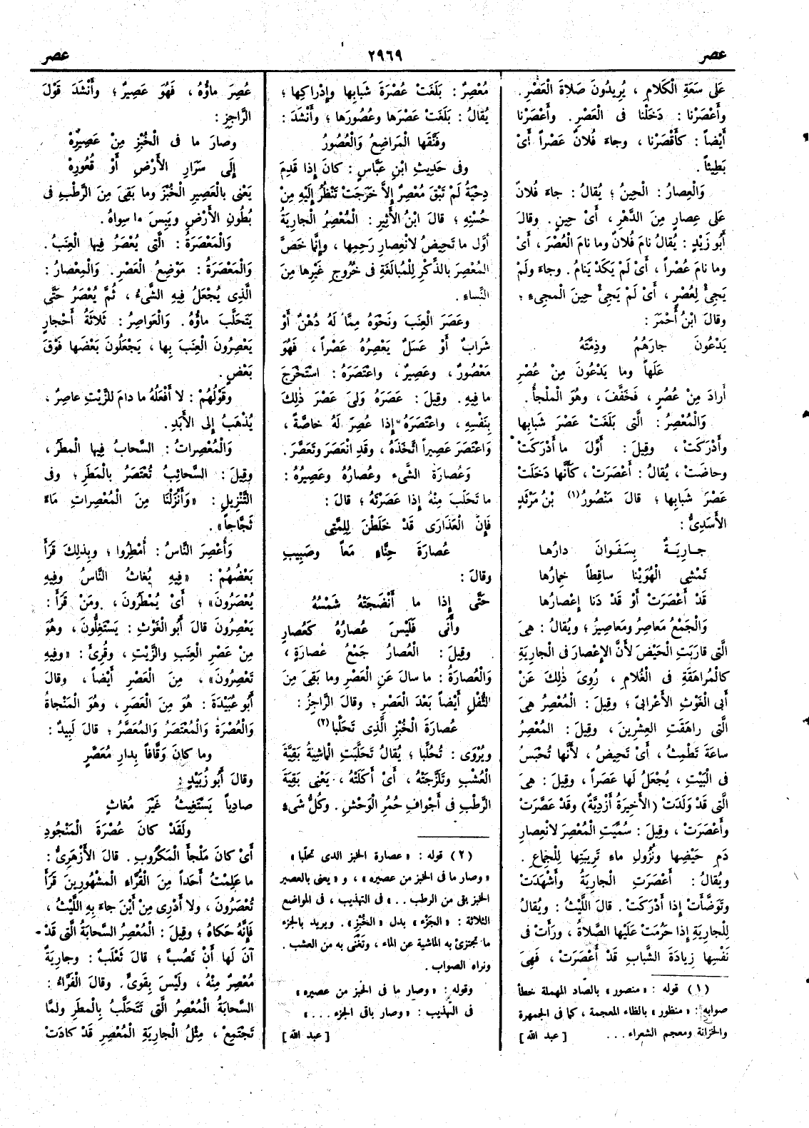 على سَعة الكلام يريدون صلاة العَصْر وأَعْصَرْنا دخلنا في العَصْر وأَعْصَرْنا أَيضاً كأَقْصَرْنا وجاء فلانٌ عَصْراً أَي بَطيئاً والعِصارُ الحِينُ يقال جاء فلان على عِصارٍ من الدهر أَي حين وقال أَبو زيد يقال نام فلانٌ وما نام العُصْرَ أَي وما نام عُصْراً أَي لم يكد ينام وجاء ولم يجئ لِعُصْرٍ أَي لم يجئ حين المجيء وقال ابن أَحمر يَدْعون جارَهُمُ وذِمَّتَه عَلَهاً وما يَدْعُون من عُصْر أَراد من عُصُر فخفف وهو الملجأ والمُعْصِر التي بَلَغَتْ عَصْرَ شبابها وأَدركت وقيل أَول ما أَدركت وحاضت يقال أَعْصَرَت كأَنها دخلت عصر شبابها قال منصور بن مرثد الأَسدي جارية بسَفَوانَ دارُها تَمْشي الهُوَيْنا ساقِطاً خِمارُها قد أَعْصَرَت أَو قَدْ دَنا إِعْصارُها والجمع مَعاصِرُ ومَعاصِيرُ ويقال هي التي قاربت الحيض لأَنّ الإِعصارَ في الجارية كالمُراهَقة في الغُلام روي ذلك عن أَبي الغوت الأَعرابي وقيل المُعْصِرُ هي التي راهقت العِشْرِين وقيل المُعْصِر ساعة تَطْمِث أَي تحيض لأَنها تحبس في البيت يجعل لها عَصَراً وقيل هي التي قد ولدت الأَخيرة أَزْديّة وقد عَصَّرَت وأَعْصَرَت وقيل سميت المُعْصِرَ لانْعِصارِ دم حيضها ونزول ماء تَرِيبَتِها للجماع ويقال أَعْصَرَت الجارية وأَشْهَدَت وتَوضَّأَت إِذا أَدْرَكَت قال الليث ويقال للجارية إِذا حَرُمت عليها الصلاةُ ورأَت في نفسها زيادةَ الشباب قد أَعْصَرت فهي مُعْصِرٌ بلغت عُصْرةَ شبابِها وإِدْراكِها بلغت عَصْرَها وعُصورَها وأَنشد وفَنَّقَها المَراضِعُ والعُصورُ وفي حديث ابن عباس كان إِذا قَدِمَ دِحْيةُ لم يَبْقَ مُعْصِرٌ إِلا خرجت تنظر إِليه من حُسْنِه قال ابن الأَثير المُعْصِرُ الجارية أَول ما تحيض لانْعِصار رَحِمها وإِنما خصَّ المُعْصِرَ بالذِّكر للمبالغة في خروج غيرها من النساء وعَصَرَ العِنَبَ ونحوَه مما له دُهْن أَو شراب أَو عسل يَعْصِرُه عَصْراً فهو مَعْصُور وعَصِير واعْتَصَرَه استخرج ما فيه وقيل عَصَرَه وَليَ عَصْرَ ذلك بنفسه واعْتَصَره إِذا عُصِرَ له خاصة واعْتَصَر عَصِيراً اتخذه وقد انْعَصَر وتَعَصَّر وعُصارةُ الشيء وعُصارهُ وعَصِيرُه ما تحلَّب منه إِذا عَصَرْته قال فإِن العَذَارى قد خَلَطْنَ لِلِمَّتي عُصارةَ حِنَّاءٍ معاً وصَبِيب وقال حتى إِذا ما أَنْضَجَتْه شَمْسُه وأَنى فليس عُصارهُ كعُصارِ وقيل العُصارُ جمع عُصارة والعُصارةُ ما سالَ عن العَصْر وما بقي من الثُّفْل أَيضاً بعد العَصْر وقال الراجز عُصارة الخُبْزِ الذي تَحَلَّبا ويروى تُحْلِّبا يقال تَحَلَّبت الماشية بقيَّة العشب وتَلَزَّجَته أَي أَكلته يعني بقية الرَّطْب في أَجواف حمر الوحش وكل شيء عُصِرَ ماؤه فهو عَصِير وأَنشد قول الراجز وصار ما في الخُبْزِ من عَصِيرِه إِلى سَرَار الأَرض أَو قُعُورِه يعني بالعصير الخبزَ وما بقي من الرَّطْب في بطون الأَرض ويَبِسَ ما سواه والمَعْصَرة التي يُعْصَر فيها العنب والمَعْصَرة موضع العَصْر والمِعْصارُ الذي يجعل فيه الشيء ثم يُعْصَر حتى يتحلَّب ماؤه والعَواصِرُ ثلاثة أَحجار يَعْصِرون العنب بها يجعلون بعضها فوق بعض وقولهم لا أَفعله ما دام للزيت عاصِرٌ يذهب إِلى الأَبَدِ والمُعْصِرات السحاب فيها المطر وقيل السحائب تُعْتَصَر بالمطر وفي التنزيل وأَنزَلْنا من المُعْصِرات ماءً ثجّاجاً وأُعْصِرَ الناسُ أُمْطِرُوا وبذلك قرأَ بعضهم فيه يغاث الناس وفيه يُعْصَرُون أَي يُمْطَرُون ومن قرأَ يَعْصِرُون قال أَبو الغوث يستغِلُّون وهو مِن عَصر العنب والزيت وقرئ وفيه تَعْصِرُون من العَصْر أَيضاً وقال أَبو عبيدة هو من العَصَر وهو المَنْجاة والعُصْرة والمُعْتَصَر والمُعَصَّر قال لبيد وما كان وَقَّافاً بدار مُعَصَّرٍ وقال أَبو زبيد صادِياً يَسْتَغِيثُ غير مُغاثٍ ولقد كان عُصْرة المَنْجود أَي كان ملجأَ المكروب قال الأَزهري ما علمت أَحداً من القُرَّاء المشهورين قرأَ يُعْصَرون ولا أَدري من أَين جاء به الليث ف