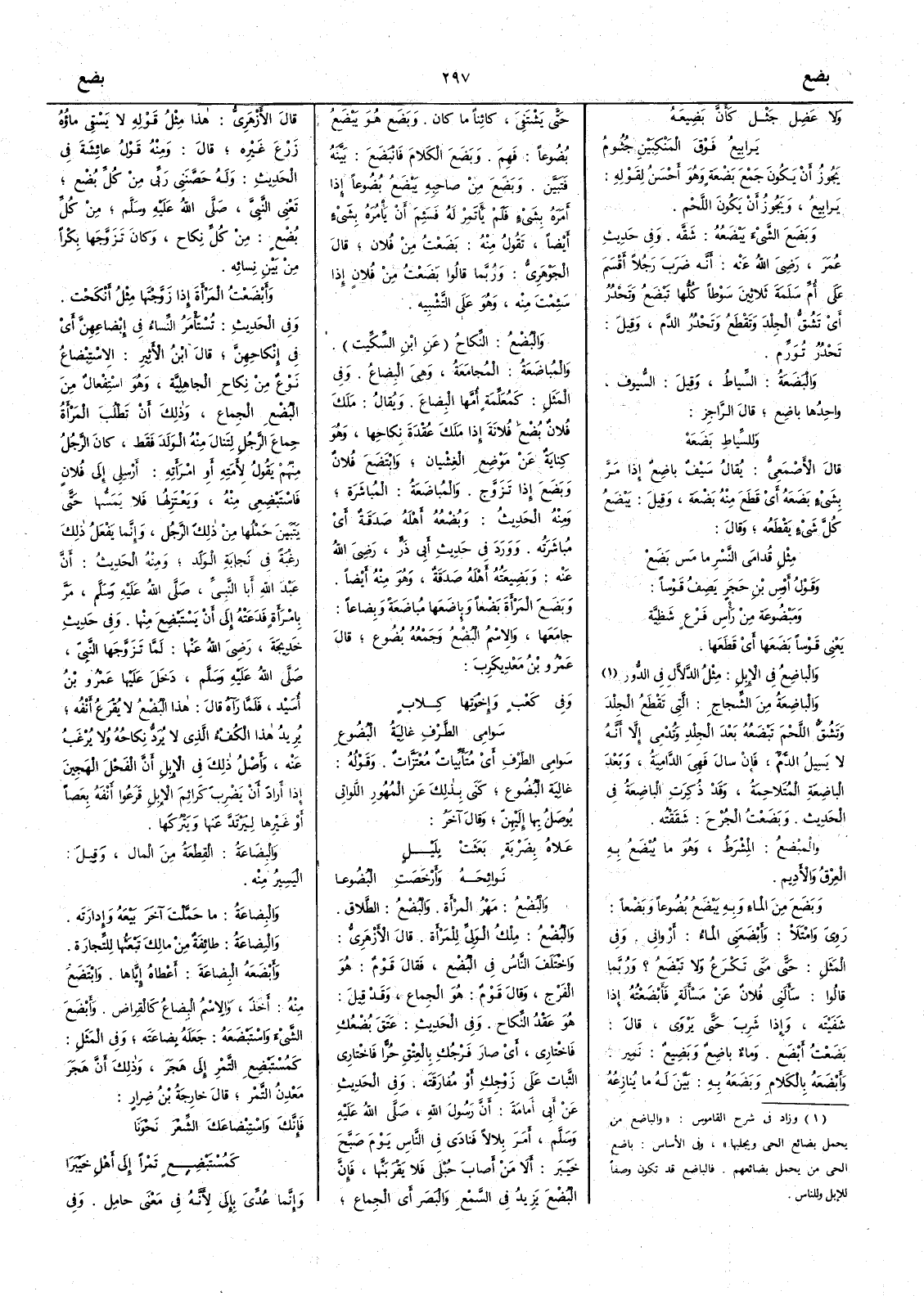 ( * أَي انها تحمل بضائع القوم وتجلبها ) والباضِعةُ من الشِّجاج التي تَقْطع الجلد وتَشُقُّ اللحم تَبْضَعُه بعد الجلد وتُدْمِي إِلا أَنه لا يسيل الدم فإِن سال فهي الدَّامِيةُ وبعد الباضِعة المُتلاحِمةُ وقد ذكرت الباضعة في الحديث وبَضَعْتُ الجُرْحَ شَقَقْتُه والمِبْضَعُ المِشْرَطُ وهو ما يُبْضَعُ به العِرْق والأَدِيم وبَضَعَ من الماء وبه يَبْضَعُ بُضُوعاً وبَضْعاً رَوِيَ وامْتلأ وأَبْضَعني الماءُ أَرْواني وفي المثل حتى متى تَكْرَعُ ولا تَبْضَعُ ؟ وربما قالوا سأَلني فلان عن مسأَلة فأَبْضَعْتُه إِذا شَفَيْتَه وإِذا شرب حتى يَرْوى قال بضَعْت أَبْضَع وماء باضِعٌ وبَضِيع نَمِير وأَبْضَعه بالكلام وبَضَعَه به بَيَّن له ما يُنازِعُه حتى يَشْتَفِيَ كائناً ما كان وبَضع هو يَبْضَعُ بُضُوعاً فَهِمَ وبضَعَ الكلامَ فانْبَضَعَ بيّنَه فتبيَّن وبَضَع من صاحبه يَبْضَع بُضوعاً إذا أَمره بشيء فلم يأْتَمِرْ له فسَئِمَ أَن يأْمره بشيء أَيضاً تقول منه بضعت من فلان قال الجوهري وربما قالوا بضعت من فلان إِذا سَئمْت منه وهو على التشبيه والبُضْعُ النّكاح عن ابن السكيت والمُباضَعةُ المُجامَعةُ وهي البِضاعُ وفي المثل كمُعَلِّمة أُمَّها البِضاع ويقال ملَك فلان بُضْع فلانة إِذا ملَكَ عُقْدة نكاحها وهو كناية عن موضع الغِشْيان وابْتَضَعَ فلان وبضع إِذا تزوّج والمُباضعة المُباشرة ومنه الحديث وبُضْعهُ أَهلَه صَدقةٌ أَي مُباشَرته وورد في حديث أَبي ذر رضي الله عنه وبَضِيعَتُه أَهلَه صدقةٌ وهو منه أَيضاً وبَضَع المرأَةَ بَضْعاً وباضَعها مُباضعة وبِضاعاً جامَعَها والاسم البُضْع وجمعه بُضوع قال عمرو بن معديكرب وفي كَعْبٍ وإِخْوتِها كِلابٍ سَوامي الطَّرْفِ غالِيةُ البُضوعِ سَوامي الطرف أَي مُتأَبِّياتٌ مُعْتزَّاتٌ وقوله غاليةُ البضوع كنى بذلك عن المُهور اللواتي يُوصَل بها إِليهن وقال آخر عَلاه بضَرْبةٍ بَعَثَتْ بِلَيْلٍ نوائحَه وأَرْخَصَتِ البُضُوعا والبُضْعُ مَهْرُ المرأَة والبُضْع الطلاق والبُضْع مِلْك الوَلِيّ للمرأَة قال الأَزهري واختلف الناس في البُضع فقال قوم هو الفَرج وقال قوم هو الجِماع وقد قيل هو عَقْد النكاح وفي الحديث عَتَقَ بُضْعُكِ فاخْتارِي أَي صار فرجُك بالعِتق حُرّاً فاختارِي الثَّباتَ على زوجك أَو مُفارَقَته وفي الحديث عن أَبي أُمامةَ أَن رسول الله صلى الله عليه وسلم أَمر بلالاً فنادَى في الناس يوم صَبَّحَ خَيْبَر أَلا مَن أَصاب حُبْلى فلا يَقْرَبَنَّها فإِنَّ البُضْعَ يَزيد في السمع والبصَر أَي الجماع قال الأَزهري هذا مثل قوله لا يَسقِي ماؤه زرعَ غيره قال ومنه قول عائشةَ في الحديث وله حَصَّنَنِي ربّي من كل بُضْع تَعْني النّبي صلى الله عليه وسلم من كل بُضع من كل نكاح وكان تزوّجها بِكْراً من بين نسائه وأَبْضَعَت المرأَةَ إِذا زوّجتها مثل أَنكحْت وفي الحديث تُسْتأْمَرُ النساء في إِبْضاعِهن أَي في إِنكاحهنَّ قال ابن الأَثير الاسْتِبْضاع نوع من نكاح الجاهلية وهو اسْتِفْعال من البُضع الجماع وذلك أَن تطلب المرأَةُ جِماع الرجل لتنال منه الولد فقط كان الرجل منهم يقول لأَمَته أَو امرأَته أَرسلي إِلى فلان فاسْتَبْضِعي منه ويعتزلها فلا يمَسُّها حتى يتبينَ حملها من ذلك الرجل وإِنما يفعل ذلك رَغْبة في نَجابة الولد ومنه الحديث أَن عبد الله أَبا النبي صلى الله عليه وسلم مرّ بامرأَة فدعته إِلى أَن يَسْتَبْضِعَ منها وفي حديث خَدِيجةَ رضي الله عنها لما تزوجها النبي صلى الله عليها وسلم دخل عليها عمرو بن أُسيد فلما رآه قال هذا البُضع لا يُقرَعُ أَنفه يريد هذا الكُفْءُ الذي لا يُرَدّ نِكاحه ولا يُرْغَب عنه وأَصل ذلك في الإِبل أَنَّ الفَحل الهَجين إِذا أَراد أَن يضرب كرائم الإِبل قَرَعُوا أَنفه بعصاً أَو غيرها ليَرْتَدّ عنها ويتركها والبِضاعةُ القِطْعة من المال وقيل اليسير منه والبضاعة ما حَمَّلْتَ آخَرَ بَيْعَه وإِدارَتَه والبِضاعةُ طائفةٌ من مالك تَبْع