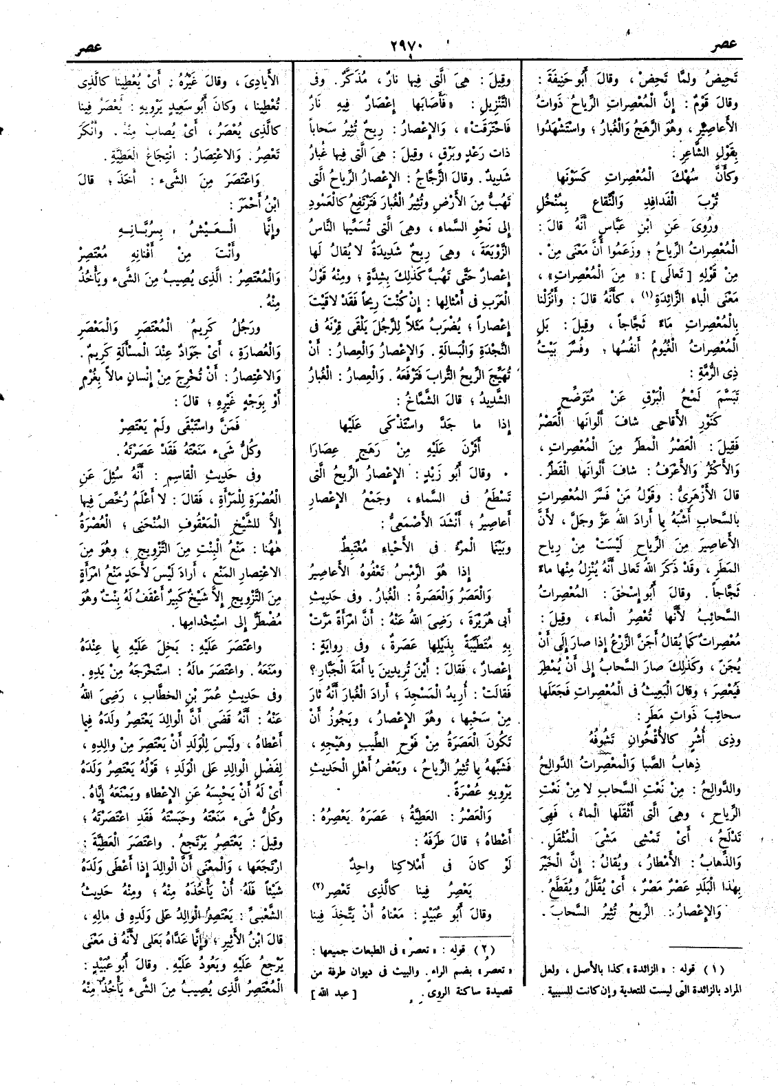 ( * قوله « الزائدة » كذا بالأصل ولعل المراد بالزائدة التي ليست للتعدية وإن كان للسببية ) كأَنه قال وأَنزلنا بالمُعْصِرات ماءً ثجّاجاً وقيل بل المُعْصِراتُ الغُيُومُ أَنفُسُها وفسر بيت ذي الرمة تَبَسَّمَ لَمْحُ البَرْقِ عن مُتَوَضِّحٍ كنَوْرِ الأَقاحي شافَ أَلوانَها العَصْرُ فقيل العَصْر المطر من المُعْصِرات والأَكثر والأَعرف شافَ أَلوانها القَطْرُ قال الأَزهري وقولُ من فَسَّر المُعْصِرات بالسَّحاب أَشْبَهُ بما أَراد الله عز وجل لأَن الأَعاصِير من الرياح ليستْ مِن رِياح المطر وقد ذكر الله تعالى أَنه يُنْزِل منها ماءً ثجّاجاً وقال أَبو إِسحق المُعْصِرات السحائب لأَنها تُعْصِرُ الماء وقيل مُعْصِرات كما يقال أَجَنَّ الزرعُ إِذا صارَ إِلى أَن يُجنّ وكذلك صارَ السحابُ إِلى اين يُمْطِر فيُعْصِر وقال البَعِيث في المُعْصِرات فجعلها سحائب ذوات المطر وذي أُشُرٍ كالأُقْحُوانِ تَشُوفُه ذِهابُ الصَّبا والمعْصِراتُ الدَّوالِحُ والدوالحُ من نعت السحاب لا من نعت الرياح وهي التي أَثقلها الماء فهي تَدْلَحُ أَي تَمِْشي مَشْيَ المُثْقَل والذِّهابُ الأَمْطار ويقال إِن الخير بهذا البلد عَصْرٌ مَصْرٌ أَي يُقَلَّل ويُقطَّع والإِعْصارُ الريح تُثِير السحاب وقيل هي التي فيها نارٌ مُذَكَّر وفي التنزيل فأَصابها إِعْصارٌ فيه نارٌ فاحترقت والإِعْصارُ ريح تُثِير سحاباً ذات رعد وبرق وقيل هي التي فيها غبار شديد وقال الزجاج الإِعْصارُ الرياح التي تهب من الأَرض وتُثِير الغبار فترتفع كالعمود إِلى نحو السماء وهي التي تُسَمِّيها الناس الزَّوْبَعَة وهي ريح شديدة لا يقال لها إِعْصارٌ حتى تَهُبّ كذلك بشدة ومنه قول العرب في أَمثالها إِن كنتَ رِيحاً فقد لاقيت إِعْصاراً يضرب مثلاً للرجل يلقى قِرْنه في النَّجْدة والبسالة والإِعْصارُ والعِصارُ أَن تُهَيِّج الريح التراب فترفعه والعِصَارُ الغبار الشديد قال الشماخ إِذا ما جَدَّ واسْتَذْكى عليها أَثَرْنَ عليه من رَهَجٍ عِصَارَا وقال أَبو زيد الإِعْصارُ الريح التي تَسْطَع في السماء وجمع الإِعْصارِ أَعاصيرُ أَنشد الأَصمعي وبينما المرءُ في الأَحْياء مُغْتَبِطٌ إِذا هو الرَّمْسُ تَعْفوه الأَعاصِيرُ والعَصَر والعَصَرةُ الغُبار وفي حديث أَبي هريرة رضي الله عنه أَنّ امرأَة مرَّت به مُتَطَيِّبة بذَيْلِها عَصَرَةٌ وفي رواية إِعْصار فقال أَينَ تُرِيدين يا أَمَةَ الجَبّارِ ؟ فقالت أُريدُ المَسْجِد أَراد الغُبار أَنه ثارَ من سَحْبِها وهو الإِعْصار ويجوز أَن تكون العَصَرة من فَوْحِ الطِّيب وهَيْجه فشبّهه بما تُثِير الرياح وبعض أَهل الحديث يرويه عُصْرة والعَصْرُ العَطِيَّة عَصَرَه يَعْصِرُه أَعطاه قال طرفة لو كان في أَمْلاكنا واحدٌ يَعْصِر فينا كالذي تَعْصِرُ وقال أَبو عبيد معناه أَي يتخذ فينا الأَيادِيَ وقال غيره أَي يُعْطِينا كالذي تُعْطِينا وكان أَبو سعيد يرويه يُعْصَرُ فينا كالذي يُعْصَرُ أَي يُصابُ منه وأَنكر تَعْصِر والاعْتِصَارُ انْتِجَاعُ العطية واعْتَصَرَ من الشيء أَخَذَ قال ابن أَحمر وإِنما العَيْشُ بِرُبَّانِهِ وأَنْتَ مِن أَفْنانِه مُعْتَصِرْ والمُعْتَصِر الذي يصيب من الشيء ويأْخذ منه ورجل كَريمُ المُعْتَصَرِ والمَعْصَرِ والعُصارَةِ أَي جَوَاد عند المسأَلة كريم والاعْتِصارُ أَن تُخْرِجَ من إِنسان مالاً بغُرْم أَو بوجهٍ غيرِه قال فَمَنَّ واسْتَبْقَى ولم يَعْتَصِرْ وكل شيء منعتَه فقد عَصَرْتَه وفي حديث القاسم أَنه سئل عن العُصْرَةِ للمرأَة فقال لا أَعلم رُخِّصَ فيها إِلا للشيخ المَعْقُوفِ المُنْحَنِي العُصْرَةُ ههنا منع النبت من التزويج وهو من الاعْتِصارِ المَنْع أَراد ليس لأَحد منعُ امرأَة من التزويج إِلا شيخ كبير أَعْقَفُ له بنت وهو مضطر إِلى استخدامها واعْتَصَرَ عليه بَخِلَ عليه بما عنده ومنعه واعْتَصَر مالَه استخرجه من يده وفي حديث عمر بن الخطاب رضي الله عنه أَنه قضى أَن الوالد يَعْتَصِرُ ولَدَ