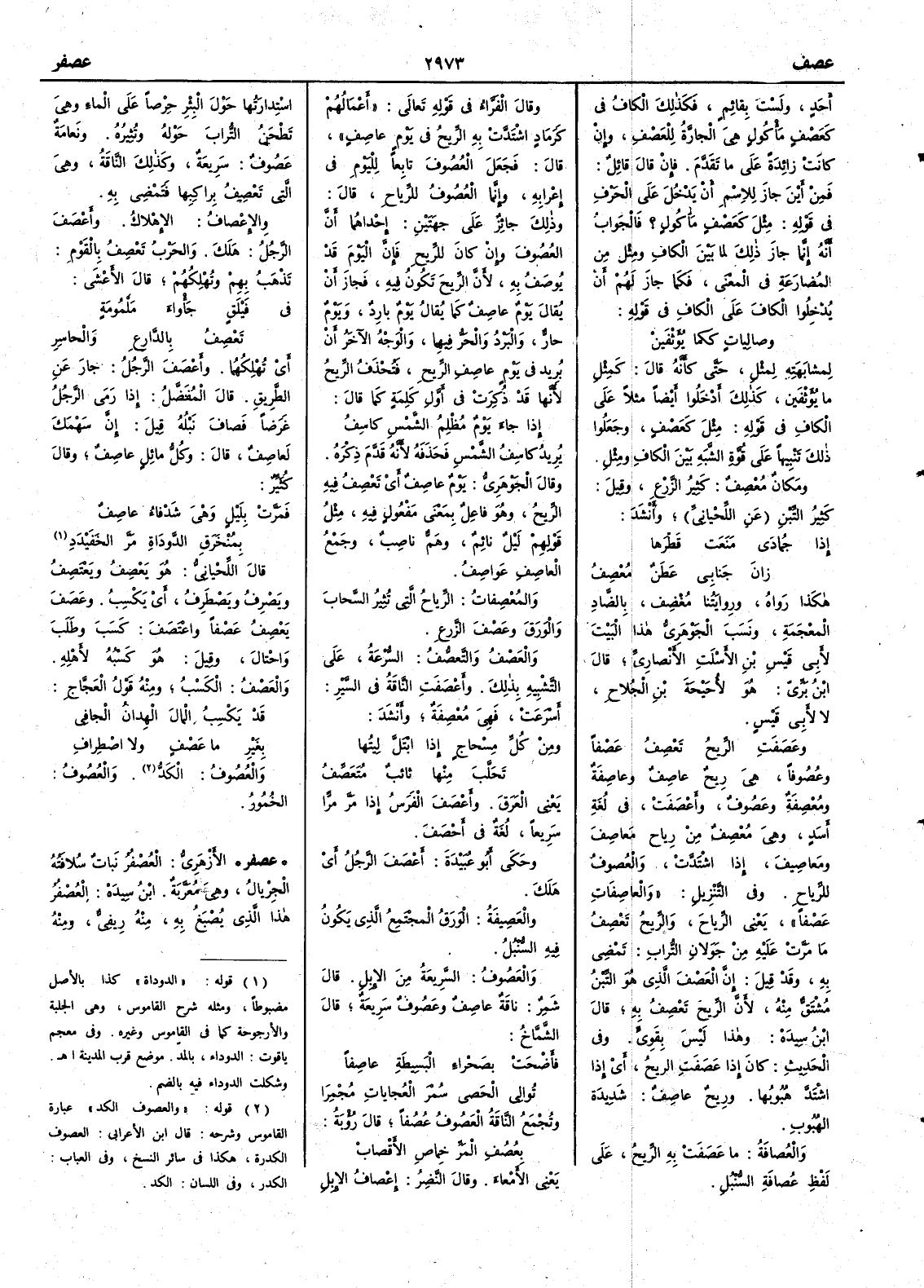 أَحد ولست بقائم فكذلك الكاف في كعصف مأْكول هي الجارَّة للعصف وإن كانت زائدة على ما تقدَّم فإن قال قائل فمن أَيْنَ جاز للاسم أَن يدخل على الحرف في قوله مثل كعصف مأْكول ؟ فالجواب أَنه إنما جاز ذلك لما بين الكاف ومثل من المُضارَعة في المعنى فكما جاز لهم أَن يُدخلوا الكاف على الكاف في قوله وصالِياتٍ كَكما يُؤَثْفَينْ لمشابهته لمثل حتى كأَنه قال كمثل ما يؤثفين كذلك أَدخلوا أَيضاً مثلاً على الكاف في قوله مثل كعصف وجعلوا ذلك تنبيهاً على قوَّة الشبه بين الكاف ومثل ومَكان مُعْصِفٌ كثير الزرع وقيل كثير التبن عن اللحياني وأَنشد إذا جُمادَى مَنَعَت قَطْرها زانَ جَنابي عَطَنٌ مُعْصِفُ