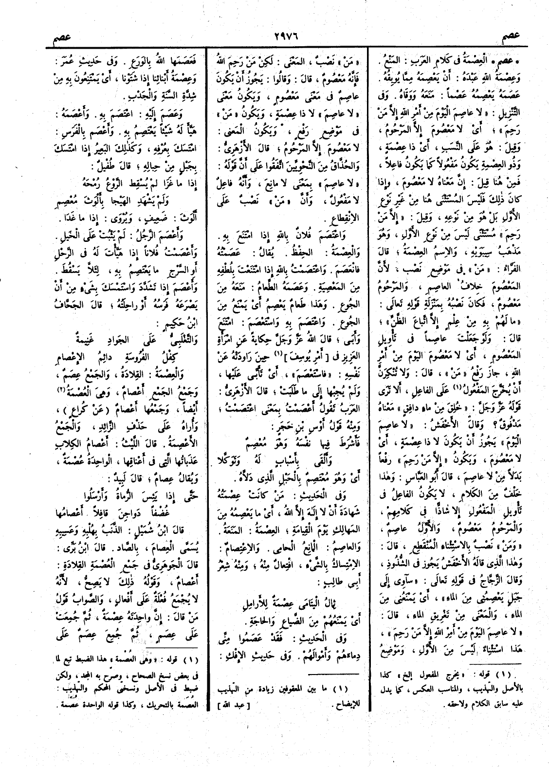 ( * قوله « يخرج المفعول إلخ » كذا بالأصل والتهذيب والمناسب العكس كما يدل عليه سابق الكلام ولاحقه ) على الفاعِل أَلا ترى قولَه عز وجل خُلِقَ من ماءٍ دافِقٍ ؟ معناه مَدْفوق وقال الأخفش لا عاصِمَ اليوم يجوز أَن يكون لا ذا عِصمةٍ أي لا مَعْصومَ ويكون إلا مَنْ رحِمَ رفْعاً بدلاً مِنْ لا عاصم قال أبو العباس وهذا خَلْفٌ من الكلام لا يكون الفاعلُ في تأْويل المفعول إلا شاذّاً في كلامهم والمرحومُ معصومٌ والأوَّل عاصمٌ ومَنْ نَصْبٌ بالاستثناء المنقطع قال وهذا الذي قاله الأخفش يجوز في الشذوذ وقال الزجاج في قوله تعالى سآوِي إلى جبلٍ يَعْصِمُني مِنَ الماء أي يمنعُني من الماء والمعنى مِنْ تَغْرِيقِ الماء قال لا عاصِمَ اليومَ من أمر الله إلا مَنْ رَحِم هذا استثناء ليس من الأَول وموضعُ مَنْ نصبٌ المعنى لكنْ مَنْ رَحِمَ اللهُ فإنه معصوم قال وقالوا وقالوا يجوز أن يكون عاصِم في معنى مَعْصُوم ويكون معنى لا عاصِمَ لا ذا عِصْمةٍ ويكون مَنْ في موضع رفعٍ ويكون المعنى لا مَعْصومَ إلا المرحوم قال الأزهري والحُذَّاقُ من النحويين اتفقوا على أن قولَه لا عاصِمَ بمعنى لا مانِعَ وأنه فاعلٌ لا مفعول وأنَّ مَنْ نَصْبٌ على الانقطاع واعْتَصَمَ فلانٌ بالله إذا امتنع به والعَصْمة الحِفْطُ يقال عَصَمْتُه فانْعَصَمَ واعْتَصَمْتُ بالله إذا امتنعْتَ بلُطْفِه من المَعْصِية وعَصَمه الطعامُ منَعه من الجوع وهذا طعامٌ يَعْصِمُ أي يمنع من الجوع واعْتَصَمَ به واسْتَعْصَمَ امتنعَ وأبَى قال الله عز وجل حكايةً عن امرأَة العزيز حين راودَتْه عن نفْسِه فاسْتَعْصَمَ أي تَأَبَّى عليها ولم يُجِبها إلى ما طلبَتْ قال الأزهري العرب تقول أَعْصَمْتُ بمعنى اعْتَصَمْت ومنه قولُ أوس بن حجر فأَشْرَط فيها نفْسَه وهْو مُعْصِمٌ وأَلْقى بأَسْبابٍ له وتَوَكَّلا أي وهو مُعْتَصِمٌ بالحبْل الذي دَلاَّه وفي الحديث مَنْ كانت عِصْمتُه شَهادةَ أن لا إلهَ إلا اللهُ أي ما يَعْصِمُه من المَهالِك يوم القيامة العصْمَةُ المَنَعةُ والعاصمُ المانعُ الحامي والاعْتِصامُ الامْتِساكُ بالشيء افْتِعالٌ منه ومنه شِعْرُ أَبي طالب ثِمالُ اليتامَى عِصْمةٌ للأَرامِل أي يَمْنعُهم من الضَّياعِ والحاجةِ وفي الحديث فقد عَصَمُوا مِنِّي دِماءَهم وأَمْوالَهم وفي حديث الإفْكِ فعَصَمها الله بالوَرَعِ وفي حديث عُمَر وعِصْمة أَبْنائِنا إذا شَتَوْنا أي يمتنعون به من شِدَّة السَّنة والجَدْب وعَصَمَ إليه اعتصم به وأَعْصَمَه هَيَّأ له شيئاً يعْتَصِمُ به وأَعْصمَ بالفرَسِ امْتَسكَ بعُرْفِه وكذلك البعيرُ إذا امْتَسَكَ بحَبْلٍ مِنْ حِبالهِ قال طُفيل إذا ما غَزَا لم يُسْقِط الرَّوْعُ رُمْحَه ولم يَشْهَدِ الهَيْجا بأَلْوَثَ مُعْصِمِ ألْوَث ضعيف ويروى كذا ما غَدَا وأَعصمَ الرجلُ لم يَثْبُت على الخيل وأَعْصَمْتُ فلاناً إذا هَيَّأْتَ له في الرَّحْلِ أو السَّرْج ما يَعْتَصِمُ به لئلا يَسقُط وأَعصم إذا تشدَّد واسْتَمْسَكَ بشيءٍ من أَن يَصْرَعَه فرَسُه أو راحلته قال الجَحّاف بن حكيم والتَّغْلَبيّ على الجَوادِ غَنِيمة كِفْل الفُروسةِ دائِم الإعْصامِ والعِصْمةُ القِلادةُ والجمعُ عِصَمٌ وجمعُ الجمعِ أَعْصام وهي العُصْمةُ
