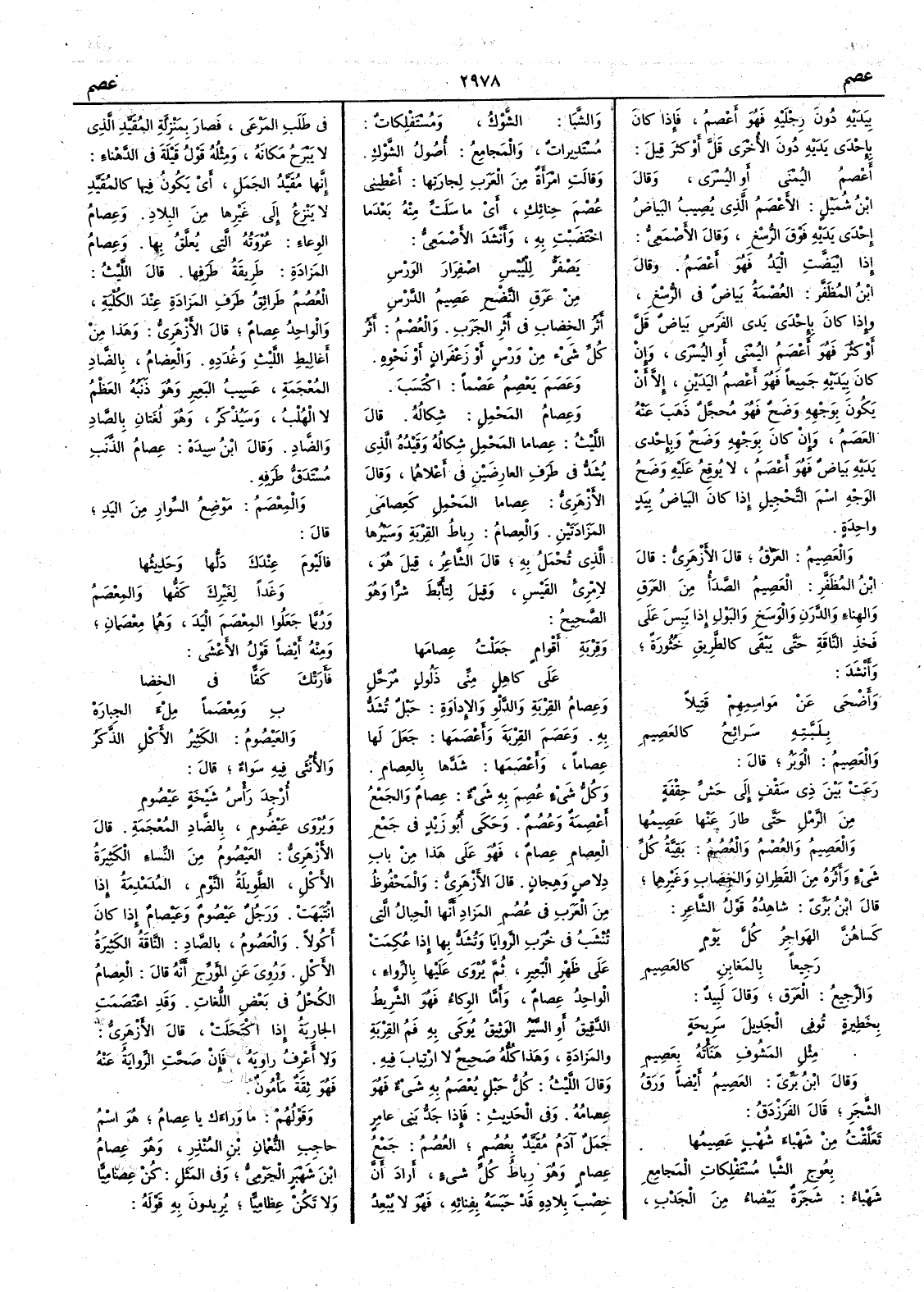 ( * قوله أثر الخضاب إلخ هو تفسير لعصيم الدرس في البيت السابق ) والعُصْمُ أثرُ كلِّ شيء من وَرْسٍ أو زَعْفَرانٍ أو نحوه وعَصَمَ يَعْصِمُ عَصْماً اكْتَسَبَ وعِصامُ المَحْمِل شِكالُه قال الليث عصاما المَحْمِلِ شِكالُه وقَيْدُه الذي يُشَدُّ في طرف العارِضَيْن في أَعلاهما وقال الأزهري عِصاما المَحْمِلِ كعِصامَي المَزَادَتيْن والعِصامُ رِباطُ القِرْبةِ وسَيْرُها الذي تُحْمَل به قال الشاعر قيل هو لامرئ القيس وقيل لِتأَبَّط شرّاً وهو الصحيح وقِرْبة أَقْوامٍ جَعَلْتُ عِصامها على كاهلٍ مِنِّي ذَلولٍ مُرَحَّلِ وعصامُ القِرْبةِ والدَّلْوِ والإداوة حَبْلٌ تُشدُّ به وعَصمَ القِرْبةَ وأَعْصَمَها جعلَ لها عِصاماً وأَعْصَمَها شَدَّها بالعِصام وكلُّ شيءٍ عُصِمَ به شيءٌ عِصامٌ والجمعُ أَعْصِمةٌ وعُصُمٌ وحكى أبو زيد في جمع العِصامِ عِصام فهو على هذا من باب دِلاصٍ وهِجانٍ قال الأزهري والمحفوظُ من العرب في عُصُمِ المَزادِ أنها الحبالُ التي تُنْشَبُ في خُرَبِ الرَّوايَا وتُشَدُّ بها إذا عُكِمَتْ على ظَهْر البعير ثم يُرْوَى عليها بالرِّواء الواحدُ عِصامٌ وأما الوِكاءُ فهو الشريطُ الدقيقُ أو السَّيْرُ الوثيقُ يُوكَى به فَمُ القِرْبة والمَزادةِ وهذا كُلُّه صحيحٌ لا ارْتِيابَ فيه وقال الليث كُلُّ حَبْلٍ يُعْصَمُ به شيءٌ فهو عِصامُه وفي الحديث فإذا جَدُّ بني عامرٍ جَمَلٌ آدَمُ مُقيَّدٌ بِعُصُم العُصُمُ جمعُ عِصامٍ وهو رباطُ كلِّ شيء أراد أن خِصْبَ بلادِه قد حَبَسه بفِنائه فهو لا يُبْعِدُ في طلب المَرْعَى فصار بمنزلة المُقَيَّد الذي لا يَبْرحُ مَكانَه ومثله قول قَيلةَ في الدَّهْناءِ إنها مُقَيَّدُ الجمَل أي يكونُ فيها كالمُقيَّدِ لا يَنْزِعُ إلى غيرِها من البلاد وعِصامُ الوعاءِ عُرْوتُه التي يُعلَّقُ بها وعِصامُ المَزادةِ طريقةُ طَرَفِها قال الليث العُصُمُ طرائقُ طَرَفِ المَزادة عند الكُلْية والواحد عِصامٌ قال الأزهري وهذا من أَغاليطِ الليث وغُدَدِه والعِضامُ بالضاد المعجمة عَسِيبُ البعير وهو ذَنَبُه العَظْمُ لا الهُلْبُ وسيذكر وهو لُغَتانِ بالصاد والضاد وقال ابن سيده عِصامُ الذَّنَبِ مُسْتدَقُّ طرفِه والمِعْصَمُ مَوْضِعُ السِّوارِ من اليَدِ قال فاليَوْمَ عِنْدَكَ دَلُّها وحَدِيثُها وغَداً لِغَيْرِكَ كَفُّها والمِعْصَمُ وربما جعلوا المِعْصَم اليَد وهما مَعْصَمانِ ومنه أيضاً قول الأعشى فأَرَتْكَ كَفّاً في الخِضا بِ ومِعْصَماً مِلْءَ الجِبارَهْ والعَيْصومُ الكثيرُ الأَكلِ الذَّكرُ والأُنثى فيه سواء قال أُرْجِدَ رَأْسُ شَيْخةٍ عَيْصُومِ ويروى عَيْضُوم بالضاد المعجمة قال الأزهريّ العَيْصومُ من النِّساء الكثيرةُ الأَكْلِ الطَّويلةُ النَّوْم المُدَمْدِمةُ إذا انْتَبهتْ ورجلٌ عَيْصُومٌ وعَيْصامٌ إذا كان أَكُولاً والعَصُومُ بالصادِ الناقةُ الكثيرةُ الأَكْلِ وروي عن المؤرِّج أنه قال العِصامُ الكُحْلُ في بعض اللغات وقد اعْتَصَمتِ الجاريةُ إذا اكْتَحَلتْ قال الأزهري ولا أعرف راويَه فإن صحت الروايةُ عنه فهو ثقةٌ مأْمونٌ وقولهم ما وَراءََك يا عِصامُ هو اسم حاجِب النُّعمان بن المُنْذِر وهو عِصامُ بن شَهْبَر الجَرْمِيّ وفي المثل كُنْ عِصامِيّاً ولا تَكُنْ عِظاميّاً يُرِيدون به قوله