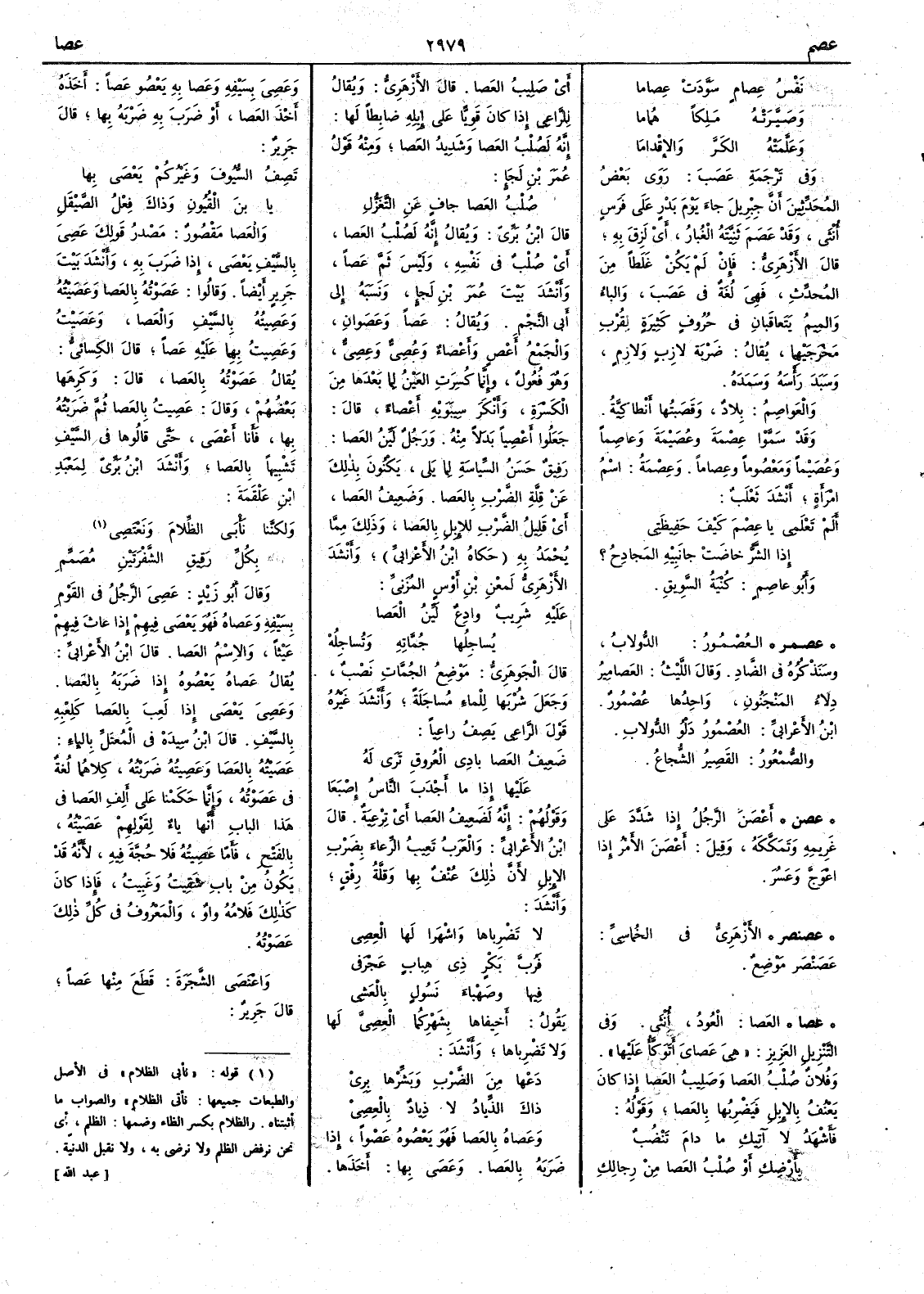 ( عصن ) أَعْصَنَ الرجلُ إذا شَدَّدَ على غريمه وتمكَّكَه وقيل أَعْصَنَ الأَمرُ إذا اعْوَجَّ وعَسُر ( عصنصر ) الأَزهري في الخماسي عَصَنْصَر موضع( عصا ) العَصا العُودُ أُنْثَى وفي التنزيل العزيز هي عَصايَ أَتَوَكَّأُ عليها وفلانٌ صُلْبُ العَصا وصليبُ العَصا إذا كان يَعْنُفُ بالإبل فيَضْرِبْها بالعَصا وقوله فأَشْهَدُ لا آتِيكِ ما دامَ تَنْضُبٌ بأَرْضِكِ أَو صُلْبُ العصا من رجالِكِ أَي صَلِيبُ العَصا قال الأزهري ويقال للرّاعي إذا كان قَويّاً على إبِلِه ضابطاً لها إنه لصُلْبُ العَصا وشديدُ العَصا ومنه قول عمر بنِ لَجَإٍ صُلْبُ العَصا جافٍ عن التَّغَزُّلِ قال ابن بري ويقال إنه لصُلْبُ العَصا أي صُلْبٌ في نفسه وليس ثَمَّ عَصاً وأَنشد بيت عمر بن لجإٍ ونسبه إلى أبي النَّجْم ويقال عَصاً وعَصَوانِ والجمع أَعْصٍ وأَعْصاءٌ وعُصِيٌّ وعِصِيٌّ وهو فُعول وإنما كُسِرت العَيْنُ لما بَعْدَها من الكسرة وأَنكر سيبويه أَعصاءً قال جعلوا أَعْصِياً بدلاً منه ورجلٌ لَيِّنُ العصا رفيقٌ حَسَنُ السياسة لما يَلي يكْنونُ بذلك عن قِلة الضَّرْب بالعَصا وضعيفُ العَصا أَي قليلُ الضَّرْب للإبلِ بالعَصا وذلك مما يُحْمَدُ به حكاه ابن الأعرابي وأَنشد الأزهري لمَعْنِ بنِ أَوْسٍ المُزَني عليه شَرِيبٌ وادِعٌ لَيِّنُ العَصا يُساجِلُها جُمَّاتِهِ وتُساجِلُهْ قال الجوهري موضعُ الجُمَّاتِ نَصْبٌ وجَعَل شُرْبَها للماء مُساجَلة وأَنشد غيرهُ قول الراعي يصف راعياً ضَعيفُ العَصا بادي العُروقِ ترى له عليها إذا ما أَجْدَبَ الناسُ إصبَعَا وقولهم إنه لضعيف العَصا أَي تِرْعِيةَ قال ابن الأعرابي والعربُ تَعيبُ الرِّعاءَ بضَرْبِ الإبلِ لأن ذلك عُنْفٌ بها وقلَّةُ رِفْقٍ وأَنشد لا تَضْرِباها واشْهَرا لها العصِي فرُبّ بَكْرٍ ذِي هِبابٍ عَجْرَفي فيها وصَهْباءَ نَسوُلٍ بالعَشِي يقول أَخيفاها بشهّرِكُما العِصِيِّ لها ولا تَضْرِباها وأَنشد دَعْها مِن الضَّرْبِ وبَشِّرّها بِرِيْ ذاكَ الذِّيادُ لا ذِيادٌ بالعِصِيْ وعَصاه بالعَصا فهو يَعْصُوه عَصْواً إذا ضَرَبَه بالعصا وعَصى بها أَخذها وعَصِيَ بسَيْفه وعَصا به يَعْصُو عَصاً أَخذَه أَخْذَ العَصا أَو ضَرَبَ به ضَرْبَه بها قال جرير تَصِفُ السُّيُوفَ وغيرُكُمْ يَعْصَى بها يا ابنَ القُيونِ وذاكَ فِعْلُ الصَّيْقَلِ والعَصا مقصورٌ مصدرٌ قَولِك عَصِيَ بالسيف يَعْصَى إذا ضَرَبَ به وأَنشد بيت جرير أَيضاً وقالوا عَصَوتُه بالعَصا وعَصَيْتُه وعَصِيتُه بالسيف والعَصا وعَصَيْتُ وعَصِيتُ بهما عليه عَصاً قال الكسائي يقال عَصَوْتُه بالعَصا قال وكَرِهِهَا بعضُهم وقال عَصِيت بالعَصا ثم ضَرَبْتُه بها فأَنا أَعْصَى حتى قالوها في السيف تشبيهاً بالعصا وأَنشد ابن بري لمعبد بن علقمة ولكنَّنا نأْتي الظَّلامَ ونَعْتَصِي بكُلِّ رَقِيقِ الشَّفْرَتَينَ مُصَمِّمِ وقال أَبو زيد عَصِيَ الرجلُ في القوم بسيفه وعَصاه فهو يَعْصَى فيهم إذا عاثَ فيهم عَيْثاً والاسمُ العَصا قال ابن الأَعرابي يقال عَصاهُ يَعْصُوه إذا ضرَبَه بالعصا وعَصِيَ يَعْصَى إذا لَعِبَ بالعَصا كَلِعبه بالسيفِ قال ابن سيده في المعتل بالياء عَصَيته بالعصا وعَصِيته ضربْتُه كلاهما لُغةٌ في عَصَوْتُه وإنما حَكَمْنا على أَلف العَصا في هذا الباب أنها ياءٌ لقَولهم عَصَيْته بالفتح فأَمّا عَصِيته فلا حجة فيه لأَنه قد يكون من بابِ شَقِيتُ وغَبِيت فإذا كان كذلك فلامُه واوٌ والمعروف في كل ذلك عَصَوْته واعْتَصى الشجرةَ قَطَع منها عَصاً قال جرير