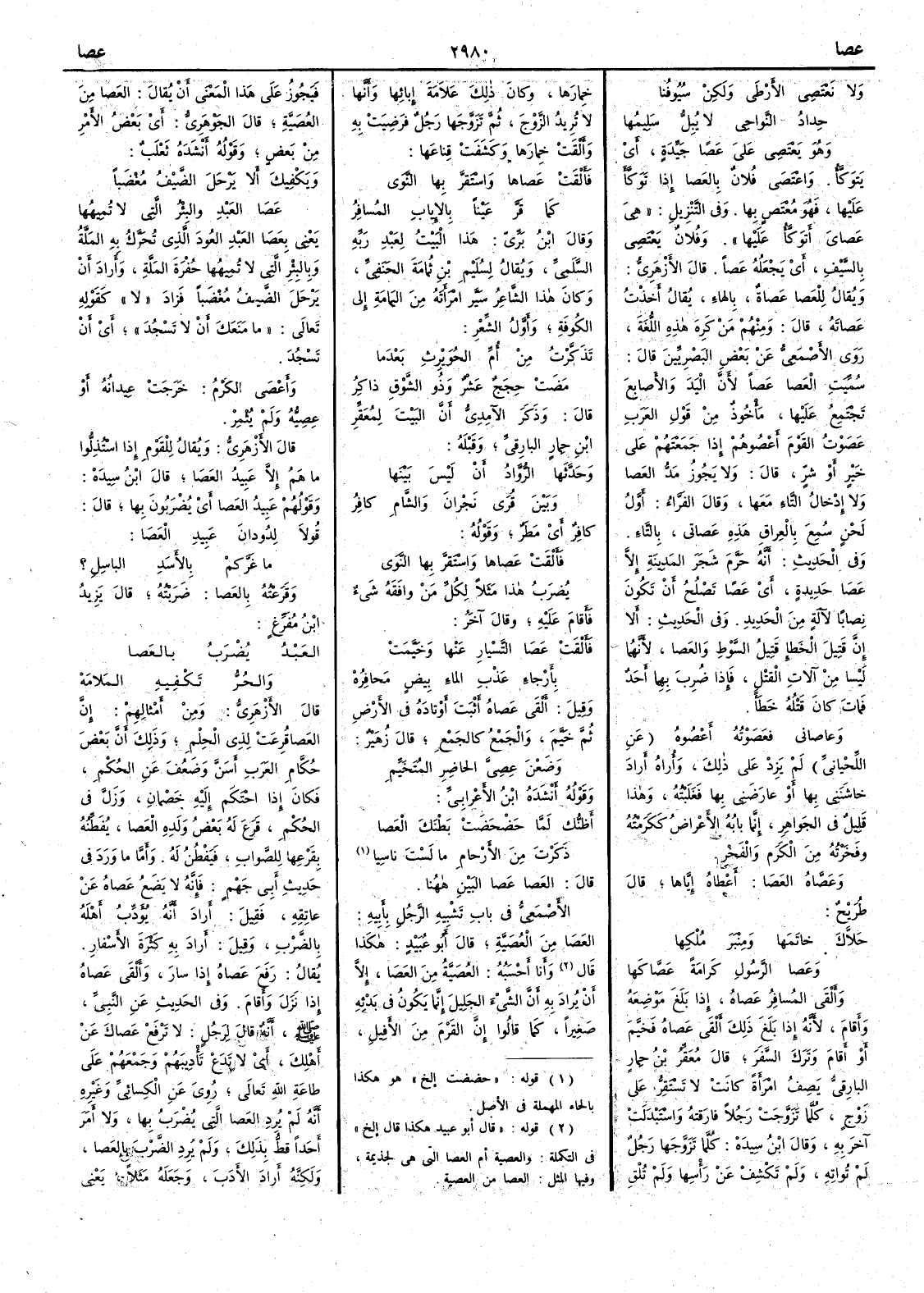 ( * قوله « قال أبو عبيد هكذا قال إلخ » في التكملة والعصية أم العصا التي هي لجذيمة وفيها المثل العصا من العصية ) وأَنا أَحسَبُه العُصَيَّةُ من العَصَا إِلاَّ أَن يُرادَ به أَن الشيء الجلِيل إنما يكون في بَدْئه صَغِيراً كما قالوا إِنَّ القَرْمَ من الأَفِيلِ فيجوز على هذا المعنى أَنْ يقال العَصا من العُصَيَّة قال الجوهري أَي بَعْضُ الأَمر من بَعضٍ وقوله أَنشده ثعلب ويَكْفِيكَ أَنْ لا يَرْحلَ الضَّيْفُ مُغْضَباً عَصَا العَبْدِ والبِئْرُ التي لا تُمِيهُها يعني بعَصَا العَبْدِ العُودَ الذي تحرَّكُ به المَلَّة وبالبئر التي لا تُمِيهُها حُفْرَةَ المَلَّة وأَرادَ أَنْ يرحَلَ الضيفُ مغْضَباً فزاد لا كقوله تعالى ما مَنَعَك أَن لا تَسْجُد أَي أَنْ تَسْجُدَ وأَعْصَى الكَرْمُ خَرَجَت عِيدانُه أَو عِصِيُّه ولم يُثْمِرْ قال الأَزهري ويقال للقوْم إِذا اسْتُذِلُّوا ما هم إِلاَّ عبيدُ العَصَا قال ابن سيده وقولهم عبيدُ العَصا أَي يُضْرَبُون بها قال قولا لِدُودانَ عَبِيدِ العَصَا ما غَرَّكمْ بالأَسَد الباسِلِ ؟ وقَرَعْته بالعَصا ضَرَبْته قال يزيد بن مُفَرِّغ العَبْدُ يُضْرَبُ بالعَصا والحُرُّ تَكْفِيهِ المَلامَة قال الأَزهري ومن أَمْثالِهم إِن العَصا قُرِعَتْ لذي الحِلْم وذلك أَن بعض حُكَّامِ العَرب أَسَنَّ وضعُف عن الحُكْم فكان إِذا احْتَكَم إِليه خَصْمانِ وزَلَّ في الحُكْم قَرَع له بعضُ ولدِه العَصا يُفَطِّنُه بقَرْعِها للصَّواب فيَفْطُنُ له وأَما ما ورد في حديث أَبي جَهْمٍ فإنه لا يَضَعُ عَصاهُ عن عاتِقِه فقيل أَراد أَنه يُؤَدِّبُ أَهْلَه بالضَّرْبِ وقيل أَراد به كَثْرةَ الأَسْفار يقال رَفَع عَصاهُ إِذا سار وأَلْقى عَصاهُ إِذا نزَل وأَقام وفي الحديث عن النبي صلى الله عليه وسلم أَنه قال لرجُلٍ لا تَرْفَعْ عَصاكَ عن أَهْلِكَ أَي لا تَدَعْ تَأْديبَهُم وجَمْعَهُم على طاعَةِ الله تعالى روي عن الكسائي وغيره أَنه لم يُرِد العَصا التي يُضْرَبُ بها ولا أَمَر أَحَداً قطُّ بذلك ولم يُرِدِ الضَّرْبَ بالعَصا ولكنه أَراد الأَدَبَ وجَعَلَه مَثَلاً يعني