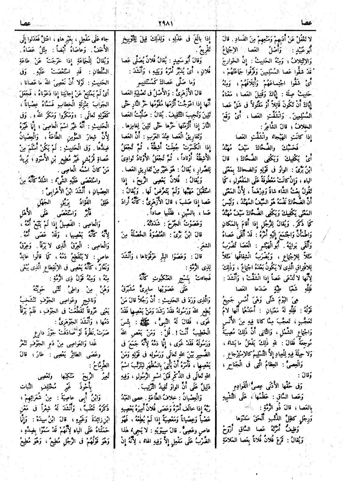 لا تَغْفُلْ عن أَدَبهم ومَنْعِهم من الفَساد قال أَبو عبيد وأَصْلُ العَصا الاجْتِماعُ والائْتِلافُ ومنه الحديث إِن الخَوارجَ قد شَقُّوا عصا المُسْلِمين وفَرَّقوا جَماعَتهم أَي شَقُّوا اجْتماعَهُم وأْتِلافَهُم ومنه حديث صِلَة إِيَّاك وقَتِيلَ العَصا معناه إِيَّاك أَن تكونَ قاتِلاً أَو مَقْتُولاً في شَقِّ عَصا المُسْلِمِين وانْشَقَّت العَصا أَي وقَع الخِلافُ قال الشاعر إِذا كانتِ الهَيْجاءُ وانْشَقَّت العَصا فحَسْبُك والضَّحَّكَ سَيْفٌ مُهَنِّدُ أَي يكفيك ويكفي الضَّحَّاكَ قال ابن بري الواو في قوله والضحاك بمعنى الباء وإن كانت معطوفة على المفعول كما تقول بِعْتُ الشاءَ شاةً ودِرْهَماً لأَن المعنى أَن الضَّحَّاكَ نَفْسَه هو السَّيْفُ المُهَنَّدُ وليس المعنى يَكْفِيكَ ويَكْفِي الضَّحَّاك سَيْفٌ مُهَنَّدٌ كما ذكر ويقال للرجُلِ إِذا أَقام بالمَكان واطْمَأَنَّ واجْتَمع إِليه أَمْرُه قد أَلْقى عصاه وأَلْقى بَوانِيَهُ أَبو الهيثم العَصا تُضْرَب مثلاً للاجتماع ويُضْرب انْشِقاقُها مثلاً للافْتِراقِ الذي لا يكونُ بعده اجتماعٌ وذلك لأَنها لا تُدْعى عَصاً إِذا انْشَقَّت وأَنشد فَلِلَّهِ شَعْبَا طِيَّةٍ صَدَعا العَصا هي اليَوْمَ شَتَّى وهي أَمْسِ جَميع قوله فَلِلَّه له معنيان أَحدهما أَنها لامُ تَعجُّب تَعجَّبَ مما كانا فيه من الأُنس واجتماعِ الشَّمْل والثاني أَن ذلك مُصِيبَةٌ موجِعة فقال لله ذلك يَفْعَلُ ما يشاءُ ولا حِيلة فيه للْعِباد إِلا التَّسْلِيم كالاسْتِرْجاع والعِصِيُّ العظامُ التي في الجَناح وقال وفي حُقّها الأَدْنى عِصيُّ القَوادم وعَصا السَّاق عَظْمُّها على التشبيه بالعَصا قال ذو الرمة ورِجْلٍ كظِلِّ الذِّئْبِ أَلْحَقَ سَدْوَها وظِيفٌ أَمَرَّتْهُ عَصا السَّاقِ أَرْوَحُ ويقال قَرَع فلانٌ فلاناً بعَصا المَلامَةِ إِذا بالغَ في عذله ولذلك قيل للتَّوْبِيخ تَقْريعٌ وقال أَبو سعيد يقال فلانٌ يُصَلِّي عَصا فلانٍ أَي يُدَبِّرُ أَمْره ويَلِيه وأَنشد وما صَلَّى عَصاكَ كَمُسْتَدِيمِ قال الأَزهري والأَصل في تَصْلِيَة العَصا أَنها إِذا اعْوَجَّتْ أَلْزَمَها مُقَوِّمُها حَرَّ النَّارِ حتى تَلِين وتُجِيب التَّثْقِيفَ يقال صَلَّيْتُ العَصا النارَ إِذا أَلْزَمْتَها حَرَّها حتى تَلِينَ لِغامِزها وتفاريقُ العَصا عند العرب أَن العَصا إِذا انْكَسَرَت جُعِلَت أَشِظَّةً ثم تُجْعَلُ الأَشِظَّةُ أَوْتاداً ثم تجعل الأَوْتادُ تَوادِيَ للصِّرار يقال هو خَيْرٌ من تَفاريق العَصا ويقال فلانٌ يَعْصِي الريحَ إِذا اسْتَقْبل مَهَبَّها ولم يَتَعرَّضْ لها ويقال عَصا إِذا صَلُبَ قال الأَزهري كأَنه ارادَ عسا بالسين فقَلَبها صاداً وعَصَوْتُ الجُرْحَ شَدَدْتُه قال ابن بري العُنْصُوَة الخُصْلة من الشَّعَر قال وعَصَوَا البئر عَرْقُوتاهُ وأَنشد لذي الرمة فجاءَتْ بنَسْجِ العَنْكبُوتِ كأَنَّه على عَصَوَيْها سابِرِيٌّ مُشَبْرَقُ والذي ورد في الحديث أَنَّ رَجُلاً قال مَنْ يُطِعِ اللهَ ورسُوله فقَدْ رَشَدَ ومنْ يَعْصِهِما فقد غَوى فقال له النبي صلى الله عليه وسلم بِئْسَ الخَطِيبُ أَنتَ قُلْ ومَنْ يَعْصِ اللهَ ورسُوله فقد غَوى إِنما ذمَّه لأَنه جمَع في الضَّمِير بين الله تعالى ورسُوله في قوله ومَنْ يَعْصِهِما فأَمَرَهُ أَن يَأْتي بالمُظْهَرِ ليَتَرَتَّب اسم الله تعالى في الذِّكْر قبل اسْم الرَّسُول وفيه دليل على أَن الواو تُفِيد التَّرْتِيب والعِصيانُ خِلافُ الطَّاعَة عَصى العبدُ ربه إِذا خالَف أَمْرَه وعصى فلان أَميرَه يَعْصِيه عَصْياً وعِصْياناً ومَعْصِيَةً إِذا لم يُطِعْهُ فهو عاصٍ وعَصِيٌّ قال سيبويه لا يجيءُ هذا الضَّرْبُ على مَفْعِلٍ إِلاَّ وفيه الهاء لأَنه إن جاءَ على مَفْعِلٍ بغير هاءٍ اعْتلَّ فعدَلوا إِلى الأَخَفِّ وعاصَاهُ أَيضاً مثلُ عَصَاه ويقال للجَماعةِ إِذا خَرَجَتْ عن طاعةِ السلْطان قد اسْتَعْصَتْ عليه وفي الحديث لْو