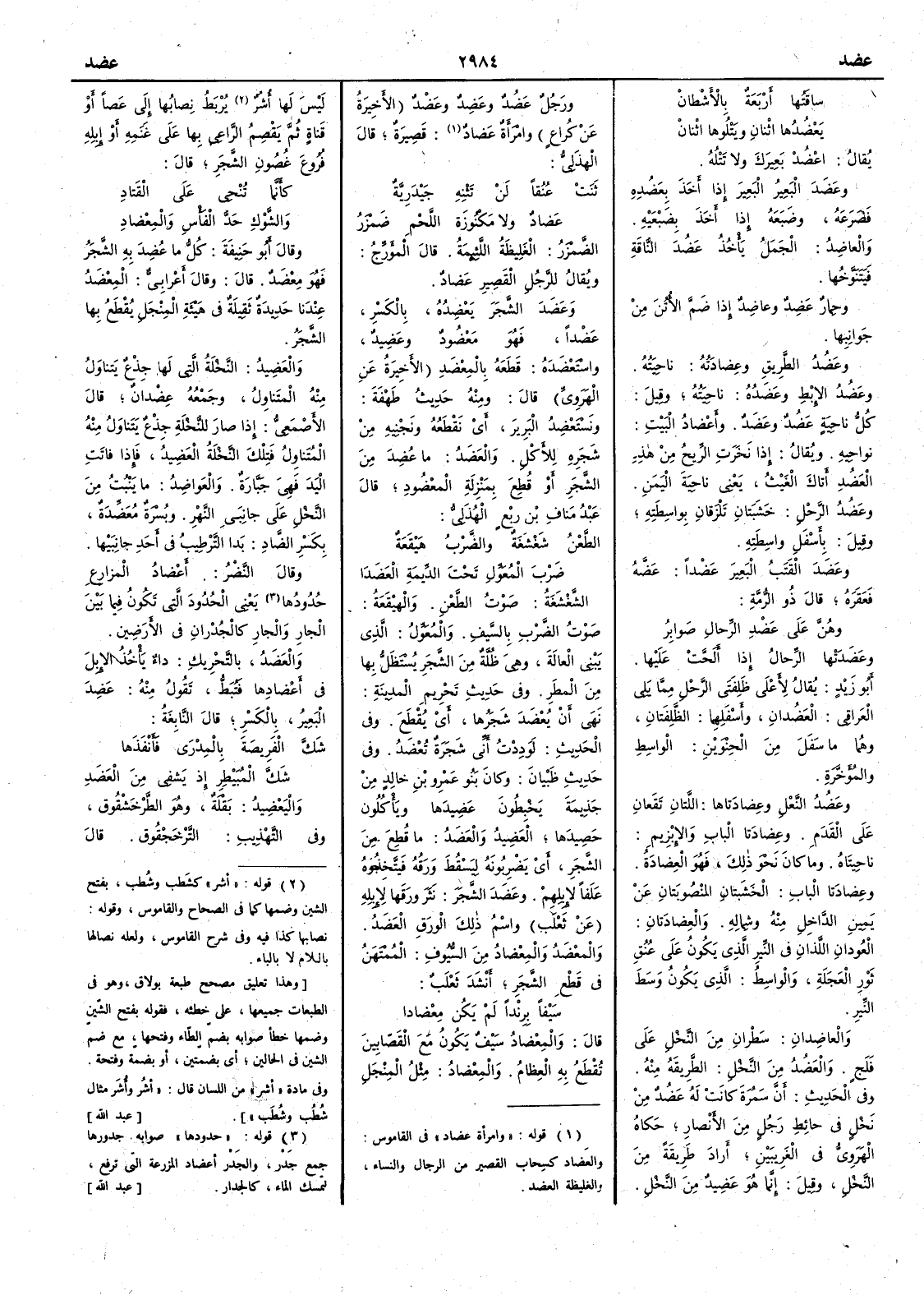 يُرْبَط نِصابُها إِلى عصا أَو قناة ثم يَقْصِمُ الراعي بها على غنمه أَو إِبله فُروعَ غُصونِ الشجر قال كأَنما تُنْحي على القَتادِ والشَّوْكِ حَدَّ الْفَأْسِ والمِعْضادِ وقال أَبو حنيفة كل ما عُضِد به الشجر فهو مِعْضَد قال وقال أَعرابي المِعْضَدُ عندنا حديدة ثقيلة في هيئة المِنْجل يقطع بها الشجر والعَضِيدُ النخلة التي لها جِذْعٌ يَتناولُ منه المتناول وجمعه عِضْدانٌ قال الأَصمعي إِذا صار للنخلة جذع يتناول منه المتناول فتلك النخلة العَضِيدُ فإِذا فأَتت اليد فهي جَبَّارَةٌ والعَواضِدُ ما ينبت من النخل على جانبي النهر وبُسْرَةٌ مُعَضِّدة بكسر الضاد بدا الترطيب في أَحد جانبيها وقال النضر أَعضادُ المزارع حدودها يعني الحدود التي تكون فيما بين الجار والجار كالجُدْران في الأَرضين والعضد بالتحريك داء يأْخذ الإِبل في أَعضادها فَتُبَطُّ تقول منه عَضِدَ البعير بالكسر قال النابغة شَكَّ الفَريصَةَ بالمِدْرى فَأَنْفَذَها شَكَّ المُبَيْطِر إِذ يَشفِي من العَضَدِ واليَعْضِيدُ بقلة وهو الطَّرْخَشْقوق وفي التهذيب التَّرْخَجْقوق قال
