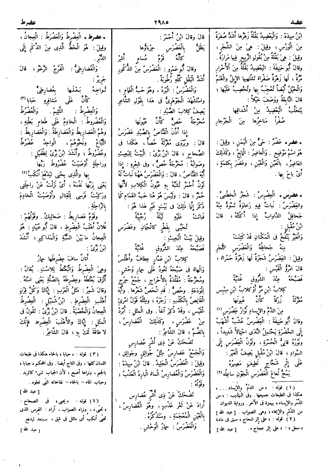 ابن سيده واليعضيد بقلة زهرها أَشد صفرة من الوَرْس وقيل هي من الشجر وقيل هي بقلة من بقول الربيع فيها مَرارة وقال أَبو حنيفة اليعضيد بقلة من الأَحرار مرة لها زهرة صفراء تشتهيها الإِبل والغنم والخيل أَيضاً تُعْجِبُ بها وتُخْصِبُ عليها قال النابغة ووصف خيلاً يَتَحَلَّبُ اليَعْضِيدُ من أَشْداقِها صُفْراً مَناخِرُها من الجَرْجارِ ( عضر ) عَضْرٌ حَيٌّ من اليمن وقيل هو اسم موضع والعاضِرُ المانِعُ وكذلك الغاضِرُ بالعين والغين وعَضَرَ بكلمة أَي باحَ بها ( عضرس ) العِضْرِسُ شجر الخِطْميّ والعَِضْرَسُ نبات فيه رَخاوة تَسودّ منه جَحافل الدواب إِذا أَكلته قال ابن مقبل والعَيْرُ يَنفُخُ في المَكْنانِ قد كَتِنَتْ منه جَحافِلُه والعَِضْرَسِ التُّجَرِ وقيل العَِضْرَسُ شجرة لها زهرة حمراء قال امرؤ القيس فصَبَّحَهُ عند الشُّرُوق غُدَيَّة كِلابُ ابنِ مُرٍّ أَو كلابُ ابنِ سِنْبِسِ مُغَرَّثَةً زُرْقاً كأَنَّ عُيونَها من الدَّمِّ والإِيادِ نُوَّارُ عَِضرَسِ وقال أَبو حنيفة العَِضْرَسُ عُشْب أَشهبُ إِلى الخُضرة يحتمل النَّدى احتمالاً شديداً ونَوْرُه قانئُ الحمرة ولون العَِضْرَس إِلى السواد قال ابن مقبل يصف العَير على إِثْرِ شَحَّاجٍ لطيف مَصيرُه يُمُجُّ لُعاعَ العَضْرَسِ الجَوْنِ ساعِلُه قال وقال ابن أَحمر يَظَلُّ بالعَضْرَسِ حِرْباؤها كأَنه قَرْمٌ مُسامٍ أَشِرْ وقال أَبو عمرو العَضْرَس من الذكور أَشد البَقل كله رطوبة والعَضْرَسُ البَرَدُ وهو حَب الغمام واستشهد الجوهري في هذا بقول الشاعر يصف كلاب الصيد مُحَرَّجَةٌ حُصٌّ كأَن عُيونَها إِذا أَذَّن القَنَّاص بالصَّيد عَضْرَسُ قال ويروى مُغَرَّثَةً حُصّاً هكذا في الصحاح قال ابن بري البيت للبَعِيث وصوابه محرَّجة حصٌّ وفي شعره إِذا أَيَّهَ القَنَّاص قال والعَضْرَسُ ههنا نباتٍ له لون أَحمر تشبَّه به عيون الكلاب لأَنها حُمْر قال وليس هو هنا حَبَّ الغمام كما ذكَر إِنما ذلك في بيت غير هذا وهو فَباتَتْ عليه ليلة رُجَّبِيَّة تُحَيِّيي بقَطر كالجُمان وعَضْرَسِ وقيل بيت البَعِيث فصبَّحَهُ عند الشُّرُوقِ غُدَيَّةً كلابُ ابنِ عَمَّارٍ عِطافٌ وأَطْلَسُ والهاء في صبّحه تعود على حمار وحش ومُحَرَّجَة مُقلَّدة بالأَحراج جمع حِرْجٍ للْوَدَعَة وحُصُّ قد انْحَصَّ شعرها وأَيَّهَ القَانِصِّ بالكلْب زَجَرَه ومثله قول امرئ القيس وقد ذكر آنفاً وفي المثل أَبْرد من عَضْرَس وكذلك العُضارس بالضم قال الشاعر تضحَك عن ذِي أُشُرِ عُضارِسِ والجمع عَضارِس مثل جُوالِق وجَوالق وقيل العَضْرَس الجَلِيد قال ابن سيده والعَضْرَس والعُضارِس الماء البارد العذب وقوله تضحك عن ذي أُشُرٍ عُضارِس أَراد عن ثَغْر عذب وهو الغُضارِس بالغين المعجمة وسنذكره والعَضْرَس حمار الوحش ( عضرط ) العِضْرِطُ والعَضْرَطُ العِجانُ وقيل هو الخَطّ الذي من الذكر إِلى الدُّبر والعُضارِطِيُّ الفرْج الرّخْو قال جرير تُواجِهُ بَعْلَها بِعُضارِطِيٍّ كأَنَّ على مَشافِرِه حَبابا والعِضْرِطُ اللَّئيمُ والعُضْرُطُ والعُضْرُوطُ الخادمُ على طَعامِ بطْنه وهم العَضارِيطُ والعَضارِطةُ والعَضارِيطُ التُّبّاعُ ونحوهم الواحد عُضْرُطٌ وعُضْرُوطٌ وأَنشد ابن بري لطفيل وراحِلةٍ أَوْصَيْتُ عُضْرُوطَ رَبِّها بها والذي يحْني ليَدْفَعَ أَنْكَبُ يعني بربها نفسه أَي نزلتُ عن راحلتي وركبتُ فرسي للقتال وأَوصيت الخادِمَ بالراحلةِ وقوم عَضارِيطٌ صَعالِيكُ وقولهم فلان أَهْلَبُ العِضْرِطِ قال أَبو عبيد هو العِجانُ ما بين السُّبَّةِ والمَذاكِير أَنشد ابن بري أَتانٌ سافَ عِضْرِطَها حِمار وهي العِضْرِطُ والبُعْثُط للاست يقال أَلْزَقَ بُعْثُطَه وعِضْرِطه بالصَّلَّةِ يعني اسْتَه وقال شمر مثَل العرب إِياك وكُلَّ قِرْنٍ أَهْلَبِ العِضْرِطِ ابن شميل العِضْرط العِجانُ والخُصْية قال ابن بري تقول في المثل إِياك والأَهلبَ العضرِط فإِنك لا طاقةَ لك به قال الشاعر
