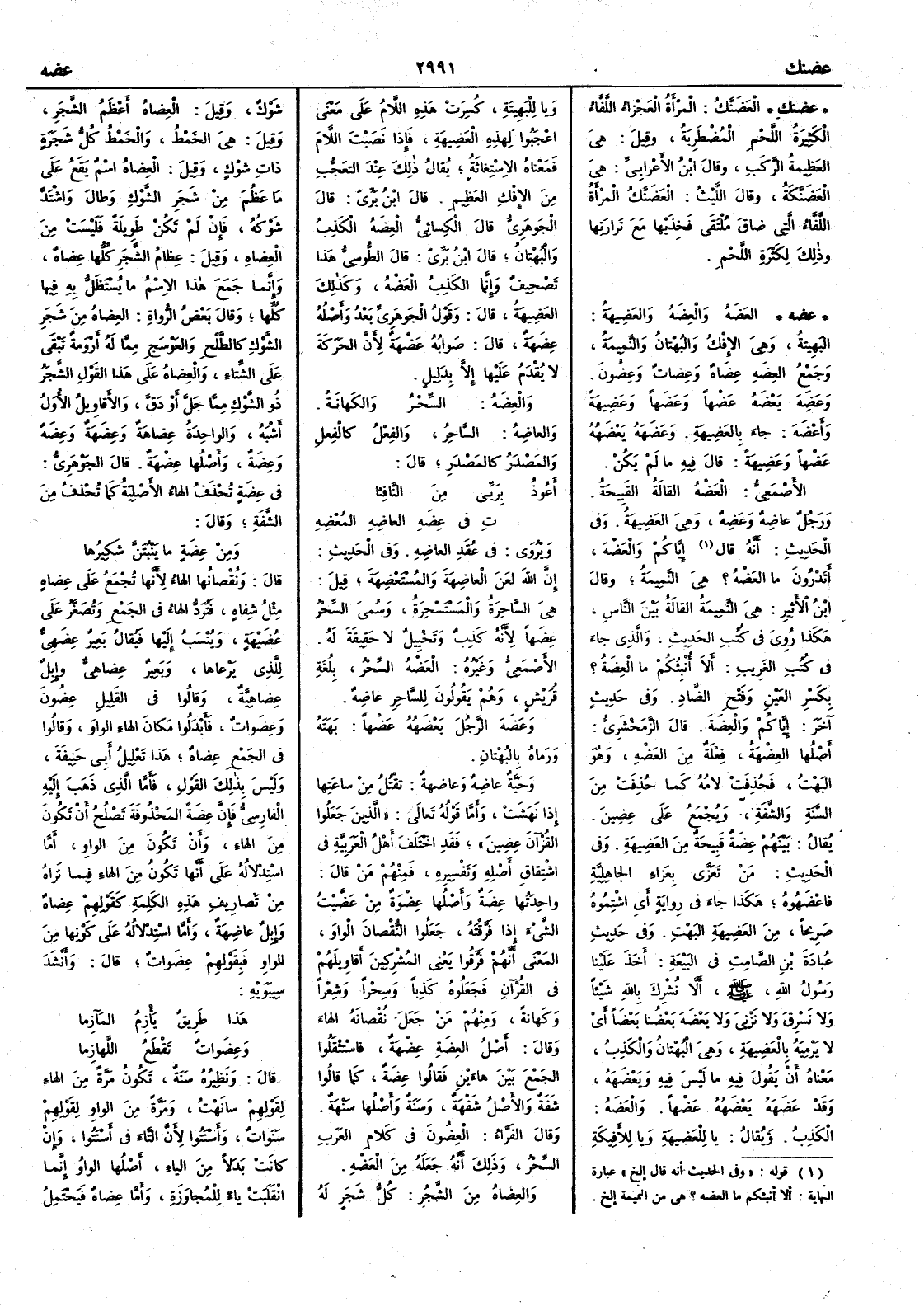 ( * قوله « وفي الحديث أَنه قال إلخ » عبارة النهاية الا أنبئكم ما العضه ؟ هي من النميم إلخ ) إِيَّاكُمْ والعَضْهَ أَتَدْرونَ ما العَضْه ؟ هي النَّميمة وقال ابن الأَثير هي النميمة القالةُ بين الناس هكذا روي في كتب الحديث والذي جاء في كتب الغريب أَلا أُنْبئُكم ما العِضَةُ ؟ بكسر العين وفتح الضاد وفي حديث آخَر إِيِّاكُمْ والعِضَةَ قال الزمخشري أَصلها العِضْهَةُ فِعْلَةٌ من العَضْه وهو البَهْتُ فحذف لامه كما حذفت من السَّنة والشَّفَة ويجمع على عِضِينَ يقال بينهم عِضَةٌ قبيحةٌ من العَضِيهةِ وفي الحديث مَنْ تَعَزَّى بعَزاء الجاهلية فاعْضَهُوه هكذا جاء في رواية أَي اشْتِموهُ صريحاً من العَضِيهَة البَهْت وفي حديث عُبادةَ بن الصامِتِ في البَيْعة أَخَذَ علينا رسولُ الله صلى الله عليه وسلم أَن لا نُشْرِك بالله شيئاً ولا نَسْرِقَ ولا نَزْنيَ ولا يَعْضَهَ بعضُنا بعضاً أَي لا يَرْمِيَه بالعَضِيهة وهي البُهْتانُ والكذبُ معناه أَن يقول فيه ما ليس فيه ويَعْضَهَه وقد عَضَهَه يَعْضَههُ عَضْهاً والعَضَهُ الكذِبُ ويقال يا لِلْعضِيهة ويا للأَفِيكةِ ويا لِلْبَهيتةِ كُسِرَتْ هذه اللامُ على معنى اعْجَبُوا لهذه العَضيهةِ فإِذا نصبْتَ اللامَ فمعناه الاستغاثة يُقال ذلك عند التعَجُّب من الإِفْكِ العظيم قال ابن بري قال الجوهري قال الكسائي العِضَهُ الكذبُ والبُهْتانْ قال ابن بري قال الطوسي هذا تصحيف وإِنما الكذب العَضْهُ وكذلك العَضيهةُ قال وقول الجوهري بعدُ وأَصله عِضَهةٌ قال صوابه عَضْهة لآَن الحركة لا يُقْدَم عليها إِلا بدليل والعِضَهُ السِّحْرُ والكَهانةُ والعاضِهُ الساحرُ والفعلُ كالفعلِ والمصدرُ كالمصدرِ قال أَعُوذُ بربي من النَّافِثا تِ في عِضَهِ العاضِه المُعْضِه ويروى في عُقَدِ العاضِه وفي الحديث إِن اللهَ لعَنَ العاضِهةَ والمُسْتَعْضِهةَ قيل هي الساحرةُ والمسْتَسْحِرة وسُمِّيَ السحرُ عِضَهاً لأَنه كذبٌ وتَخْييلٌ لا حقيقةَ له الأَصمعي وغيره العَضْهُ السِّحْرُ بلغة قريش وهم يقولون للساحر عاضِهٌ وعَضَهَ الرجلَ يَعْضَهُه عَضْهاً بَهَتَه ورماه بالبُهْتانِ وحَيَّةٌ عاضِهٌ وعاضِهةٌ تقْتُل من ساعتها إِذا نَهَشَتْ وأَما قوله تعالى الذين جَعَلُوا ا لقُرْآنَ عِضِينَ فقد اختلف أَهلُ العربية في اشتقاق أَصله وتفسيرِه فمنهم من قال واحدتُها عِضَةٌ وأَصلها عِضْوَةٌ من عَضَّيْتُ الشيءَ إِذا فَرَّقْته جعلوا النُّقْصان الواوَ المعنى أَنهم فَرَّقُوا عن المشركين أَقاوِيلَهم في القرآن فجعلوه كذِباً وسِحْراً وشِعْراً وكَهانةً ومنهم من جعل نُقْصانَه الهاء وقال أَصلُ العِضَة عِضْهةٌ فاستثْقَلُوا الجمع بين هاءين فقالوا عِضَةٌ كما قالوا شَفَة والأَصل شَفْهَة وسَنَة وأَصلها سَنْهَة وقال الفراء العِضُون في كلام العرب السِّحْرُ وذلك أَنه جعله من العَضْهِ والعِضاهُ من الشجر كل شجر له شَوْكٌ وقيل العِضاهُ أَعظمُ الشجر وقيل هي الخمْطُ والخَمْطُ كلُّ شجرةٍ ذاتِ شوْكٍ وقيل العِضاهُ اسمُ يقع على ما عَظُم من شجر الشَِّوْك وطالَ واشتدَ شَوْكُه فإِن لم تكن طويلةً فليست من العِضاه وقيل عِظامُ الشجر كلُّها عِضاهٌ وإِنما جَمع هذا الاسمُ ما يُسْتظلُّ به فيها كلّها وقال بعض الرواة العِضاهُ من شجرِ الشَّوْكِ كالطَّلْح والعَوْسَجِ مما له أَرُومةٌ تبقى على الشِّتاء والعِضاهُ على هذا القول الشجرُ ذو الشَّوْك مما جَلَّ أَو دَقَّ والأَقاويلُ الأُوَلُ أَشْبَهُ والواحدة عِضاهةٌ وعِضَهَةٌ وعِضَهٌ وعِضَةٌ وأَصلها عِضْهةٌ قال الجوهري في عِضَةٍ تحذف الهاءُ الأَصليّة كما تُحْذف من الشَّفَة وقال ومِنْ عِضَةٍ ما يَنْبُتَنَّ شَكيرُها قال ونُقْصانُها الهاءُ لأَنها تُجْمع على عِضاهٍ مثل شفاهٍ فتُرَدُّ الهاءُ في الجمع وتُصَغَّرُ على عُضَيْهَة ويُنْسَب إِليها فيقال بَعِيرٌ عِضَهِيٌّ للذي يَرْعاها وبَعِيرٌ عِضاهِيٌّ وإِبلٌ عِضاهِيَّةٌ وقالوا في القليل عِضُونَ وعِضَوات فأَبْدَلوا م