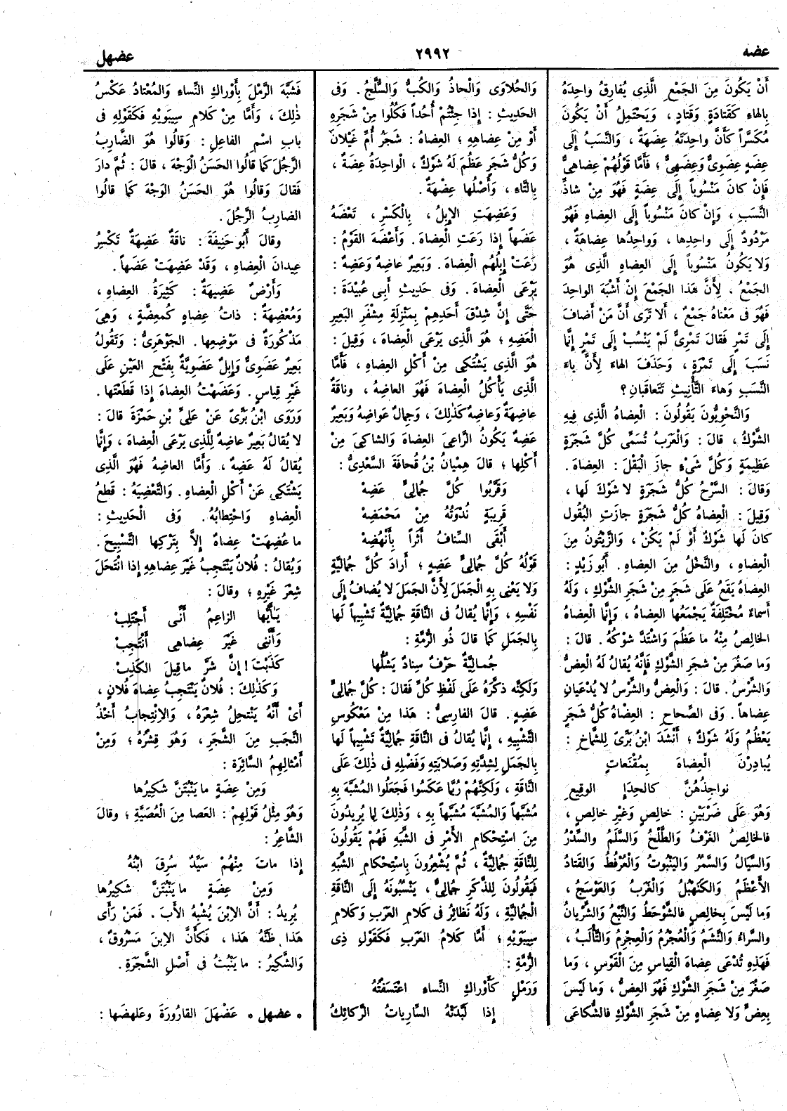 أَن يكون من الجمع الذي يفارق واحدَه بالهاء كقَتادةٍ وقَتادٍ ويحتمل أَن يكون مكسراً كأَن واحدتَه عِضَهَةٌ والنسب إِلى عِضَهٍ عِضَوِيٌّ وعِضَهِيٌّ فأَما قولهم عِضاهِيٌّ فإِن كان منسوباً إِلى عضة فهو من شاذِّ النسب وإِن كان منسوباً إِلى العِضاه فهو مردودٌ إِلى واحدها وواحدُها عضاهةٌ ولا يكون منسوباً إِلى العضاه الذي هو الجمع لأَن هذا الجمع وإِن أَشْبَهَ الواحد فهو في معناه جَمْعٌ أَلا ترى أَن مَنْ أَضافَ إِلى تَمْرٍ فقال تَمْريّ لم يَنْسُب إِلى تَمْرٍ إِنما نسَبَ إِلى تَمْرةٍ وحذف الهاء لأَن ياء النسب وهاءَ التأْنيث تَتَعاقَبان ؟ والنحويون يقولون العِضاهُ الذي فيه الشَّوْك قال والعرب تُسَمِّي كلَّ شجرةٍ عظيمةٍ وكلَّ شيء جاز البَقْلَ العِضاهَ وقال السَّرْحُ كلُّ شجرة لا شَوْكَ لها وقيل العِضاه كلُّ شجرة جازت البُقول كان لها شَوْكٌ أَو لم يكن والزَّيْتُونُ من العِضاه والنَّخْل من العِضاه أَبو زيد العضاهُ يَقَع على شجرٍ من شجر الشَّوْك وله أَسماءٌ مختلفة يجمعها العِضاهُ وإِنما ا لعِضاهُ الخالصُ منه ما عَظُمَ واشتدَّ شوكُه قال وما صَغُر من شجر الشَّوْك فإِنه يقال له العِضُّ والشِّرْسُ قال والعِضُّ والشِّرْسُ لا يُدْعَيانِ عِضاهاً وفي الصحاح العِضاه كلُّ شجر يَعْظُم وله شوك أَنشد ابن بري للشماخ يُبادِرْنَ العِضاهَ بمُقْنعاتٍ نواجذُهُنَّ كالحِدَإِ الوَقيعِ وهو على ضربين خالص وغير خالصٍ فالخالصُ الغَرْفُ والطَّلْحُ والسَّلَم والسِّدْر والسَّيَال والسَّمُر واليَنْبوتُ والعُرْفُطُ والقَتادُ الأَعظمُ والكَنَهْبُلُ والغَرَبُ والعَوْسَجُ وما ليس بخالص فالشَّوْحَطُ والنَّبْعُ والشِّرْيانُ والسَّرَاءُ والنَّشَمُ والعُجْرُمُ والعِجْرِمُ والتَّأْلَبُ فهذه تُدْعَى عِضاهَ القِياسِ من القَوْسِ وما صَغُرَ من شجر الشوك فهو العِضُّ وما ليس بعِضٍّ ولا عِضاهٍ من شجر الشَّوْكِ فالشُّكاعَى والحُلاوَى والحاذُ والكُبُّ والسُّلَّجُ وفي الحديث إِذا جئتم أُحُداً فكُلُوا من شجره أَو من عِضاهِه العِضاهُ شجرُ أُمِّ غَيْلانَ وكلُِّ شجر عَظُمَ له شوكٌ الواحدَةُ عِضَةٌ بالتاء وأَصلها عِضْهَةٌ وعَضِهَتِ الإِبلُ بالكسر تَعْضَهُ عَضَها إِذا رعت العِضاهَ وأَعْضَهَ القومُ رعت إِبلُهم العِضاه وبعيرٌ عاضِهٌ وعَضِهٌ يرعى العضاه وفي حديث أَبي عبيدة حتى إِن شِدْق أَحَدهم بمنزلة مِشْفَر ا لبعير العَضِه هو الذي يرعى العضاه وقيل هو الذي يشتكي من أَكل العضاه فأَما الذي يأْكل العِضاهَ فهو العاضِهُ وناقة عاضِهَةٌ وعاضِهٌ كذلك وجِمالٌ عَواضِهُ وبعير عَضِهٌ يكون الراعِيَ العِضاهَ والشاكِيَ من أَكلها قال هِمْيانُ بن قُحافَةَ السَّعْدِيّ وقَرَّبوا كلَّ جُمالِيٍّ عَضِهْ قَرِيبةٍ نُدْوَتُه من مَحْمَضِهْ أَبْقَى السِّنافُ أَثراً بأَنْهُضِهْ قوله كلَّ جُمالِيٍّ عَضِه أَراد كل جُماليَّةٍ ولا يَعْني به الجملَ لأَن الجمل لا يضاف إِلى نفسه وإِنما يقال في الناقة جُمالِيَّة تشبيهاً لها بالجمل كما قال ذو الرمة جُمالِيَّةٌ حَرْفٌ سِنادٌ يَشُلُّها ولكنه ذكَّره على لفظ كل فقال كلَّ جُمالِيٍّ عضه قال الفارسي هذا من معكوس التشبيه إِنما يقال في الناقةِ جُماليَّة تشبيهاً لها بالجمل لشدّته وصلابته وفضله في ذلك على الناقة ولكنهم ربما عكسوا فجعلوا المشبه به مشبهاً والمشبه مشبهاً به وذلك لِما يريدون من استحكام الأَمر في الشَّبَه فهم يقولون للناقةِ جُمالِيَّةٌ ثم يُشْعِرُونَ باستحكام الشَّبَهِ فيقولون للذكر جُمالِيٌّ ينسبونه إِلى الناقة الجُماليَّة وله نظائر في كلام العرب وكلام سيبويه أَما كلام العرب فكقول ذي الرمة ورَمْلٍ كأَوْراكِ النساءِ اعْتَسَفْتُه إِذا لَبَّدَتْهُ السارياتُ الرَّكائِكُ فشبه الرمل بأَوراك النساء والمعتاد عكس ذلك وأَما من كلام سيبويه فكقوله في باب اسم الفاعل وقالوا هو الضاربُ الرجلَ كما قالوا الحَسَنُ الوَجْهَ قال ثم دار فقال وقالوا هو الحَسَنُ الوَجْ