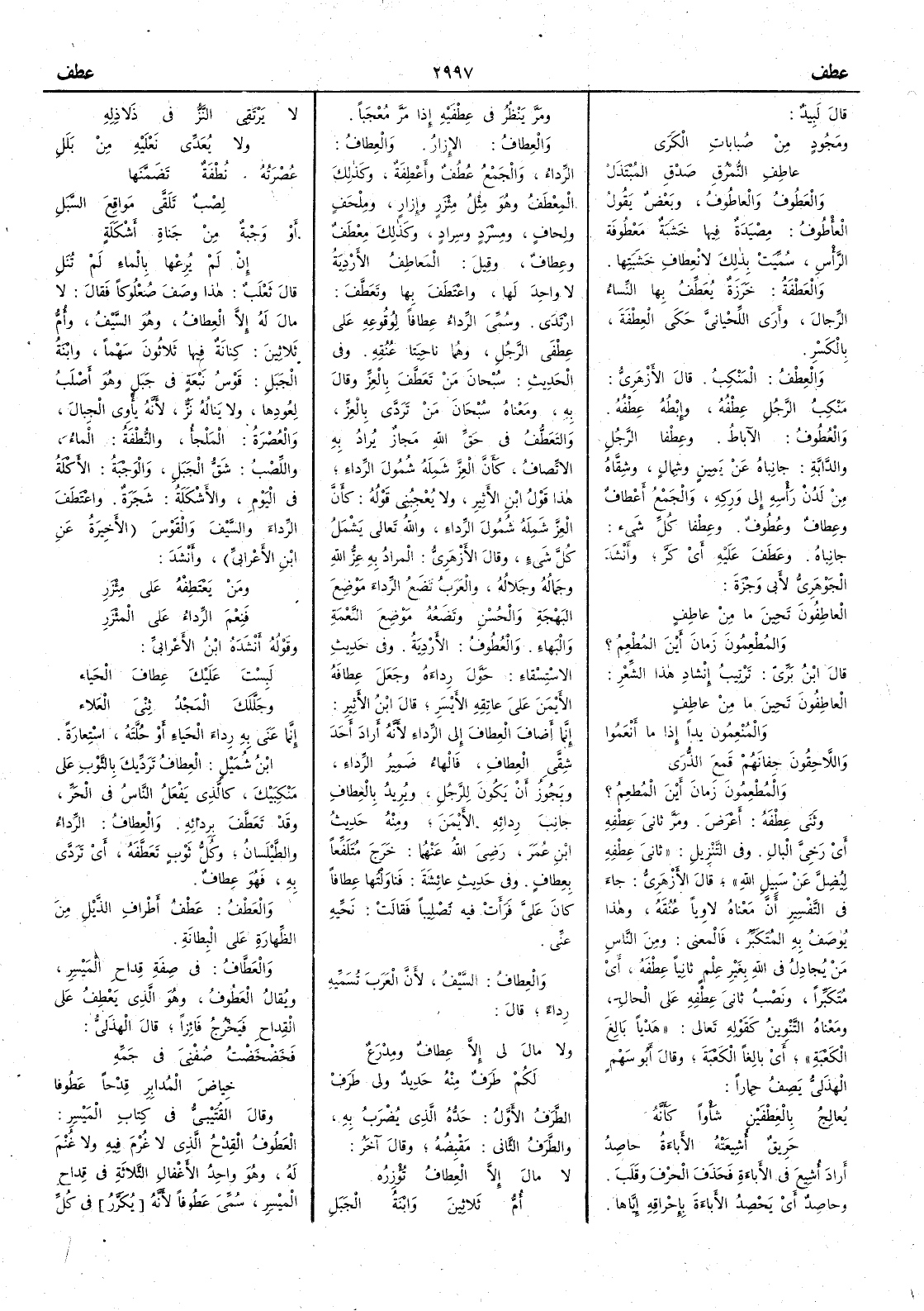 قال لبيد ومَجُودٍ من صُباباتِ الكَرَى عاطِفِ النُّمْرُقِ صَدْقِ المُبْتَذَلْ والعَطُوفُ والعاطُوفُ وبعض يقول العأْطُوف مِصْيَدةٌ فيها خشبة مَعطوفة الرأْس سميت بذلك لانعطاف خشبتها والعَطْفةُ خَرَزَة يُعَطِّفُ بها النساء الرجالَ وأَرى اللحياني حكى العِطْفة بالكسر والعِطْفُ المَنْكِب قال الأَزهري مَنكِب الرجل عِطْفه وإبْطُه عِطْفُه والعُطوف الآباطُ وعِطْفا الرجل والدابة جانباه عن يمين وشمال وشِقَّاه من لَدُنْ رأْسه وَرِكه والجمع أَعْطاف وعِطاف وعُطُوف وعِطْفا كل شيء جانباه وعطَف عليه أَي كَرَّ وأَنشد الجوهري لأَبي وجزة العاطِفُون تَحِينَ ما من عاطِفٍ والمُطْعِمُون زَمان أََيْنَ المُطْعِمُ ؟ قال ابن بري ترتيب إنشاد هذا الشعر العاطفون تَحِينَ ما من عاطِفٍ والمُنْعِمُون يداً إذا ما أَنْعَمُوا واللاَّحِقُون جِفانَهم قَمعَ الذُّرَى والمُطْعِمُون زمان أَينَ المُطعِمُ ؟ وثنَى عِطْفَه أَعْرض ومرَّ ثاني عِطْفِه أَي رَخيَّ البالِ وفي التنزيل ثاني عِطْفِه ليُضِلَّ عن سبيل اللّه قال الأَزهري جاء في التفسير أَن معناه لاوِياً عُنقَه وهذا يوصف به المتكبِّر فالمعنى ومِن الناس من يُجادِل في اللّه بغير علم ثانياً عِطفَه أَي متكبراً ونَصْبُ ثانيَ عطفه على الحال ومعناه التنوين كقوله تعالى هَدْياً بالِغَ الكعْبةِ أَي بالِغاً الكعبةَ وقال أَبو سهم الهذلي يصف حِماراً يُعالِج بالعِطْفَينِ شَأْواً كأَنه حَريقٌ أُّشِيعَتْه الأَباءَةُ حاصِدُ أَراد أُشِيعَ في الأَباءة فحذف الحرف وقلَب وحاصِدٌ أَي يَحْصُِدُ الأَباءة بإِحْراقه إياها ومرَّ ينظُر في عِطفَيْه إذا مرَّ مُعجَباً والعِطافُ الإزار والعِطافُ الرِّداء والجمع عُطُفٌ وأَعْطِفة وكذلك المِعْطَفُ وهو مثل مئْزر وإزار وملِحَف ولِحاف ومِسْرَد وسِرادٍ وكذلك مِعْطف وعِطافٌ وقيل المَعاطِفُ الأَرْدِيةُ لا واحد لها واعْتَطَفَ بها وتعطَّف ارْتدى وسمي الرِّداء عِطافاً لوقُوعه على عِطْفَي الرّجل وهما ناحيتا عنقه وفي الحديث سُبحان مَن تعطَّف بالعِزِّ وقال به ومعناه سبحان من تَرَدَّى بالعز والتعطُّف في حقِّ اللّه مَجازٌ يُراد به الاتّصاف كأَنَّ العز شَمِله شُمولَ الرِّداء هذا قول ابن الأَثير ولا يعجبني قوله كأَنّ العز شَمله شمولَ الرِّداء واللّه تعالى يشمل كل شيء وقال الأَزهري المراد به عز اللّه وجَماله وجَلاله والعرب تضع الرِّداء موضع البَهْجة والحُسن وتَضَعُه موضع النَّعْمة والبهاء والعُطوفُ الأَرْدِيةُ وفي حديث الاستسقاء حَوَّل رِداءه وجعل عِطافَه الأَيمنَ على عاتقه الأَيسر قال ابن الأَثير إنما أَضاف العِطاف إلى الرِّداء لأنه أَراد أَحد شِقّي العِطاف فالهاء ضمير الرداء ويجوز أَن يكون للرجل ويريد بالعِطافِ جانبَ ردائه الأَيمن ومنه حديث ابن عمر رضي اللّه عنهما خرج مُتَلَفِّعاً بعِطاف وفي حديث عائشة فناولتها عِطافاً كان عليَّ فرأَت فيه تَصْلِيباً فقالت نَحِّيه عنّي والعِطاف السيف لأَن العرب تسميه رداء قال ولا مالَ لي إلا عِطافٌ ومِدْرَعٌ لكم طَرَفٌ منه حَديدٌ ولي طَرَفْ الطَّرَفْ الأَوَّلُ حَدُّه الذي يُضرب به والطرَف الثاني مَقْبِضُه وقال آخر لا مالَ إلا العِطافُ تُؤْزِرهُ أُمُّ ثلاثين وابنةُ الجَبَلِ لا يَرْتَقي النَّزُّ في ذَلاذِلِه ولا يُعَدِّي نَعْلَيْه مِنْ بَلَلِ عُصْرَتُه نُطْفةٌ تَضَمَّنَها لِصْبٌ تَلَقَّى مَواقِعَ السَّبَلِ أَو وَجْبةٌ مِن جَناةِ أَشْكَلةٍ إن لم يُرِعْها بالماء لم تُنَلِ قال ثعلب هذا وصَف صُعْلوكاً فقال لا مالَ له إلا العِطافُ وهو السيف وأُم ثلاثين كنانة فيها ثلاثون سهماً وابنةُ الجبل قَوسُ نَبْعةٍ في جبل وهو أَصْلَبُ لعُودها ولا يناله نزٌّ لأَنه يأْوي الجبال والعُصرة المَلْجأُ والنُّطفة الماء واللِّصْب شَقُّ الجبل والوَجْبة الأَكْلة في اليوم والأَشْكَلة شجرة واعْتَطَفَ الرِّداءَ والسيفَ والقوس الأَخيرة عن ابن الأَعرابي وأَنشد ومَن يَعْتَطِفْه على مِئْ