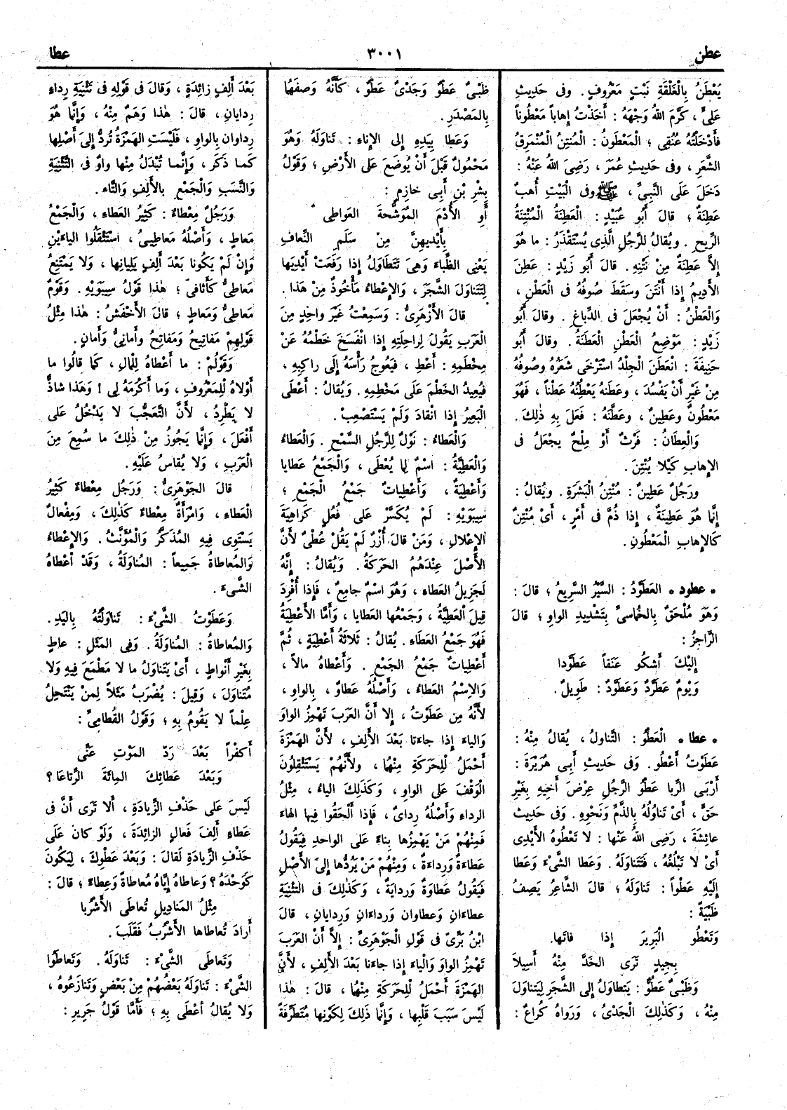 ( عطا ) العَطْوُ التَّناوُلُ يقال منه عَطَوْت أَعْطُو وفي حديث أَبي هريرة أَرْبَى الرِّبا عَطْوُ الرجُلِ عِرْضَ أَخِيه بغَير حَقٍّ أَي تَناوُلُه بالذَّمِّ ونحوه وفي حديث عائشة رضي الله عنها لا تَعْطُوهُ الأَيْدِي أَي لا تَبْلُغُه فتَتناوَلَه وعَطا الشيءَ وعَطا إِليه عَطْواً تَناوَله قال الشاعر يصف ظبية وتَعْطُو البَرِيرَ إِذا فاتَها بِجِيدٍ تَرَى الخَدِّ منه أَسِيلاَ وظَبيٌ عَطُوٌّ يَتطاوَلُ إِلى الشَّجَر ليَتناولَ منه وكذلك الجَدْي ورواه كُراع ظَبْيٌ عَطْوٌ وجَدْي عَطْوٌ كأَنه وصفَهُما بالصدر وعَطا بيدِه إِلى الإِناء تَناوَله وهو محمولٌ قَبل أَن يُوضَع على الأَرض وقول بشر بن أَبي خازم أَو الأُدْم المُوَشَّحةَ العَواطِي بأَيْدِيهِنَّ مِنْ سَلَمِ النِّعافِ يعني الظِّباء وهي تَتطاوَلُ إِذا رَفَعت أَيْدِيها لتَتَناوَل الشَّجَر والإِعْطاءُ مأْخوذٌ من هذا قال الأَزهري وسَمِعتُ غير واحدٍ من العَرَب يقول لراحِلَته إِذا انْفَسَحَ خَطْمُه عن مِخْطَمِه أَعْطِ فيَعُوجُ رأْسه إِلى راكبه فيُعِيدُ الخَطْمَ على مَخْطِمِه ويقال أَعْطَى البعِيرُ إِذا انْقادَ ولم يَسْتَصْعِبْ والعَطاء نَوْلٌ للرجُلِ السَّمْحِ والعَطاءُ والعَطِيَّة اسمٌ لما يُعْطَى والجمع عَطايا وأَعْطِيَة وأَعْطِياتٌ جمعُ الجَمع سيبويه لم يُكَسَّر على فُعُل كراهية الإِعْلالِ ومن قال أُزْرٌ لم يقل عُطْيٌ لأَن الأَصل عندَهم الحركة ويقال إِنَّه لَجَزيلُ العَطاء وهو اسمٌ جامِعٌ فإذا أُفرِد قيلَ العَطيَّة وجمعُها العَطايا وأَمَّا الأَعطية فهو جَمْع العَطاء يقال ثلاثةُ أَعْطِيةٍ ثم أَعْطِياتٌ جمعُ الجمعِ وأَعطاه مالاً والاسمُ العَطاء وأَصله عَطارُ بالواو لأَنه من عَطَوْت إِلا أَنَّ العرب تَهْمِزُ الواوَ والياء إِذا جاءتا بعد الأَلف لأَنَّ الهمزة أَحْمَل للحركة منهما ولأَنهم يستثقلون الوقف على الواو وكذلك الياءُ مثل الرداءِ وأَصله رِدايٌ فإِذا أَلْحقوا فيها الهاء فمنهم من يهمزها بناءً على الواحد فيقول عَطاءَةٌ ورِداءَةٌ ومنهم من يَرُدُّها إِلى الأَصل فيقول عَطاوة ورداية وكذلك في التثنية عطاءَان وعطاوان ورداءَان وردايان قال ابن بري في قول الجوهري إِلا أَن العرب تهمز الواوَ والياء إذا جاءَتا بعد الأَلف لأنّ الهمزة أَحْمل للحركة منهما قال هذا ليس سبَب قَلْبِها وإِنما ذلك لكَوْنها متَطَرِّفة بعد أَلِفٍ زائدة وقال في قوله في تثنية رداء ردايان قال هذا وهَمٌ منه وإنما هو رِداوانِ بالواو فليست الهمزةُ تُرَدُّ إِلى أضصْلِها كما ذَكَر وإِنما تُبْدل منها واوٌ في التثنية والنسَب والجمعِ بالأَلف والتاءِ ورجلٌ مِعْطاءٌ كثيرُ العَطاءِ والجمعُ مَعاطٍ وأَصلُّه معاطِييُ اسْتَثْقلُوا الياءَيْن وإِن لم يكونا بعد أَلِفٍ يَلِيانِها ولا يمتَنع مَعاطِيّ كأَثافيّ هذا قول سيبويه وقومٌ مَعاطِيُّ ومَعاطٍ قال الأَخفش هذا مثلُ قولِهِم مَفاتِيح ومَفاتِح وأَمانيّ وأَمانٍ وقولهم ما أَعْطاهُ للمال كما قالوا ما أَولاه للمَعْروف وما أَكْرَمَه لي وهذا شاذّ لا يَطرّد لأَن التعجّب لا يدخل على أَفْعَلَ وإنما يجوز من ذلك ما سُمِع من العرب ولا يقاسُ عليه قال الجوهري ورجلٌ مِعطاءٌ كثير العَطاء وامرأة مِعْطاءٌ كذلك ومِفْعالٌ يَسْتَوِي فيه المذكَّر والمؤنَّث والإِعْطاء والمُعاطاةُ جميعاً المُناوَلة وقد أَعْطاهُ الشيءَ وعَطَوْتُ الشيءَ تَناوَلْته باليَدِ والمُعاطاة المُناوَلة وفي المَثل عاطٍ بغَيرِ أَنْواط أَي يَتَناوَلُ ما لا مَطْمَع فيه ولا مُتَناوَل وقيل يُضْرَب مثلاً لمن يَنْتَحِلُ عِلْماً لا يقومُ به وقول القُطامي أَكُفْراً بعدَ رَدِّ المَوْتِ عَنِّي وبعدَ عَطائِكَ المِاثَةَ الرِّتاعَا ؟