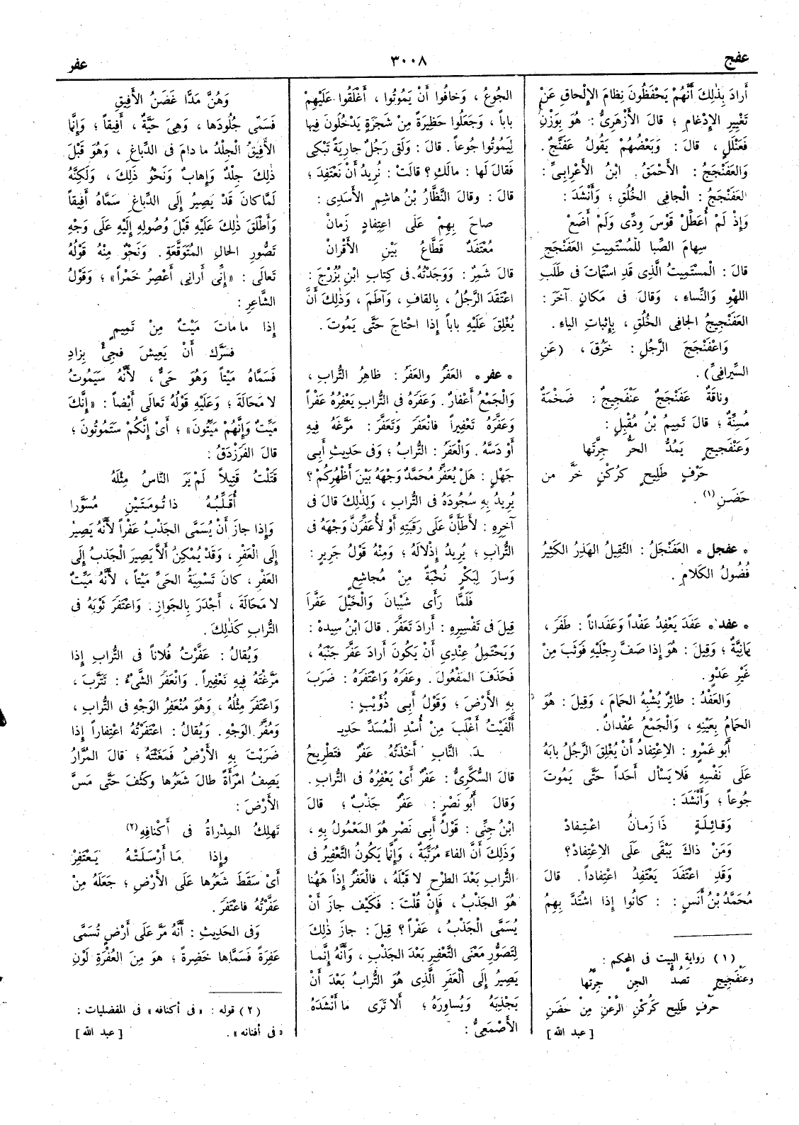 أَراد بذلك أَنهم يحفظون نِظام الإِلحاق عن تغيير الإِدغام قال الأَزهري هو بوزن فَعَنْلَل قال وبعضهم يقول عَفَنَّج والعَفَنْجَجُ الأَحمق ابن الأَعرابي العَفَنْجَجُ الجافي الخَلْق وأَنشد وإِذْ لم أُعَطِّلْ قَوْسَ وِدِّي ولم أَضعْ سِهامَ الصِّبا للْمُسْتَمِيتِ العَفَنْجَج قال المسْتَميت الذي قد اسْتَمات في طلب اللَّهو والنساء وقال في مكان آخر العَفَنْجيجُ الجافي الخلق بإِثبات الياء واعْفَنْجَجَ الرجل خَرُق عن السيرافي وناقة عَفَنْجَجٌ عَنْفَجيج ضخمة مسنَّة قال تميم بن مقبل وعَنْفَجيج يَمُدُّ الحَرُّ جِرَّتَها حَرْف طَلِيح كرُكْنٍ خَرَّ من حَضَنِ ( عفجل ) العَفَنْجَلُ الثَّقيلُ الهَذِرُ الكثير فُضُول الكلام( عفد ) عَفَدَ يَعْفِد عَفْداً وعَفَداناً طَفَرَ يمانية وقيل هو إِذا صف رجليه فوثب من غير عَدْو والعَفْد طائر يشبه الحَمام وقيل هو الحمام بعينه والجمع عُفْدانٌ أَبو عمرو الاعْتِفادُ أَن يُغْلِقَ الرجل بابَهُ على نفسه فلا يسأَل أَحداً حتى يموت جوعاً وأَنشد وقائلةٍ ذَا زَمانُ اعْتِفادِ ومَن ذاكَ يَبْقى على الاعْتِفاد ؟ وقد اعْتَفَدَ يَعْتَفِدُ اعتِفاداً قال محمد بن أَنس كانوا إِذا اشتدّ بهم الجوع وخافوا أَن يموتوا أَغْلَقوا عليهم باباً وجعلوا حظيرة من شجرة يدخلون فيها ليموتوا جوعاً قال ولقي رجل جارية تبكي فقال لها مالك ؟ قالت نريد أَن نعتفد قال وقال النظار بن هاشم الأَسدي صاحَ بِهِم على اعتِفادٍ زَمانْ مُعْتَفَدٌ قَطَّاعُ بَيْنِ الأَقْرانْ قال شمر ووجدته في كتاب ابن بُزُرْج اعْتَقَدَ الرجلُ بالقاف وآطَمَ وذلك أَن يُغْلق عليه باباً إِذا احتاج حتى يموت