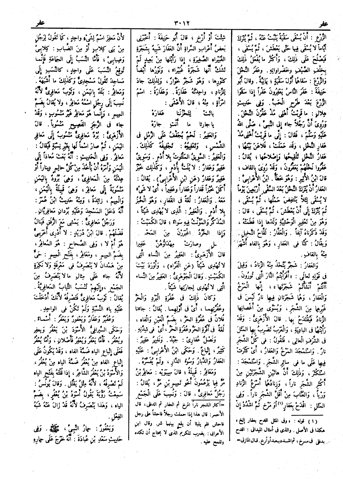 ( * قوله « وفي المثل أقدح بعفار إلخ » هكذا في الأَصل والذي في أمثال الميداني اقدح بدفلي في مرخ ثم اشدد بعد أو ارخ قال المازني أَكثر الشجر ناراً المرخ ثم العفار ثم الدفلى قال الأَحمر يقال هذا إِذا حملت رجلاً فاحشاً على رجل فاحش فلم يلبثا أَن يقع بينهما شر وقال ابن الأَعرابي يضرب للكريم الذي لا يحتاج أَن تكدّه وتلح عليه ) أَو مَرْخ ثم اشدُدْ إِن شئْتَ أَو أَرْخ قال أَبو حنيفة أَخبرني بعضُ أَعراب السراة أَن العَفَارَ شَبِيةٌ بشجرة الغُبَيراء الصغيرة إِذا رأَيتها من بعيد لم تَشُكَّ أَنها شجرة غُبَيراء ونَوْرُها أَيضاً كنَوْرِها وهو شجر خَوَّار ولذلك جاد للزِّناد واحدته عَفارةٌ وعَفَارةُ اسم امرأَة منه قال الأَعشى باتَتْ لِتَحْزُنَنا عَفارهْ يا جارتا ما أَنْتِ جارهْ والعَفِيرُ لحمٌ يُجَفَّف على الرمل في الشمس وتَعْفِيرُه تَجْفِيفُه كذلك والعَفِيرُ السويقُ المَلتوتُ بلا أُدْمٍ وسَويقٌ عَفِير وعَفَارٌ لا يُلَتُّ بأُدْم وكذلك خُبز عَفِير وعَفار عن ابن الأَعرابي يقال أَكلَ خُبزاً قَفاراً وعَفاراً وعَفِيراً أَي لا شيء معه والعَفارُ لغة في القَفار وهو الخبز بلا أُدم والعَفِير الذي لا يُهْدِي شيئاً المذكر والمؤنث فيه سواء قال الكميت وإِذا الخُرَّدُ اعْتَرَرْن من المَح لِ وصارَتْ مِهْداؤهُنَّ عَفِيرا قال الأَزهري العَفِيرُ من النساء التي لا تُهْدِي شيئاً عن الفراء وأَورد بيت الكميت وقال الجوهري العَفِيرُ من النساء التي لا تُهْدِي لجارتها شيئاً وكان ذلك في عُفْرةِ البرد والحرّ وعُفُرَّتِهما أَي في أَولهما يقال جاءنا فلان في عُفَّرةِ الحر بضم العين والفاء لغة في أُفُرَّة الحر وعُفْرةِ الحر أَي في شدته ونَصْلٌ عُفارِيّ جيِّد ونَذِيرٌ عَفِيرٌ كثير إِتباع وحكي ابن الأَعرابي عليه العَفارُ والدَّبارُ وسوءُ الدارِ ولم يفسره ومَعافِرُ قبيلة قال سيبويه مَعافِر بن مُرّ فيما يزعمون أَخو تميم بن مُرّ يقال رجل مَعافِريّ قال ونسب على الجمع لأَن مَعافِر اسم لشيء واحد كما تقول لرجل من بني كلاب أَو من الضِّباب كِلابيّ وضِبابيّ فأَما النسب إِلى الجماعة فإِنما تُوقِع النسب على واحد كالنسب إِلى مساجد تقول مَسْجِدِيّ وكذلك ما أَشبهه ومَعافِر بلد باليمن وثوب مَعافِريّ لأَنه نسب إِلى رجل اسمه مَعافِر ولا يقال بضم الميم وإِنما هو معافِر غير منسوب وقد جاء في الرجز الفصيح منسوباً قال الأَزهري بُرْدٌ مَعافِريّ منسوب إِلى معافِر اليمنِ ثمن صار اسماً لها بغير نسبة فيقال مَعافِر وفي الحديث أَنه بعَث مُعاذاً إِلى اليمَن وأَمره أَن يأْخذ من كل حالِمٍ ديناراً أَو عِدْلَه من المَعافِرِيّ وهي برود باليمن منسوبة إِلى مَعافِر وهي قيبلة باليمن والميم زائدة ومنه حديث ابن عمر أَنه دخل المسجد وعليه بُرْدانِ مَعافِريّانِ ورجل مَعافِريٌّ يمشي مع الرُّفَق فينال فَضْلَهم قال ابن دريد لا أَدري أَعربي هو أَم لا وفي الصحاح هو المُعافِرُ بضم الميم ومَعافِرُ بفتح الميم حيٌّ من هَمْدانَ لا ينصرف في معرفة ولا نكرة لأَنه جاء على مثال ما لا ينصرف من الجمع وإِليهم تنسب الثياب المَعافِريَّة يقال ثوب مَعافِريٌّ فتصرفه لأَنك أَدخلت عليه ياء النسبة ولم تكن في الواحد وعُفَيْرٌ وعَفَار ويَعْفور ويَعْفُرُ أَسماء وحكي السيرافي الأَسْودَ بن يَعْفُر ويُعْفِر ويُعْفُر فأَما يَعْفُر ويُعْفِر فأَصْلانِ وأَما يُعْفُر فعلى إِتباع الياء ضمة الفاء وقد يكون على إِتباع الفاء من يُعْفُر ضمة الياء من يُعْفُر والأَسود بن يَعْفُر الشاعر إِذا قُلْتَه بفتح الياء لم تصرفه لأَنه مثل يَقْتُل وقال يونس سمعت رؤبة يقول أَسود بن يُعْفُر بضم الياء وهذا ينصرف لأَنه قد زال عنه شبَهُ الفعل ويَعْفَورٌ حمارُ النبي صلى الله عليه وسلم وفي حديث سعد ابن عُبادة أَنه خرج على حِمارِه