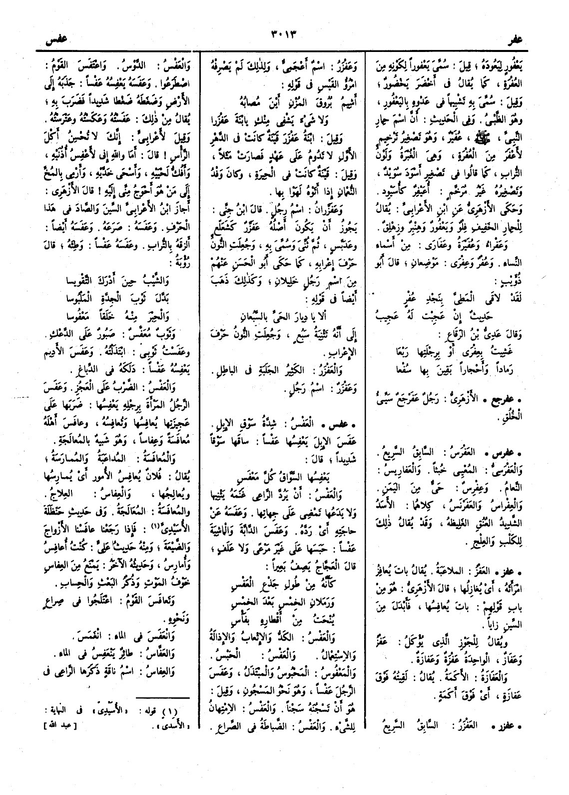 يَعْفور ليعودَه قيل سُمِّيَ يَعْفوراً لكونه من العُفْرة كما يقال في أَخْضَر يَخْضور وقيل سمي به تَشْبِيهاً في عَدْوِه باليَعْفور وهو الظَّبْيُ وفي الحديث أَن اسم حمار النبي صلى الله عليه وسلم عُفَيْر وهو تصغير ترخيم لأَعْفَر من العُفْرة وهي الغُبْرة ولون التراب كما قالوا في تصغير أَسْوَد سُوَيْد وتصغيره غير مرخم أُعَيْفِر كأُسَيْودِ وحكي الأَزهري عن ابن الأَعرابي يقال للحمار الخفيف فِلْوٌ ويَعْفورٌ وهِنْبِرٌ وزِهْلِق وعَفْراء وعُفَيرة وعَفارى من أَسماء النساء وعُفْر وعِفْرَى موضعان قال أَبو ذؤيب لقد لاقَى المَطِيَّ بنَجْدِ عُفْرٍ حَدِيثٌ إِن عَجِبْتَ له عَجِيبُ وقال عدي بن الرِّقَاع غَشِيتُ بِعِفْرَى أَو بِرجْلَتِها رَبْعَا رَماداً وأَحْجاراً بَقِينَ بها سُفْعا ( عفرجع ) الأَزهري رجل عَفَرْجَعٌ سَيِّءُ الخُلُق ( عفرس ) العَفْرس السَّابق السريع والعَفْرَسِيُّ المُعْيِي خُبثاً والعَفاريس النَّعام وعِفْرِس حيّ من اليمن والعِفْراس والعَفَرْنَس كلاهما الأَسد الشديد العُنق الغليظُه وقد يقال ذلك للكلب والعِلْج ( عفز ) العَفْزُ الملاعبة يقال بات يُعافِزُ امرأَتَه أَي يُغازِلُها قال الأَزهري هو من باب قولهم بات يُعافِسُها فأَبدل من السين زاياً ويقال للجَوْزِ الذي يؤكل عَفْزٌ وعَفَازٌ الواحدة عَفْزَةٌ وعَفَازَةٌ والعفازةُ الأَكَمَةُ يقال لَقِيته فوق عَفازَة أَي فوق أَكَمَة ( عفزر ) العَفْزَر السابقُ السريع وعَفْزرُ اسم أَعجمي ولذلك لم يَصرفه امرؤ القيس في قوله أَشِيمُ بُروقَ المخزْنِ أَيْنَ مُصابُه ولا شيءَ يَشْفِي مَنْكِ يا ابنةَ عَفْزَرا وقيل ابنةُ عَفْزَرَ قَينةٌ كانت في الدهر الأَول لا تدوم على عهد فصارت مثلاً وقيل قَيْنةٌ كانت في الحِيرة وكان وَفْدُ النُّعْمان إِذا أَتَوْه لَهَوا بها وعَفَزّرانُ اسم رجل قال ابن جني يجوز أَن يكون أَصله عَفَزّر كشَعَلّعٍ وعَدَبَّسٍ ثم ثني وسمي به وجعلت النون حرف إِعرابه كما حكى أَبو الحسن عنهم من اسم رجل خَليلان وكذلك ذهب أَيضاً في قوله أَلا يا ديارَ الحَيِّ بالسَّبُعان إِلى أَنه تثنبة سبُع وجعلت النون حرف الإِعراب والعَفْزرُ الكثير الجَلَبة في الباطل وعَفْزَرٌ اسم رجل ( عفس ) العَفْس شِدَّة سَوق الإِبل عَفَس الإِبلَ يَعْفِسُها عَفْساً ساقها سَوْقاً شديداً قال يَعْفِسُها السَّوّاق كلَّ مَعْفَسِ والعَفْسُ أَن يردَّ الراعي غنمه يَثْنِيها ولا يدعُها تمضي على جهاتها وعَفَسَه عن حاجته أَي ردَّه وعَفَسَ الدابة والماشية عَفْساً حبَسها على غير مرعى ولا عَلَف قال العجاج يصف بعيراً كأَنه من طُولِ جَذْعِ العَفْسِ ورَمَلانِ الخِمْسِ بعد الخِمْسِ يُنْحَتُ من أَقطارِه بِفَأْسِ والعَفْسُ الكدّ والإِتعاب والإِذالة والاستعمال والعَفْس الحَبْس والمَعْفُوس المحبوس والمُبتذَل وعَفَس الرجلَ عَفْساً وهو نحو المَسْجون وقيل هو أَن تَسْجُنه سَجْناً والعَفْسُ الامتهانُ للشيء والعَفْسُ الضَّباطة في الصِّراع والعَفْس الدَّوْس واعْتَفَس القومُ اصْطَرَعُوا وعَفَسَه يَعْفِسه عَفْساً جذَبه إِلى الأَرض وضغَطَه ضَغْطاً شديداً فضرب به يقال من ذلك عَفَسْتُه وعَكَسْتُه وعَتْرَسْتُه وقيل لأَعرابي إِنك لا تُحسِن أَكلَ الرأْس قال أَما واللَّهِ إِني لأَعْفِسُ أُذُنيه وأَفُكُّ لَحْيَيْه وأَسْحى خَدَّيه وأَرْمي بالمُخِّ إِلى من هو أَحوجُ مِني إِليه قال الأَزهري أَجاز ابن الأَعرابي السين والصاد في هذا الحرف وعَفَسَه صَرَعَه وعَفَسه أَيضاً أَلزقَه بالتراب وعَفَسَه عَفْساً وطِئَه قال رؤبة والشَّيبُ حين أَدْرَك التَّقْويسا بَدَّلَ ثَوْبَ الحِدَّةِ الملبُوسا والحِبْرَ منه خَلَقاً مَعْفُوسا وثوب مُعَفِّس صَبور على الدَّعْك وعَفَسْتُ ثوبي ابتذلته وعَفَسَ الأَديمَ يَعْفِسُه عَفْساً دلكَه في الدِّباغ والعَفْس الضرب على العَجُز وعَفَسَ الرجلُ المرأَة برجله يَعْفِسها ضربَها على عجيزتها يُعافِسُها وتُعافِسُه وعافَسَ أ