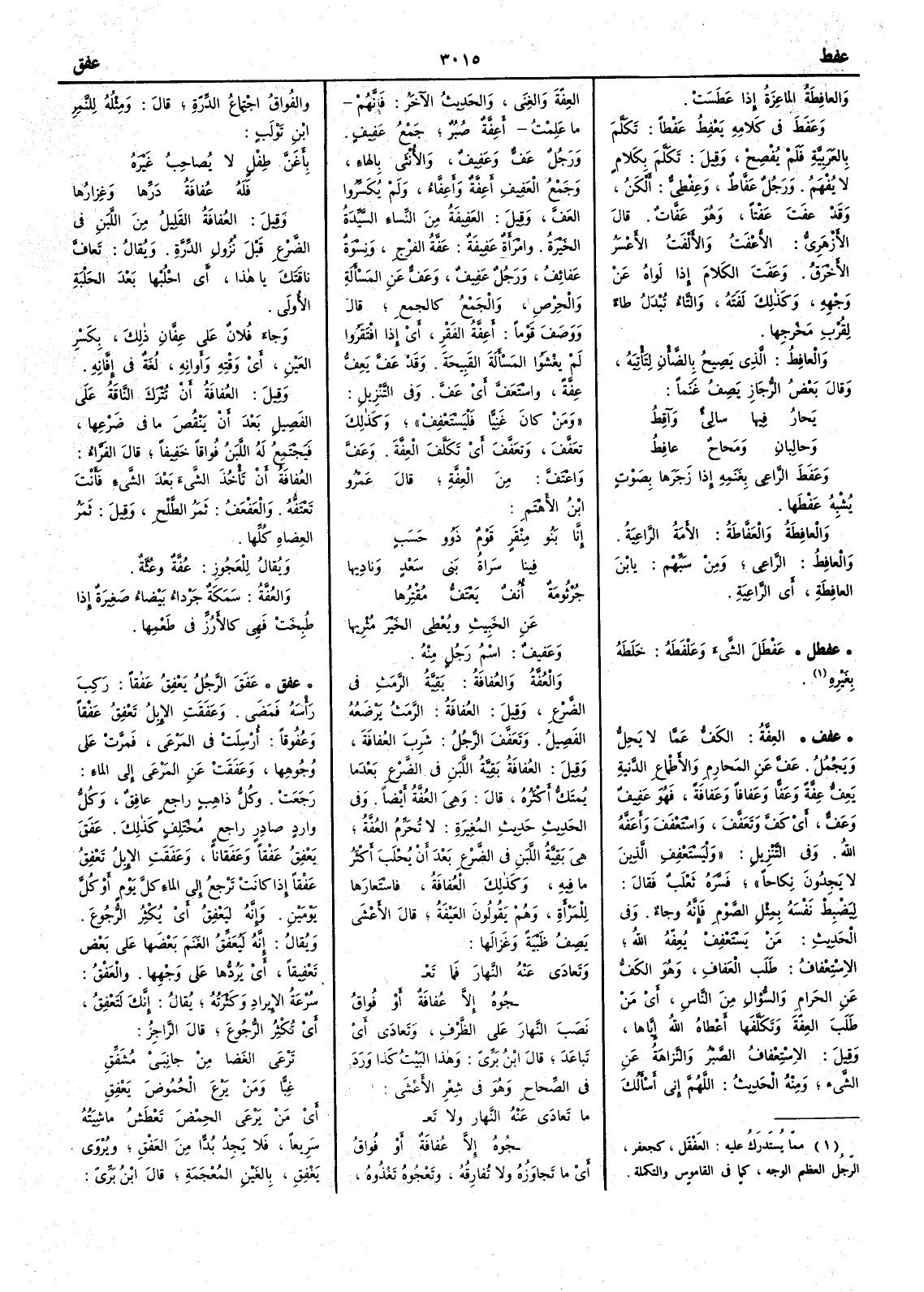 والعافطةُ الماعزة إِذا عطست وعفَط في كلامه يَعْفِط عَفْطاً تكلم بالعربية فلم يُفْصِح وقيل تكلم بكلام لا يُفْهم ورجل عَفَّاط وعِفْطِيّ أَلكن وقد عَفَت عَفْتاً وهو عَفّات قال الأَزهري الأَعْفَتُ والأَلفت الأَعْسَرُ الأَخْرَقُ وعَفَتَ الكلامَ إِذا لَواه عن وجهه وكذلك لَفَتَه والتاء تبدل طاء لقرب مخرجها والعافط الذي يصيح بالضأْن لتأْتيه وقال بعض الرُّجَّازِ يَصِف غنماً يَحارُ فيها سالِئٌ وآفِطُ وحالِبانِ ومَحاحٌ عافِطٌ وعفَط الراعي بغنمه إِذا زجرَها بصوت يُشبه عَفْطَها والعافِطةُ والعَفّاطةُ الأَمة الراعِيةُ والعافِطُ الرَّاعي ومن سَبَّهم يا ابن العافطة أَي الراعِية ( عفطل ) عَفْطَلَ الشيءَ وعَلْفَطَه خَلَطَه بغيره( عفف ) العِفّة الكَفُّ عما لا يَحِلّ ويَجْمُلُ عَفَّ عن المَحارِم والأُطْماع الدَّنِية يَعِفُّ عِفَّةً وعَفّاً وعَفافاً وعَفافة فهو عَفِيفٌ وعَفٌّ أَي كَفَّ وتعفَّفَ واسْتَعْفَفَ وأَعفَّه اللّه وفي التنزيل ولْيَسْتَعْفِف الذين لا يَجِدون نكاحاً فسَّره ثعلب فقال ليَضْبِطْ نفسه بمثل الصوم فإنه وِجاء وفي الحديث من يَسْتَعْفِف يُعِفّه اللّه الاسْتِعْفاف طلَبُ العَفافِ وهو الكَفُّ عن الحرام والسؤال من الناس أَي من طلب العِفّة وتكلَّفها أَعطاه اللّه إياها وقيل الاستعفاف الصبْر والنَّزاهة عن الشيء ومنه الحديث اللهم إني أَسأَلك العِفّة والغِنى والحديث الآخر فإنهم ما علمت أَعِفّةٌ صُبُر جمع عَفِيف ورجل عَفٌّ وعَفِيف والأُنثى بالهاء وجمع العَفِيف أَعِفّة وأَعِفّاء ولم يُكَسِّروا العَفَّ وقيل العَفِيفة من النساء السيدة الخَيْرةُ وامرأَة عَفِيفة عَفّة الفَرج ونسوة عَفائف ورجل عَفِيف وعَفٌّ عن المسأَلة والحَرْصِ والجمع كالجمع قال ووصف قوماً أَعِفّة الفَقْرِ أَي إذا افتقروا لم يغْشَوُا المسأَلة القبيحة وقد عَفَّ يعِفّ عِفَّة واستعَفَّ أَي عَفَّ وفي التنزيل ومن كان غنيّاً فليَستعْفِفْ وكذلك تعَفَّفَ وتعَفَّفَ أَي تكلَّف العِفَّة وعَفَّ واعْتَفَّ من العِفَّة قال عمرو بن الأَهتم إنَّا بَنُو مِنْقَرٍ قومٌ ذَوُو حَسَبٍ فِينا سَراةُ بَني سَعْدٍ وناديها جُرْثُومةٌ أُنُفٌ يَعْتَفُّ مُقْتِرُها عن الخَبِيثِ ويُعْطِي الخَيْرَ مُثْريها وعَفيفٌ اسم رجل منه والعُفّةُ والعُفافةُ بقيَّة الرَّمَثِ في الضَّرْع وقيل العُفافةُ الرَّمَث يَرْضَعُه الفَصِيلُ وتعَفَّف الرجل شرب العُفافة وقيل العُفافة بقية اللبن في الضرع بعدما يُمتَكُّ أَكثره قال وهي العُفّة أَيضاً وفي الحديث حديث المغيرة لا تُحَرِّمُ العُفّةُ هي بقية اللبن في الضَّرْع بعد أَن يُحْلَب أَكثر ما فيه وكذلك العُفافة فاستعارها للمرأَة وهم يقولون العَيْفة قال الأَعشى يصف ظبية وغزالها وتَعادى عنه النهارَ فما تَعْ جُوه إلا عُفافةٌ أَو فُواقُ نصب النهار على الظرف وتَعادى أَي تَباعدُ قال ابن بري وهذا البيت كذا ورد في الصحاح وهو في شعر الأَعشى ما تعادى عنه النهار ولا تع جُوه إلا عُفافةٌ أَو فُواقُ أَي ما تَجاوزُه ولا تُفارِقُه وتَعْجُوه تَغْذُوه والفُواق اجتماع الدّرّة قال ومثله للنّمر بن تَوْلَب بأَغَنَّ طِفْلٍ لا يُصاحِبُ غيره فله عُفافةُ دَرِّها وغِزارُها وقيل العُفافة القليل من اللبن في الضرْع قبل نزول الدِّرّة ويقال تَعافَّ ناقتكَ يا هذا أَي احْلُبْها بعد الحلبة الأُولى وجاء فلان على عِفّانِ ذلك بكسر العين أَي وقْتِه وأَوانه لغة في إفَّانه وقيل العُفافة أَن تُترك الناقةُ على الفصيل بعد أَن يَنْقُص ما في ضرعها فيجتمع له اللبن فُواقاً خفيفاً قال الفراء العفافة أَن تأْخذ الشيء بعد الشيء فأَنت تَعْتَفُّه والعَفْعَفُ ثمر الطلح وقيل ثمر العِضاه كلها ويقال للعجوز عُفّة وعُثّة والعُفّة سمكة جَرْداء بيضاء صغيرة إذا طُبِخت فهي كالأَرُزّ في طعمها