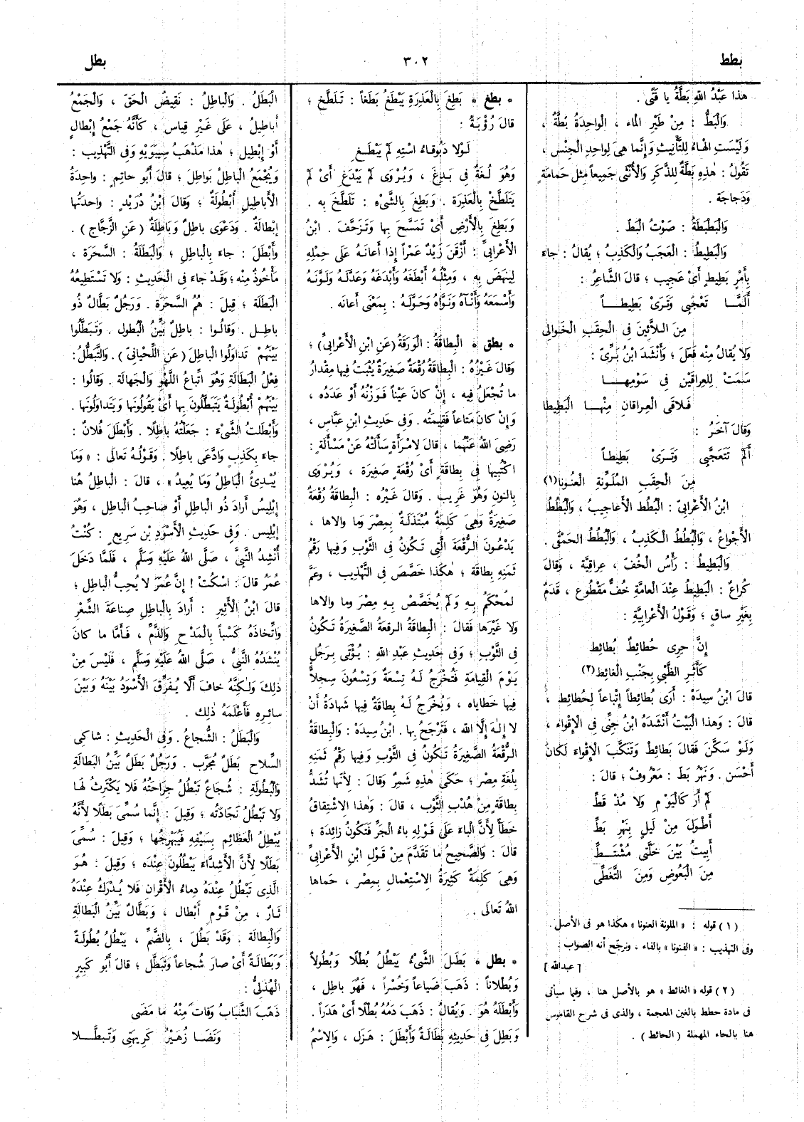 ( بطل ) بَطَل الشيءُ يَبْطُل بُطْلاً وبُطُولاً وبُطْلاناً ذهب ضيَاعاً وخُسْراً فهو باطل وأَبْطَله هو ويقال ذهب دَمُه بُطْلاً أَي هَدَراً وبَطِل في حديثه بَطَالة وأَبطل هَزَل والاسم البَطل والباطل نقيض الحق والجمع أَباطيل على غير قياس كأَنه جمع إِبْطال أَو إِبْطِيل هذا مذهب سيبويه وفي التهذيب ويجمع الباطل بواطل قال أَبو حاتم واحدة الأَباطيل أُبْطُولة وقال ابن دريد واحدتها إِبْطالة ودَعْوى باطِلٌ وبَاطِلة عن الزجاج وأَبْطَل جاء بالباطل والبَطَلة السَّحَرة مأْخوذ منه وقد جاء في الحديث ولا تستطيعه البَصَلة قيل هم السَّحَرة ورجل بَطَّال ذو باطل وقالوا باطل بَيِّن البُطُول وتَبَطَّلوا بينهم تداولوا الباطل عن اللحياني والتَّبَطُّل فعل البَطَالة وهو اتباع اللهو والجَهالة وقالوا بينهم أُبْطُولة يَتَبَطَّلون بها أَي يقولونها ويتداولونها وأَبْطَلت الشيءَ جعلته باطلاً وأَبْطل فلان جاء بكذب وادَّعى باطلاً وقوله تعالى وما يبدئ الباطل وما يعيد قال الباطل هنا إِبليس أَراد ذو الباطل أَو صاحب الباطل وهو إِبليس وفي حديث الأَسود بن سَرِيع كنت أُنشد النبي صلى الله عليه وسلم فلما دخل عمر قال اسكت إِن عمر لا يحبُّ الباطل قال ابن الأَثير أَراد بالباطل صِناعَة الشعر واتخاذَه كَسْباً بالمدح والذم فأَما ما كان يُنْشَدُه النبيُّ صلى الله عليه وسلم فليس من ذلك ولكنه خاف أَن لا يفرق الأَسود بينه وبين سائره فأَعلمه ذلك والبَطَل الشجاع وفي الحديث شاكي السلاح بَطَل مُجَرَّب ورجل بَطَل بَيِّن البَطالة والبُطولة شُجَاع تَبْطُل جِرَاحته فلا يكتَرِثُ لها ولا تَبْطُل نَجَادته وقيل إِنما سُمّي بَطَلاً لأَنه يُبْطِل العظائم بسَيْفه فيُبَهْرجُها وقيل سمي بَطَلاً لأَن الأَشدّاءِ يَبْطُلُون عنده وقيل هو الذي تبطل عنده دماء الأَقران فلا يُدْرَك عنده ثَأْر من قوم أَبْطال وبَطَّالٌ بَيِّن البَطالة والبِطالة وقد بَطُل بالضم يَبْطُل بُطولة وبَطالة أَي صار شجاعاً وتَبَطَّل قال أَبو كبير الهذلي ذهَبَ الشَّبَابُ وفات منه ما مَضَى ونَضَا زُهَير كَرِيهَتِي وتَبطّلا