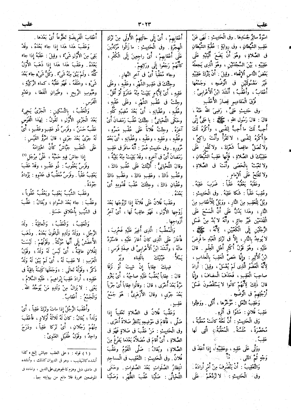 اسودَّ سائرُ جَسَدها وفي الحديث نَهَى عن عَقِبِ الشيطانِ وفي رواية عُقْبةِ الشيطانِ في الصلاة وهو أَن يَضَعَ أَلْيَتَيْه على عَقِبَيْه بين السجدتين وهو الذي يجعله بعض الناس الإِقْعاءَ وقيل أَن يَترُكَ عَقِبَيْه غيرَ مَغْسُولَين في الوُضوءِ وجمعُها أَعْقابٌ وأَعْقُبٌ أَنشد ابن الأَعرابي فُرْقَ المَقاديمِ قِصارَ الأَعْقُبِ [ ص 612 ] وفي حديث عليّ رضي اللّه عنه قال قال رسول اللّه صلى اللّه عليه وسلم يا عليّ إِني أُحِبُّ لكَ ما أُحِبُّ لنَفْسي وأَكْرَه لك ما أَكره لنفسي لا تَقْرَأْ وأَنت راكعٌ ولا تُصَلِّ عاقِصاً شَعْرَك ولا تُقْعِ على عَقِبَيْك في الصلاة فإِنها عَقِبُ الشيطان ولا تَعْبَثْ بالحَصَى وأَنت في الصلاة ولا تَفْتَحْ على الإِمام وعَقَبَه يَعْقُبُه عَقْباً ضَرَب عَقِبَه وعُقِبَ عَقْباً شَكا عَقِبَه وفي الحديث وَيْلٌ للعَقِبِ من النار ووَيْلٌ للأَعْقابِ من النار وهذا يَدُلُّ على أَن المَسْحَ على القَدَمَيْن غيرُ جائز وأَنه لا بد من غَسْلِ الرِّجْلَيْن إِلى الكَعْبين لأَنه صلى اللّه عليه وسلم لا يُوعِدُ بالنار إِلا في تَرْكِ العَبْد ما فُرِضَ عليه وهو قَوْلُ أَكثرِ أَهلِ العلم قال ابن الأَثير وإِنما خَصَّ العَقِبَ بالعذاب لأَنه العُضْوُ الذي لم يُغْسَلْ وقيل أَراد صاحبَ العَقِب فحذف المضاف وإِنما قال ذلك لأَنهم كانوا لا يَسْتَقْصُون غَسْلَ أَرجلهم في الوضوءِ وعَقِبُ النَّعْلِ مُؤَخَّرُها أُنْثى ووَطِئُوا عَقِبَ فلانٍ مَشَوْا في أَثَرِه وفي الحديث أَن نَعْلَه كانتْ مُعَقَّبةً مُخَصَّرةً مُلَسَّنةً المُعَقَّبةُ التي لها عَقِبٌ ووَلَّى على عَقِبِه وعَقِبَيه إِذا أَخَذَ في وجْهٍ ثم انثَنَى والتَّعْقِيبُ أَن يَنْصَرِفَ من أَمْرٍ أَراده وفي الحديث لا تَرُدَّهم على أَعْقابِهِم أَي إِلى حالتهم الأُولى من تَرْكِ الهِجْرَةِ وفي الحديث ما زالُوا مُرْتَدِّين على أَعقابهم أَي راجعين إِلى الكفر كأَنهم رجعوا إِلى ورائهم وجاءَ مُعَقِّباً أَي في آخرِ النهارِ وجِئْتُكَ في عَقِبِ الشهر وعَقْبِه وعلى عَقِبِه أَي لأَيامٍ بَقِيَتْ منه عشرةٍ أَو أَقَلَّ وجِئتُ في عُقْبِ الشهرِ وعلى عُقْبِه وعُقُبِه وعُقْبانِه أَي بعد مُضِيِّه كلِّه وحكى اللحياني جِئتُك عُقُبَ رمضانَ أَي آخِرَه وجِئْتُ فلاناً على عَقْبِ مَمَرِّه وعُقُبه وعَقِبِه وعَقْبِه وعُقْبانِه أَي بعد مُرورِه وفي حديث عمر أَنه سافر في عَقِب رمضانَ أَي في آخره وقد بَقِيَتْ منه بقية وقال اللحياني أَتَيْتُك على عُقُبِ ذاك وعُقْبِ ذاك وعَقِبِ ذاكَ وعَقْبِ ذاكَ وعُقْبانِ ذاك وجِئتُكَ عُقْبَ قُدُومِه أَي بعده وعَقَبَ فلانٌ على فلانة إِذا تزوّجها بعد زوجها الأَوَّل فهو عاقِبٌ لها أَي آخِرُ أَزواجها والمُعَقِّبُ الذي أُغِيرَ عليه فَحُرِب فأَغارَ على الذي كان أَغارَ عليه فاسْتَرَدَّ مالَه وأَنشد ابن الأَعرابي في صفة فرس